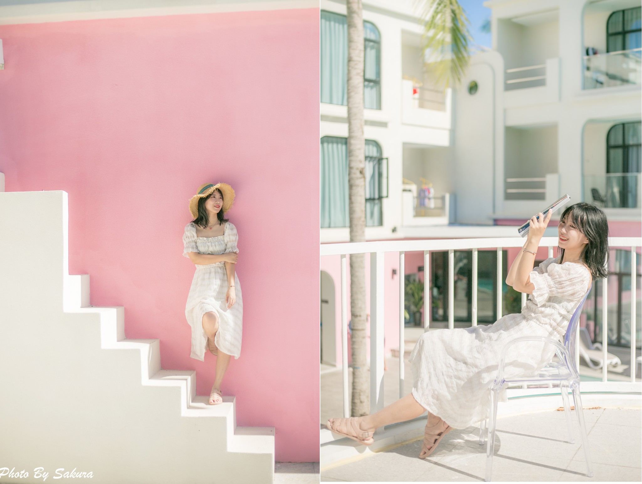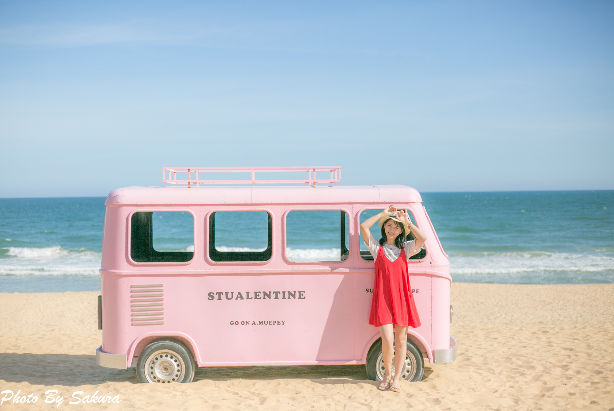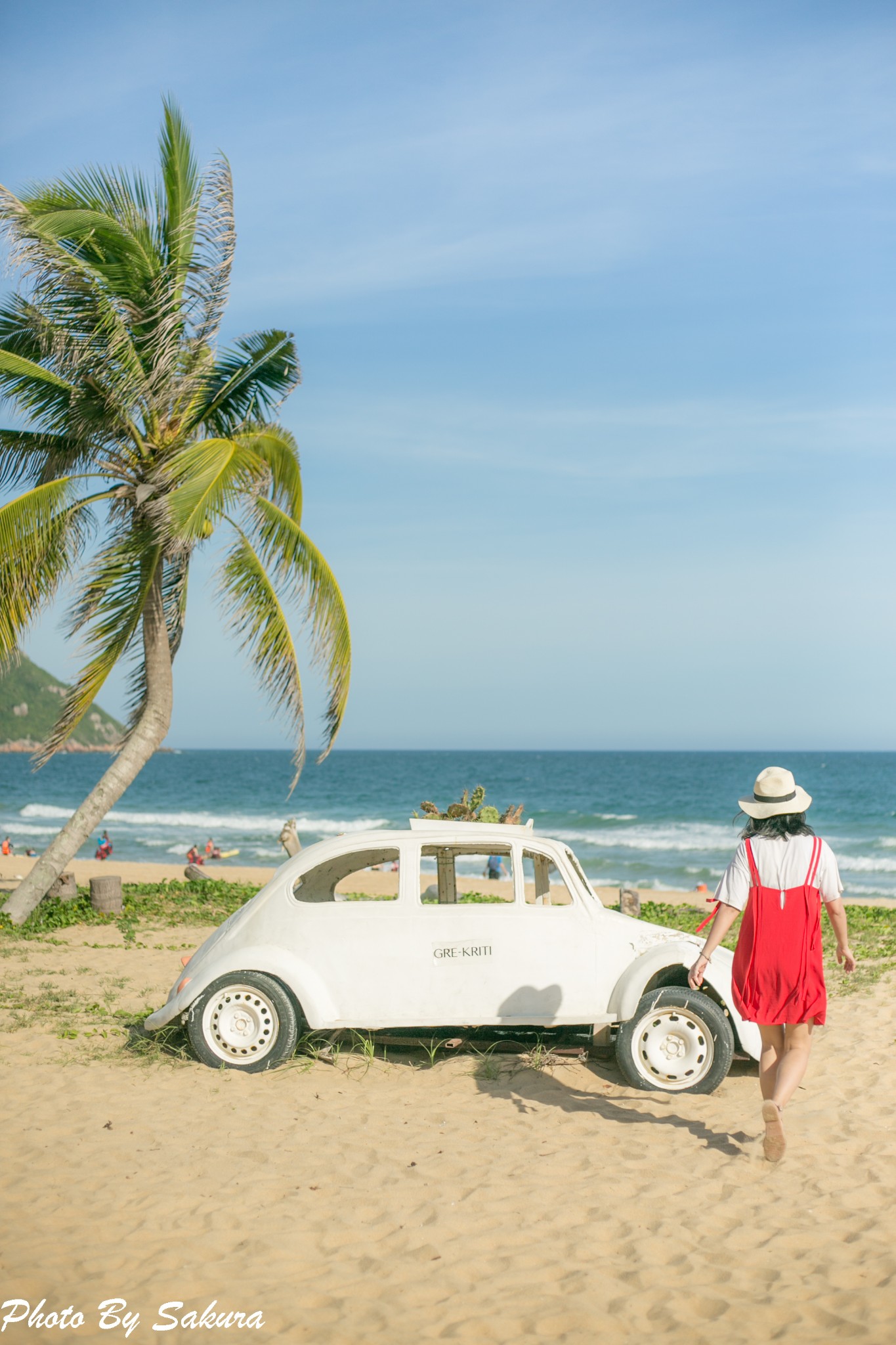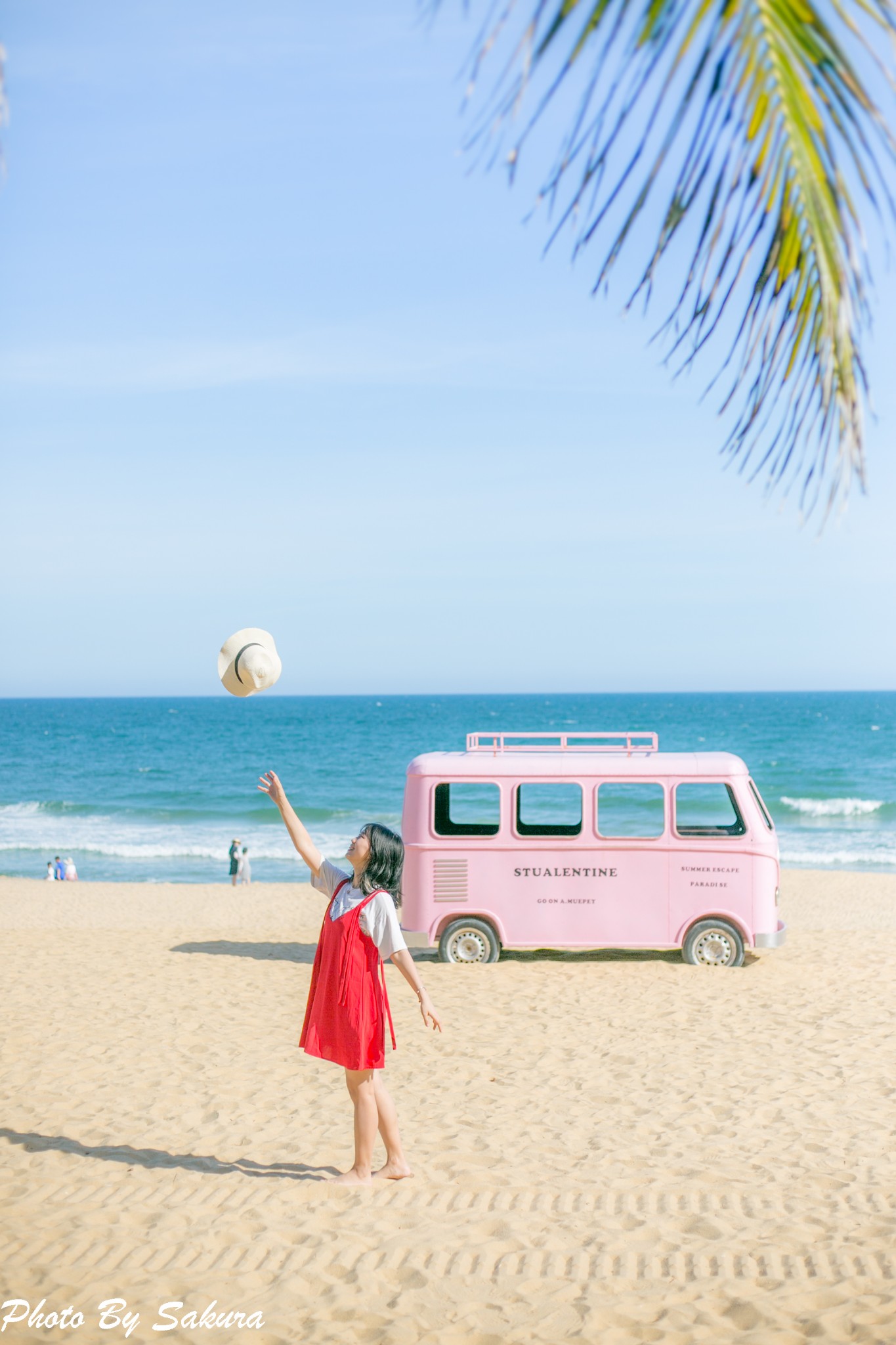 沙滩超多拍照的道具——粉红车、大秋千、巴厘同款鸟巢、小白车、路牌等。