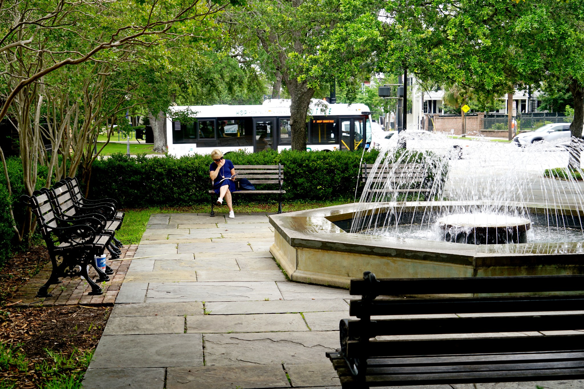 公园一角,一女士静静地坐在那里看书,显得那么的悠然自得。