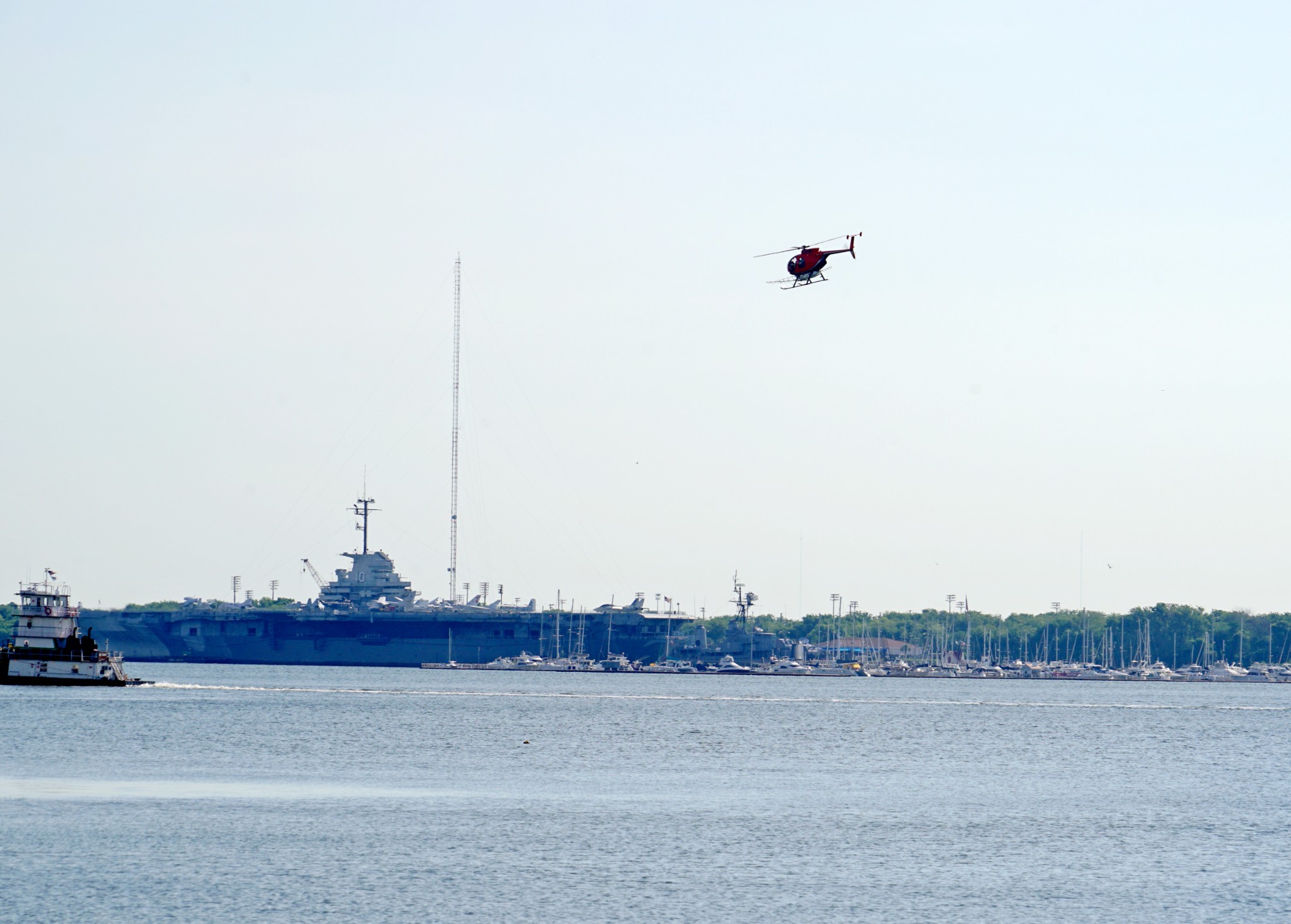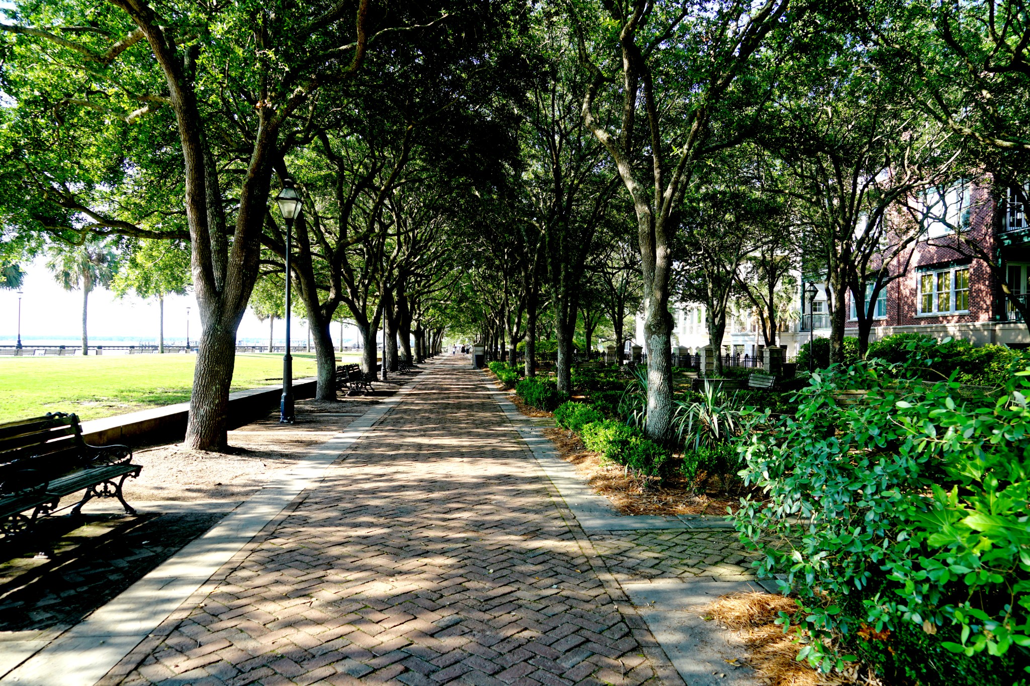 海滨公园东临海湾,与约克城号航母基地隔河相望。早上,公园内很幽静,一条林荫道空寂无人。