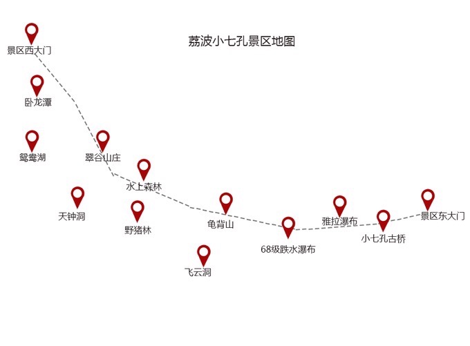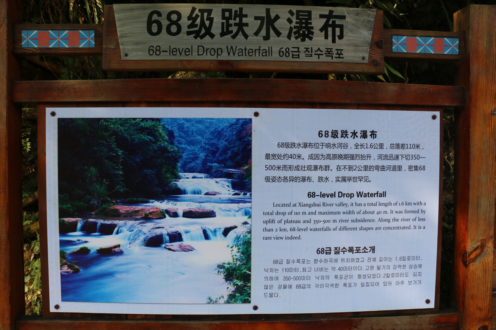 68级跌水瀑布--全长1.6公里,总落差110米,高高低低的河床,错落着68级瀑布和跌水。如此众多而密集的瀑布、跌水,全国罕见。层层叠叠的瀑布,淙淙哗哗倾泻而下,或倾珠撒玉,推雪拥云。