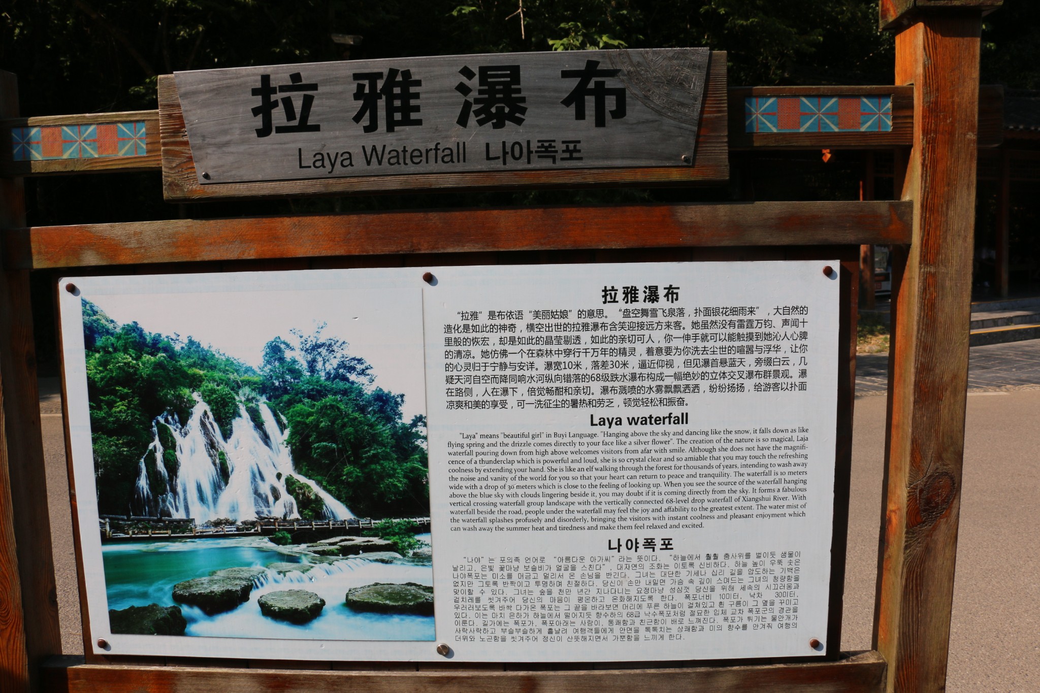 过小七孔桥,曲行百米许,即见拉雅瀑布。瀑宽10米,落差30米,幽静丛林水、瀑、桥,逼近仰视,但见瀑首悬蓝天,旁缀白云,几疑天河自空而降。瀑势如山倒,吼声状雷,颇为壮观。瀑布腾空喷泻,横向坠落,同响水河纵向错落的68级跌水瀑布构成一幅绝妙的立体交叉瀑布群景观。瀑在路侧,人在瀑下,倍觉畅酣和亲切。瀑布溅喷的水雾飘飘洒洒,纷纷扬扬,给游客以扑面凉爽和美的享受,可一洗征尘的暑热和劳乏,顿觉轻松和振奋。