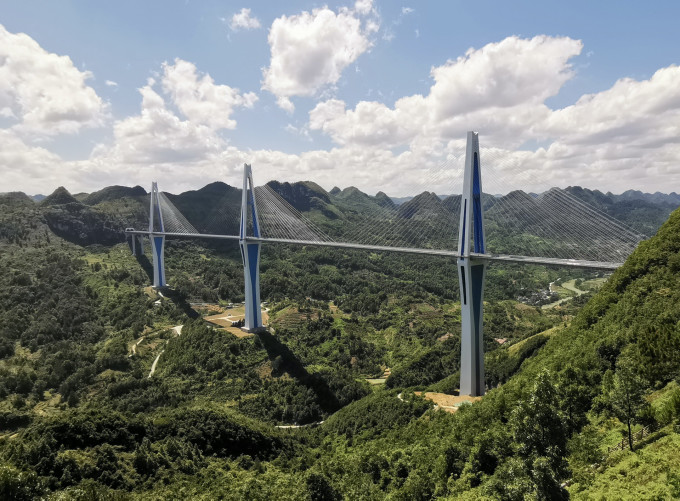 平塘特大桥全长2135米,其中位于中间的16号桥塔净高332米,相当于110层楼高,是世界最高钢筋混凝土桥塔。