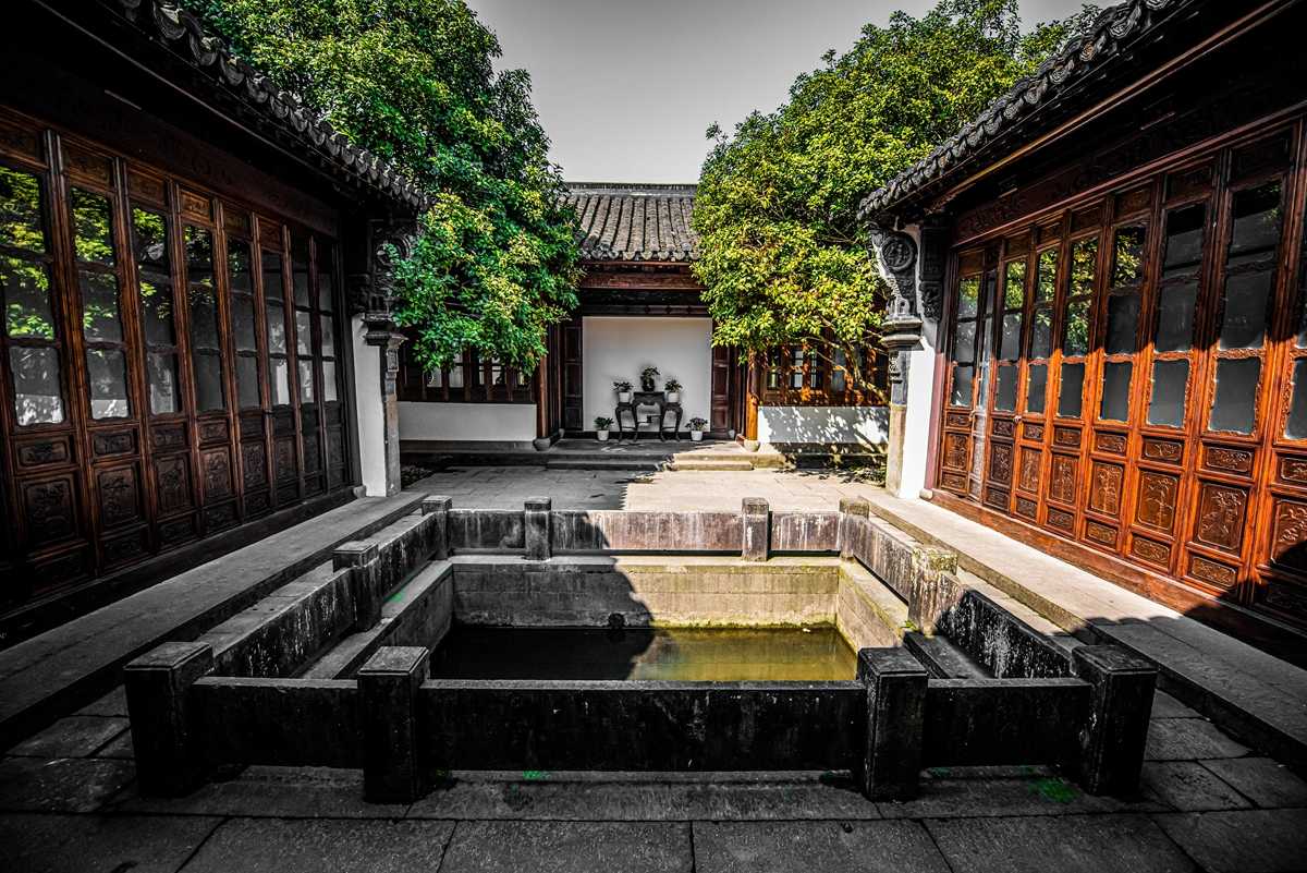 出正厅,是一处颇具浙江民居特色的四合院,左右厢房和后堂构成一小院,院中清一色的石板铺装,中间是一个用石板栏杆围成的方池。