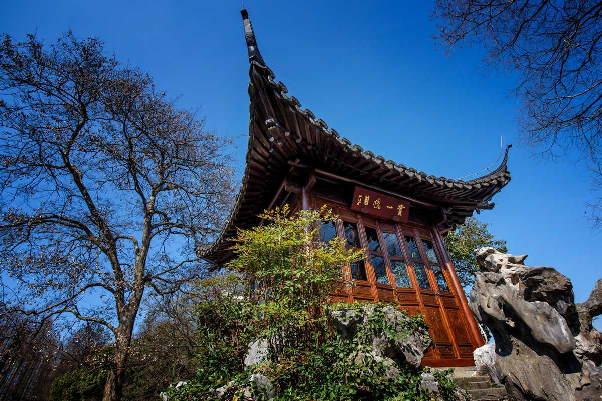 假山上的“赏心悦目”亭,也是一处茶室,郭庄的内部水系同西湖相通,通水之处便在赏心悦目亭之下。