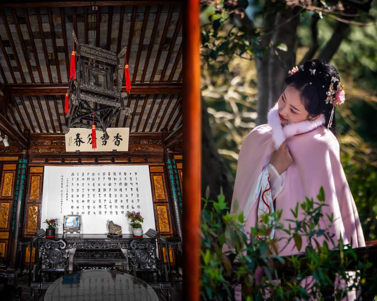 正厅,上悬匾额“香雪分春”。意思是雪上带有花草香的气息,意味着春天将要来了。(图右是园内正在拍写真的妹子)