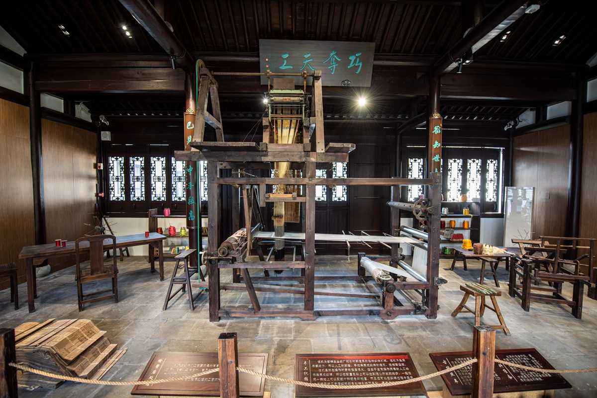 下图为都锦生初创时期使用的织锦机械,采用人工脚踏、手拉来完成织锦的提花、投梭等运动,在配置色彩上可以达到随心所欲的地步。