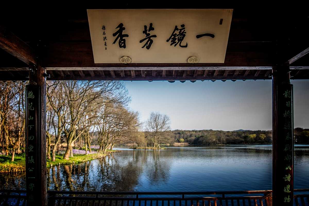 茅家埠的亭也不少,一镜芳香亭宛如一幅图画,边上还有个“黛色参天”亭,据说一年四季景致不同,很多人梦想能拍到一张其雪景的照片,可惜此值冬春之交,既无白雪,也无绿意,只有一个孤单的空亭,不上照片也罢。