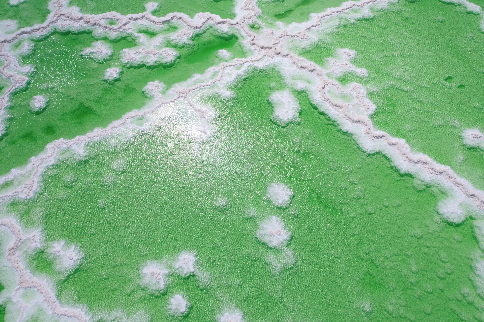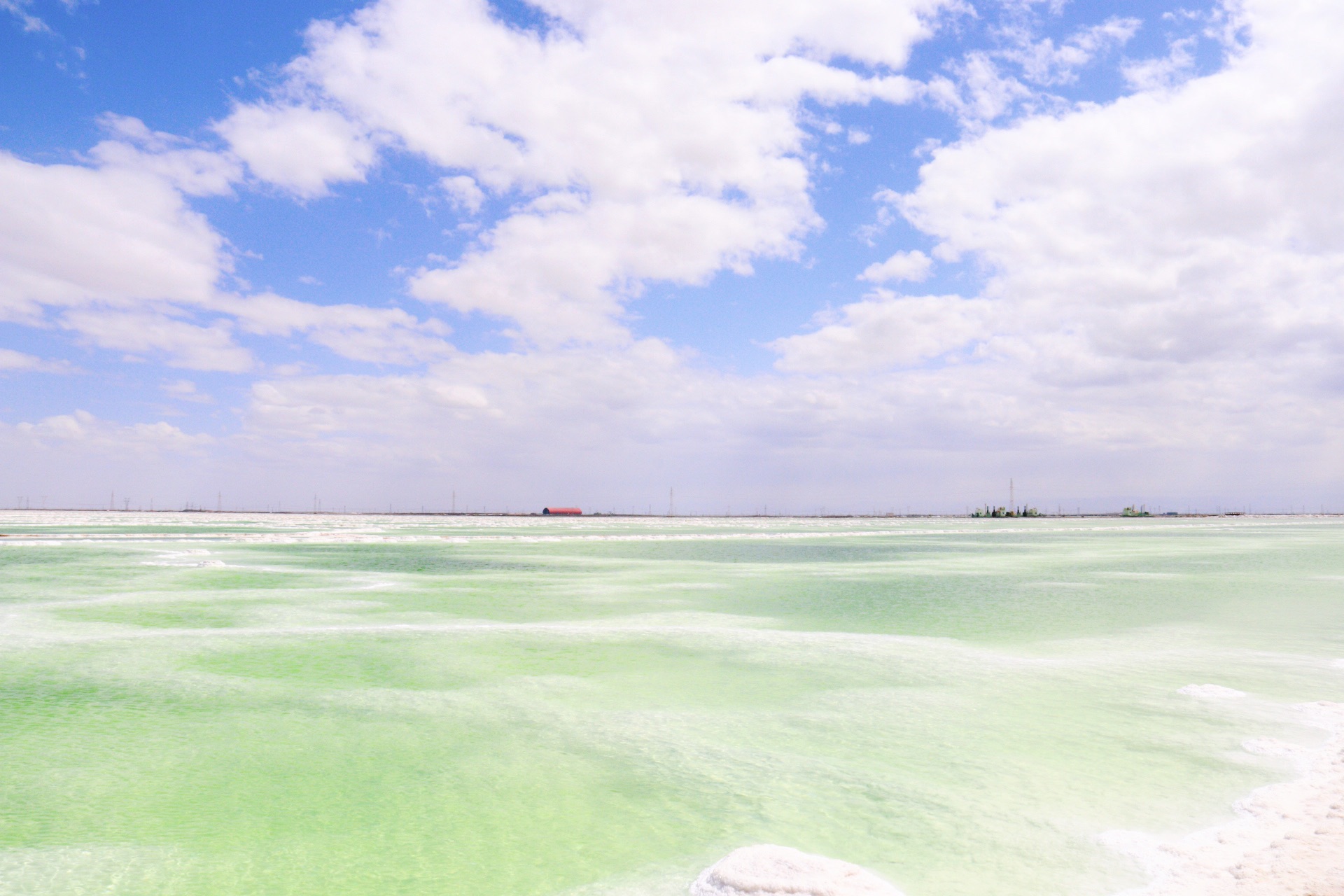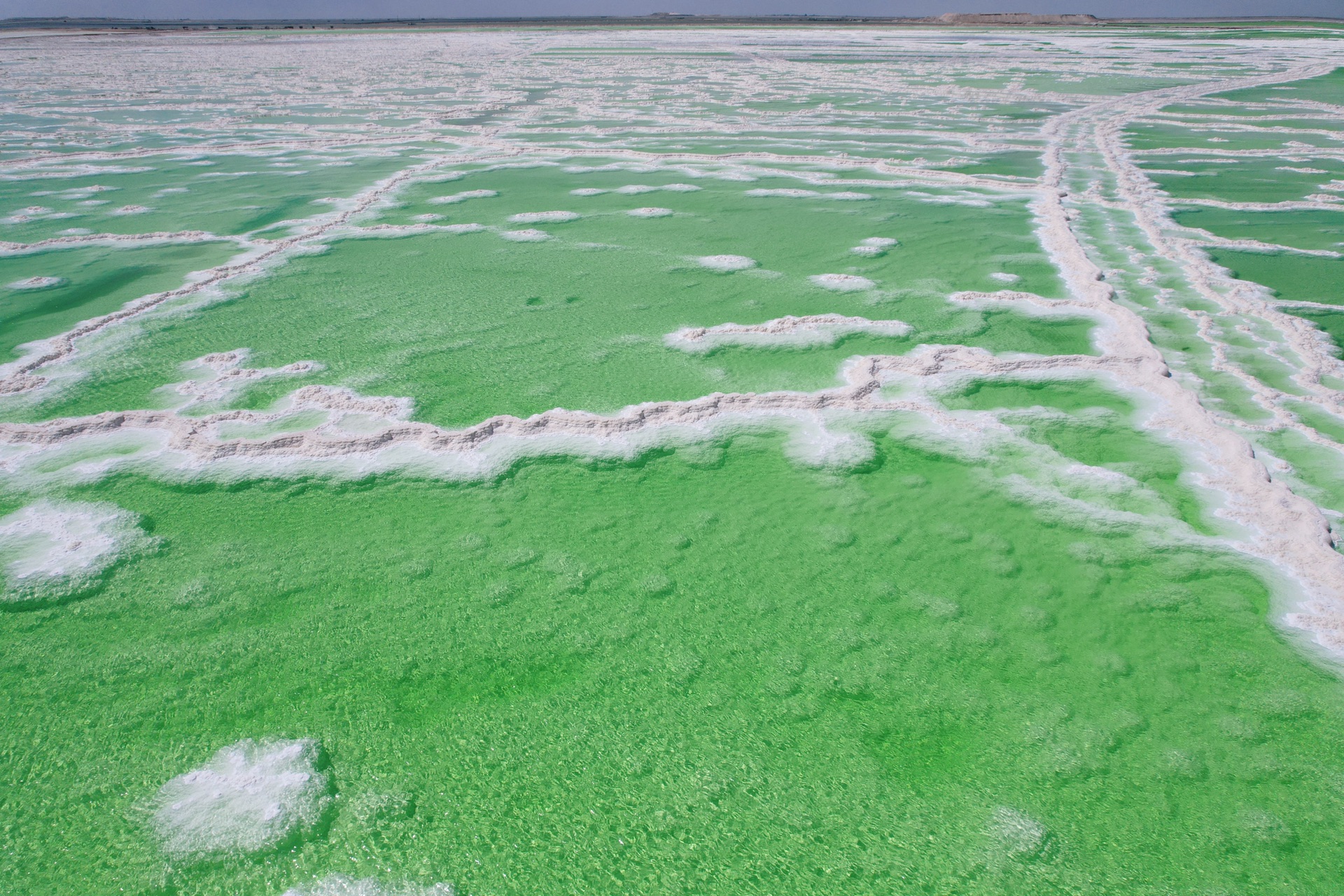 盐湖的水是浅绿色的。其实在地面看察尔汗盐湖已经很漂亮了,在无人机角度更是震撼。