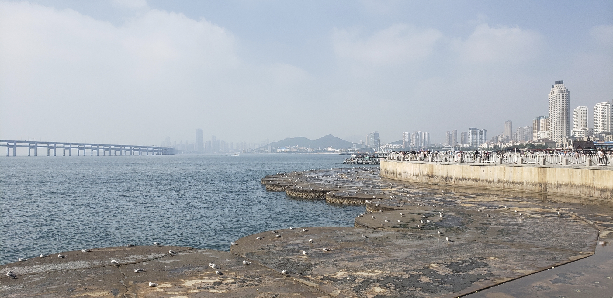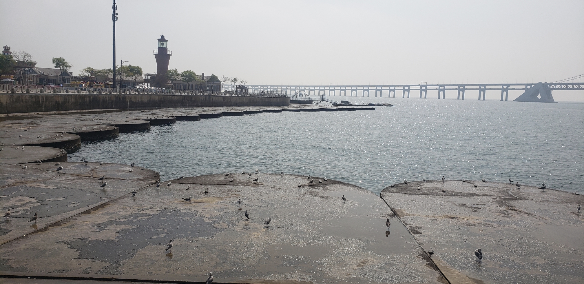 第一站:星海广场。大连打车不贵。各景点打车也就10几块左右。我是从酒店打车过来的,10元。广场上很多鸽子和海鸥,看着一望无际的大海和自由自在的海鸥,很惬意。想拍照喂海鸥的自己可以准备火腿肠,广场上卖一包10块有点贵,毕竟我都买得10根火腿肠了。哈哈。最好的方式是当海鸥飞过眼前,撕一小例火腿肠扔在空中,它们会用它们的敏锐和神速去抢食,抢不过的会打架,速度倒挺快。不用担心火腿掉地上,因为没到地上它们已经吃进嘴里了。推荐喂海鸥,我自己都能跟它们玩的不亦乐乎。