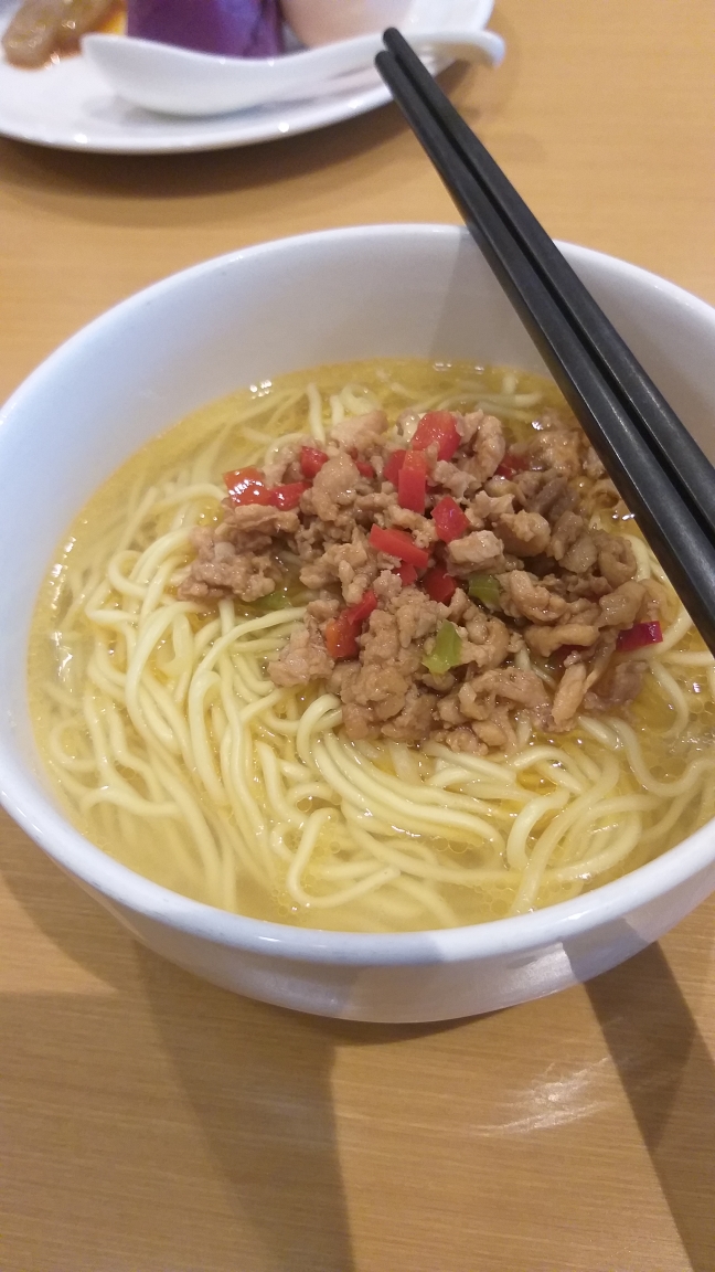 在半山酒店宴会厅左边的角落有一个下粉面的地方,我要了一小碗肉丝面,有一些肉丝,里面还有一点点红色和青色的辣椒,不怎么辣,辣椒主要是增加鲜明的色泽,增加食欲。