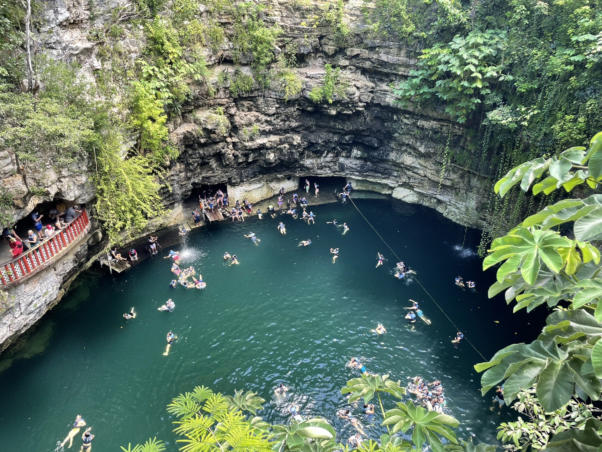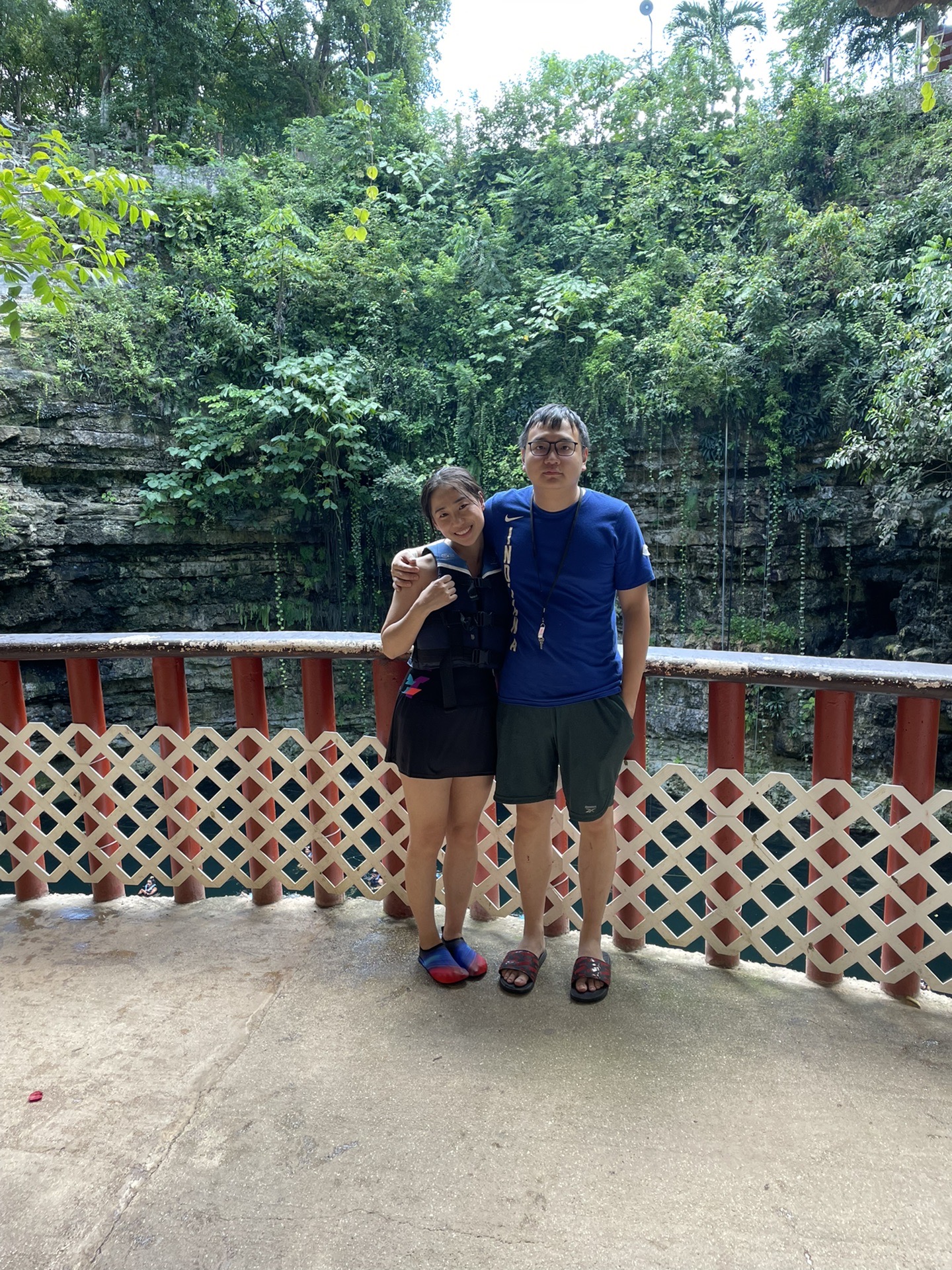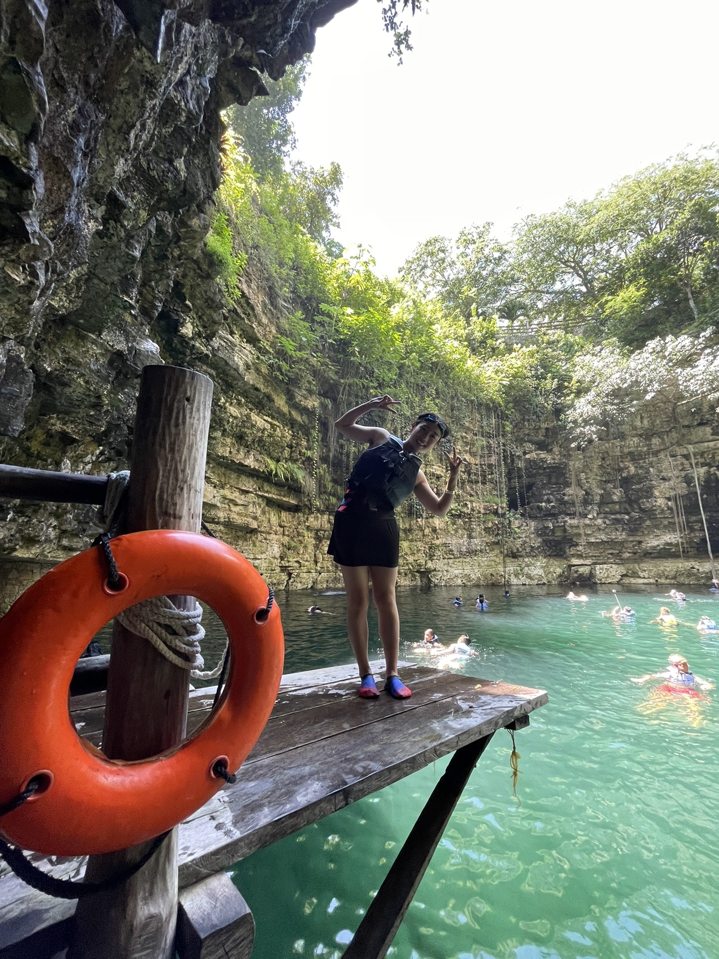 第二日的安排是天坑与奇琴伊察,早上在导游的指示下乘坐大巴前往第一站:天坑,大约2.5小时车程。天坑因为是自然景观,不允许涂防晒霜,所以得先简单沐浴后再下水,在去的路上,导游会推荐购买18美金/人的Diamond Package,包含Locker、救生衣、游泳镜、毛巾以及免费饮品。因为ZDD不会水,所以我们就只买了一份,到达后导游会给购买的人套上特别的手环以作区分。
