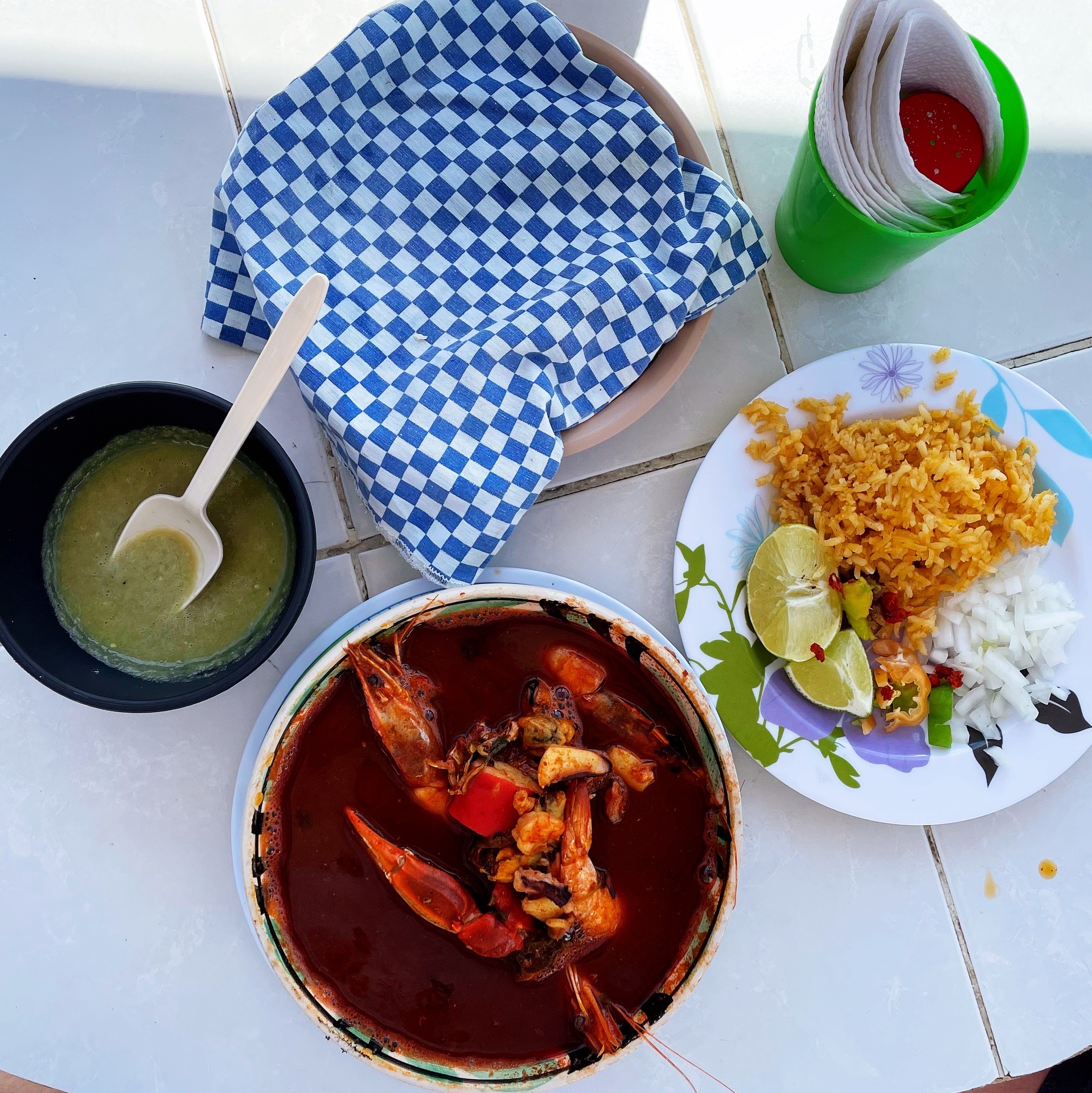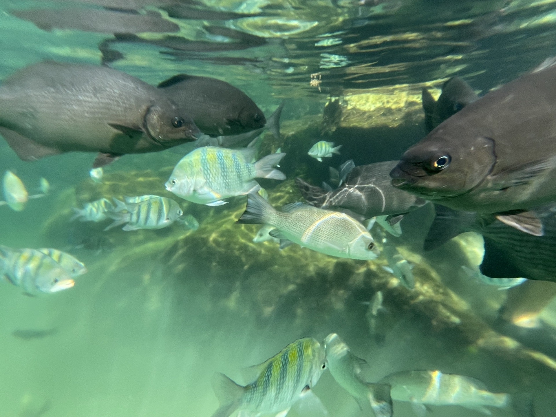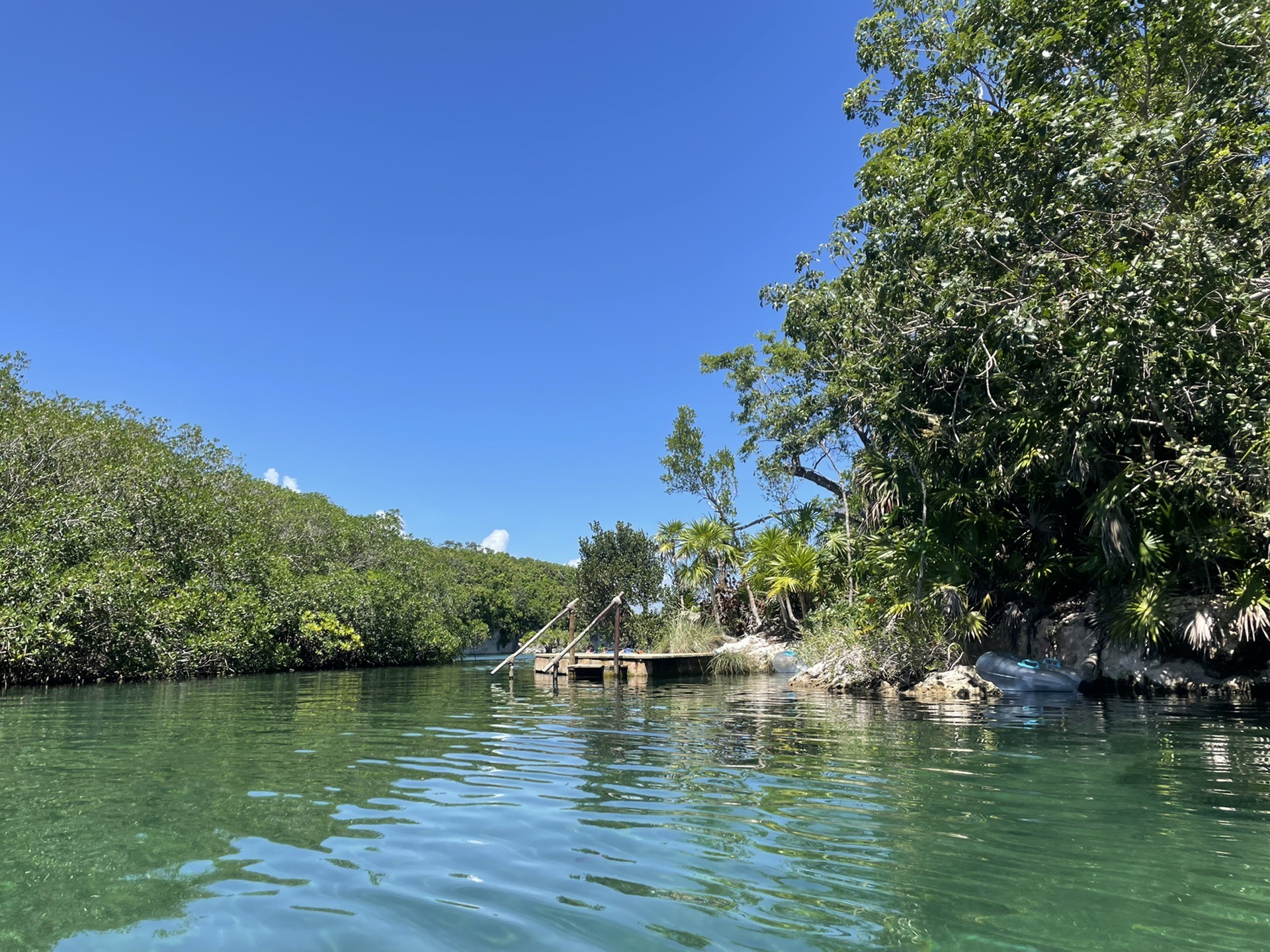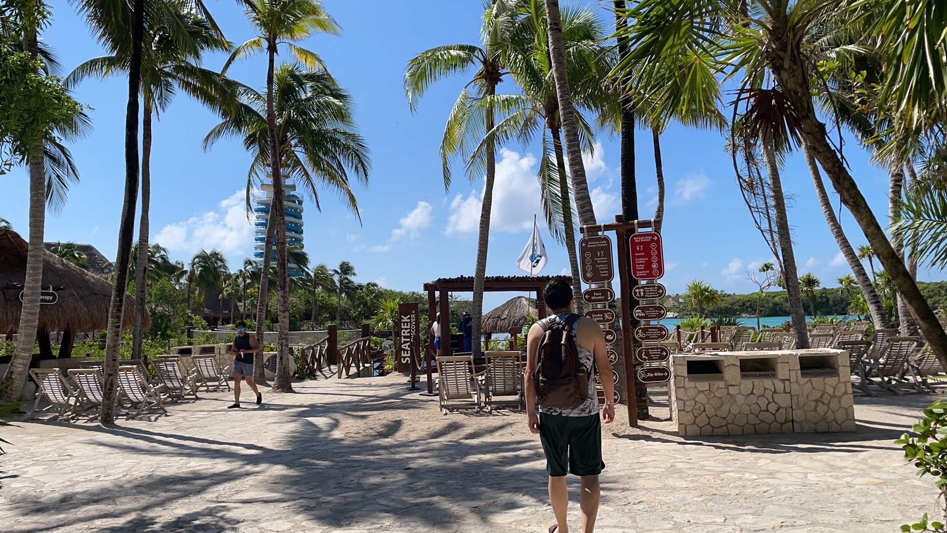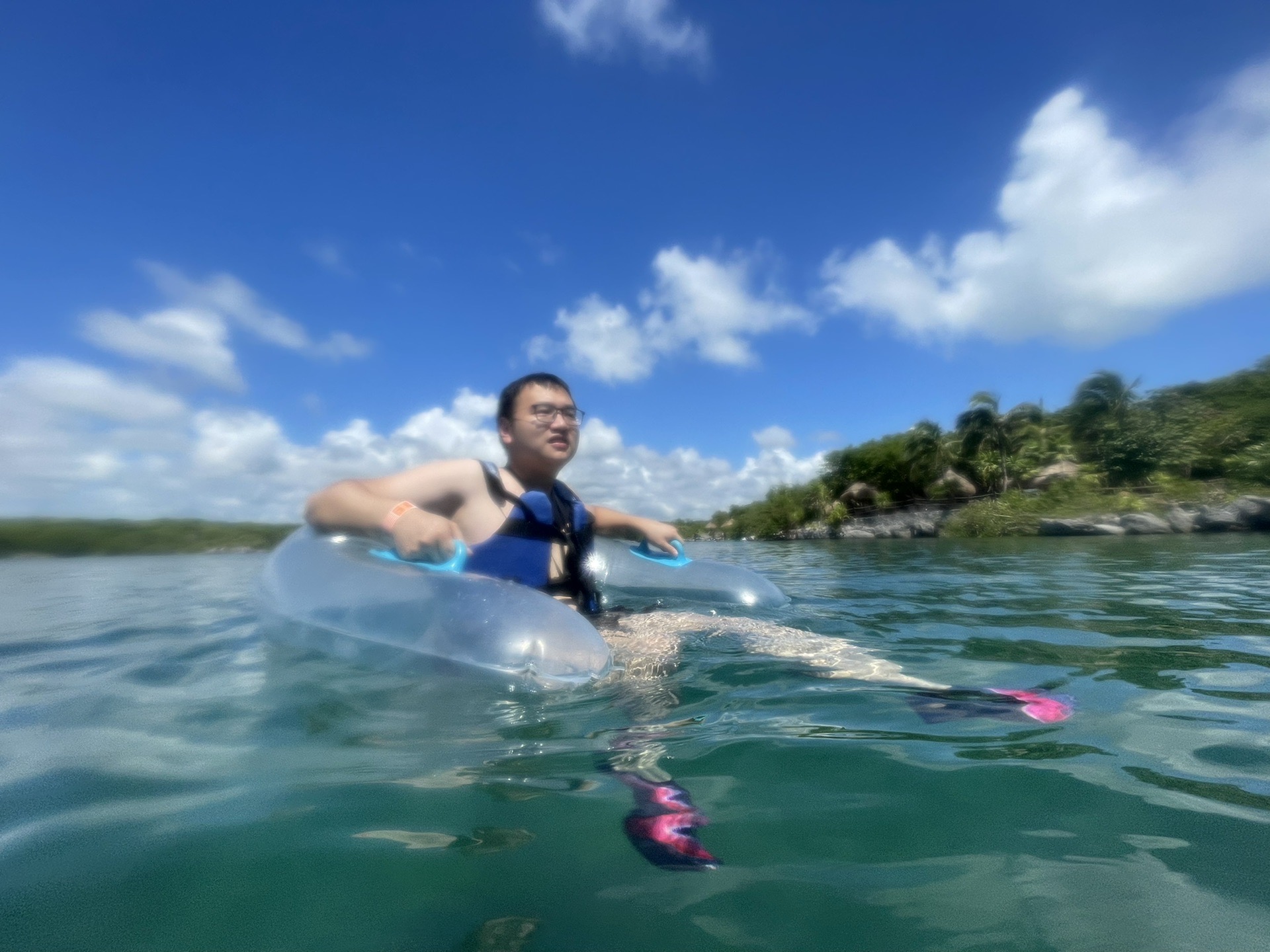 Xelha公园是临海的,但是整个公园修建在海湾里面,所以没有风浪,特别平静。除了水滑梯之外,所有的入水项目都需要穿好救生衣。浮潜设备、毛巾、脚蹼、吃喝都是全部免费,也有一些付费项目,比如与海豚互动、鱼疗等。之前在网上看了很多攻略,要怎么玩怎么吃,一进去全忘了打算先吃一顿自助再下水嗨,随便挑了一个餐厅(好像是餐厅E,2层能看海,不过二楼没开放),疫情期间属于半自助,需要工作人员给你盛,自己不能动手,不过这样也挺好哒,而且每个服务员都很热情,刚进去的时候还没存包身上还有钱,走之前还给了服务员小费。接着就去服务员推荐的Yellow Station存了包,在一路往里走。想嗨的心情太激动了以至于看的攻略全忘了,工作人员建议我先从River玩起也忘了,然后直接就从餐厅附近开玩,zdd穿了救生衣还是不敢下水,又找了游泳圈给他,又穿救生衣又游泳圈,他竟然也敢往中心漂了,在我一路人力助推器的动力下,我们游到中心又返回到岸边,继续下一个点。
