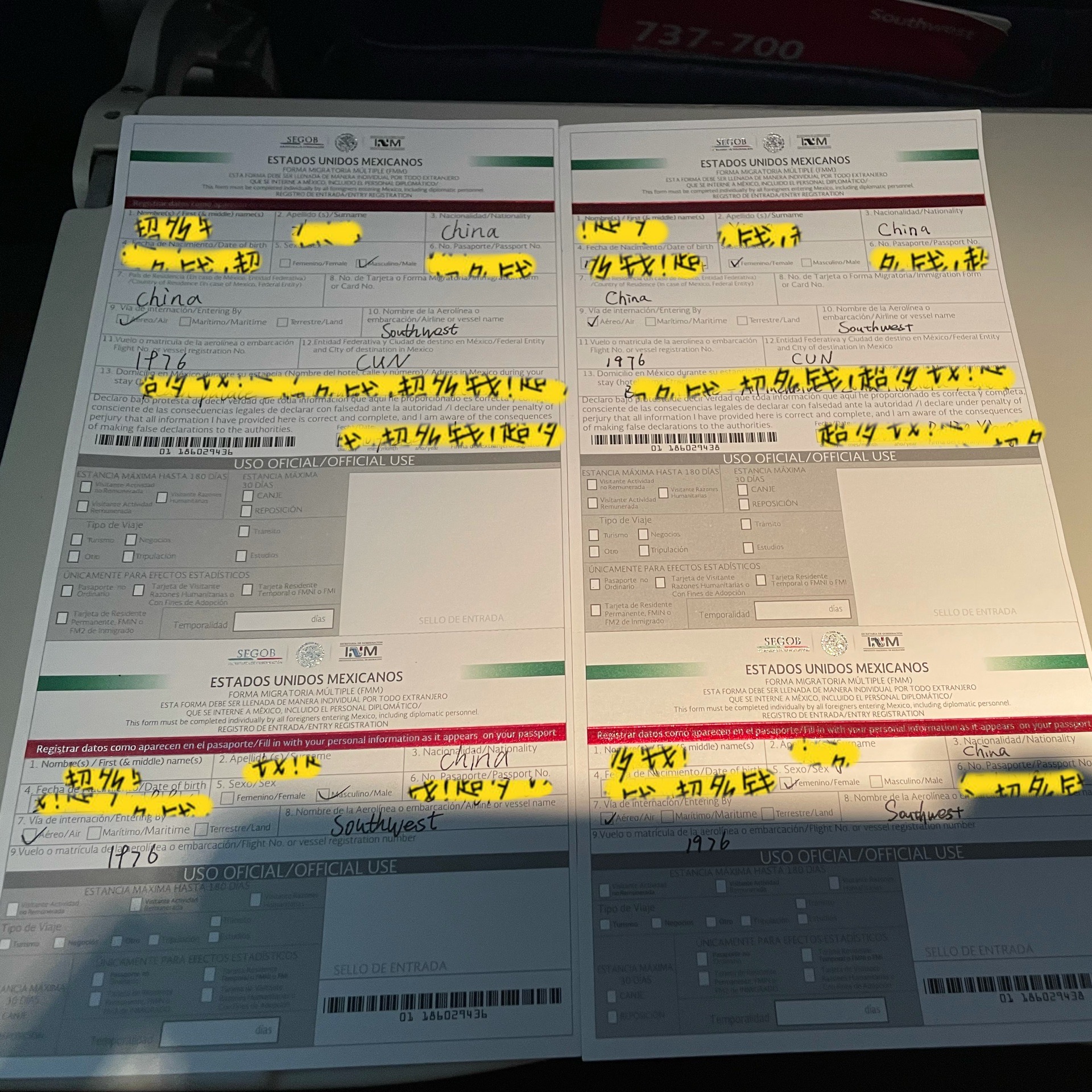 美国搬砖间隙,休假一周。西南航空从印第安纳波利斯有直飞坎昆的航班,大约3.5小时的航程。在飞机上机组会发海关卡给到每位乘客,分上下两联,入关后海关人员回收走上联,注意下联须自己保存好,出关时需要交回。