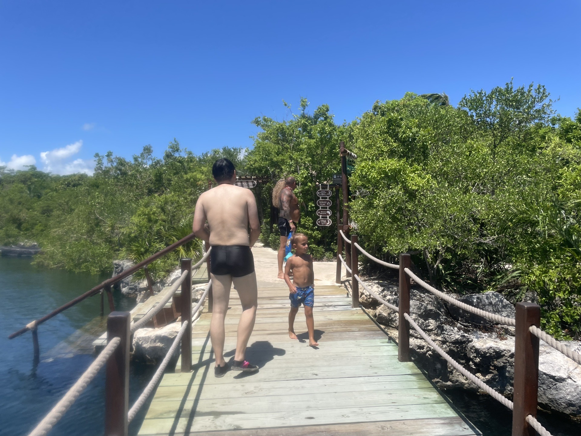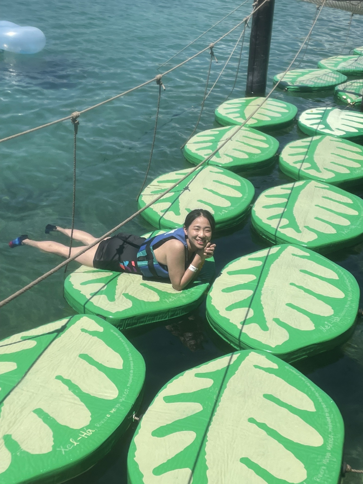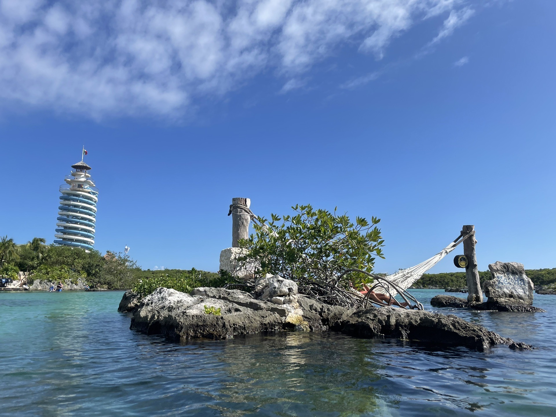 之后继续走就会到Xelha的大标志处,合照后过浮桥就回到了餐厅区域,又猛吃一顿,吃完饭后我就开始纠结要不要去水滑梯,因为那个对我来说实在是有点高,我想肯定速度很快,我特别怕失重的感觉,zdd一直鼓励我,我说那我去吧,想想不去票价感觉要亏一半,我本来想让zdd在下面看着我冲下来,结果门口的staff说不玩的人不能进去围观,而且要把水鞋和手机全部存了,只能带个钥匙进去。我只能自己勇敢的向前冲,进去后的每一步我都很紧张,走到上面先看了看风景,但是心里还是特别紧张,一直想我要不要退回去呢?后来还是鼓足勇气,走向了白色的滑梯(一共四根,白色并排2根,蓝色并排两根)。我一进去就知道了工作人员说的just a little fast对于我来说真的不是一点点,还是挺快的,转到后面几圈脑袋已经晕了,然后猛的最后一下着实有失重的感觉,然后就一个猛子扎进水池里,接着水池里的工作人员就把我扶起来问我你还好吗?那时候头还处于眩晕状态,鼻子也进水了,还是连忙回答我还OK。