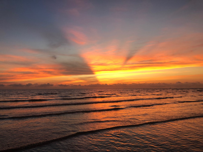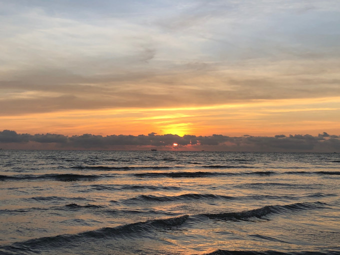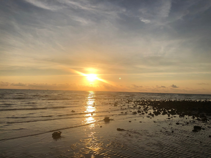 5点半左右出发的去看日出,地点是在贝壳沙滩,从家里出发骑电动车差不多10分钟左右就到了,整个海滩人很少,不超过20个人吧。但是那天运气差了点,因为云层比较厚的缘故,所以并不是太阳一出来就看到了。后来还看到有个岛民在赶海,带着桶子和工具挖很小的牡蛎或者生蚝,同时捡点螺丝。石头下面也有很多小螃蟹,但是岛民好像完全没兴趣。我去搞了个水瓶来然后抓到了5个,但是这个过程中付出了极大的代价( 3-4个手指被割了口子),回家后才发现的。