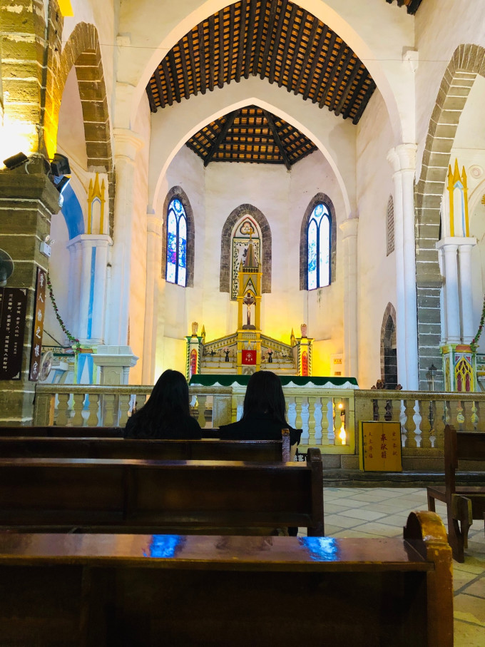 这天的上午可以忽略了,哈哈。因为本想着来个环岛,也确实环了一圈,但是整个环岛的路线是几乎看不到海的,所以真的就是骑电动车骑了个寂寞。于是乎才决定到附近的天主教堂去看一眼,其实我一直对人文景观是没有兴趣的,但那天时间很尴尬,完全不知道去哪了。教堂我也不知道怎么去评论,反正我就花10分钟就看完了。不过如果有对这方面感兴趣的可以去看看,毕竟年份摆在那。但是路线不要直接百度天主教堂,因为会让你把电动车停在门口,然后走进去,这样要花蛮长时间的。直接搜梁小糖奶茶(教堂分店)就好了,这样可以从另一条路直接把电动车骑进去。可能也是缘分吧,在这无意中寻到了一家宝藏小店,叫:私奔岛屿小院,白天你可以去店里喝一杯手冲咖啡,晚上也可以一边喝着店里调的随心所欲(鸡尾酒),一边听老板弹着吉他唱民谣。这家店的故事后面再说,因为我连着来了2个晚上。