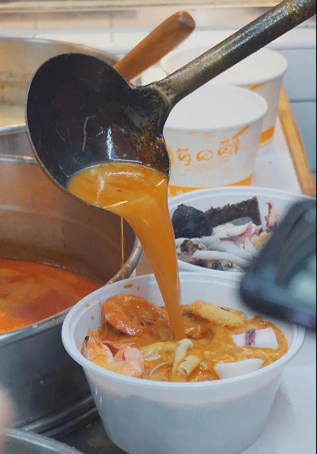 汤头浓醇,有花生酱和鱼虾的干香,碱水圆面劲道入味,加料选择丰富(各种海鲜/素食/猪杂/卤味),容易吃出大写的满足。