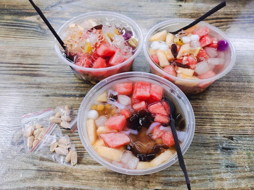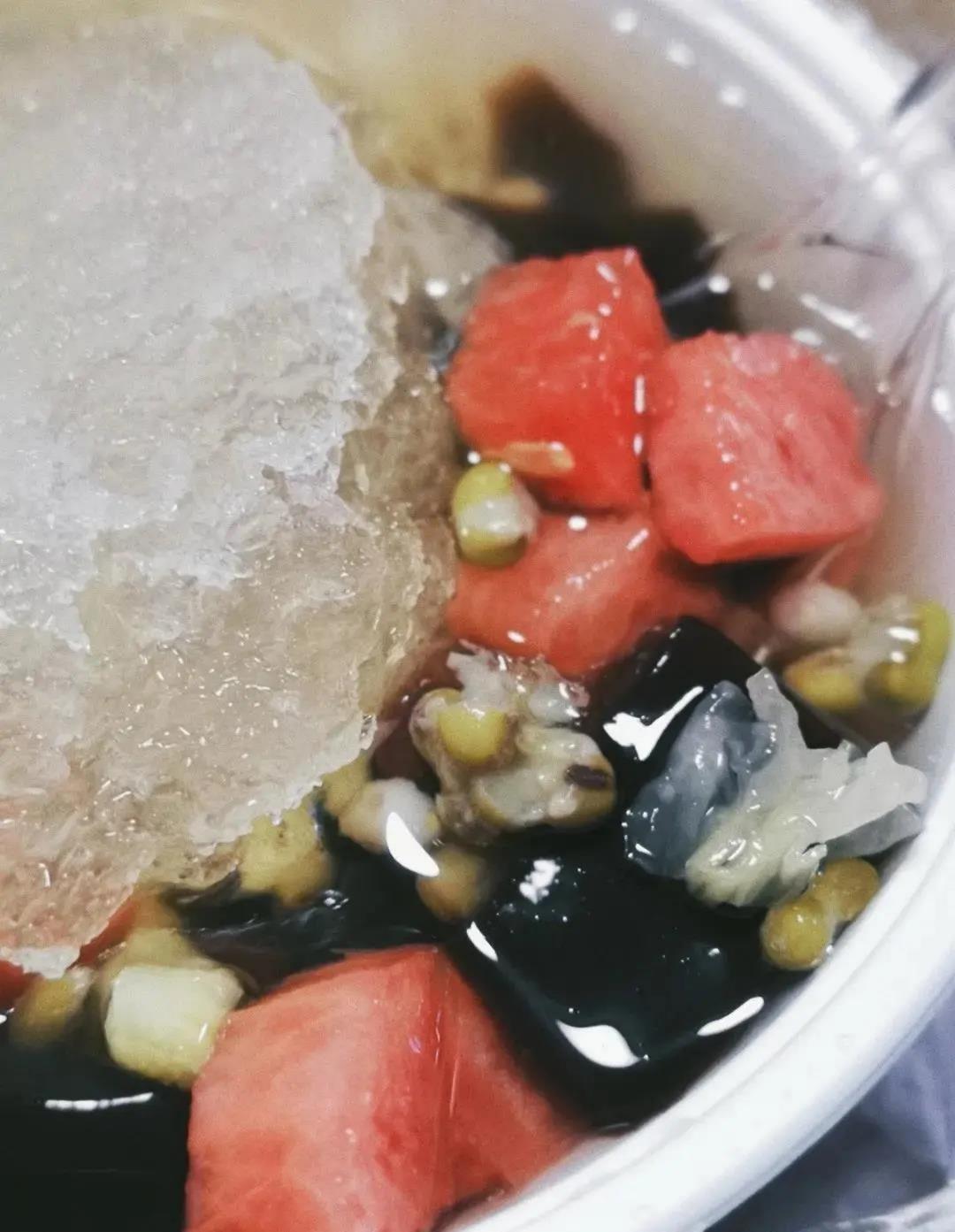 莲子、薏米、红豆、阿达子、丸子、银耳、石花、仙草、西瓜等配料,每样都会来一点,堆出了无以复加的满足。