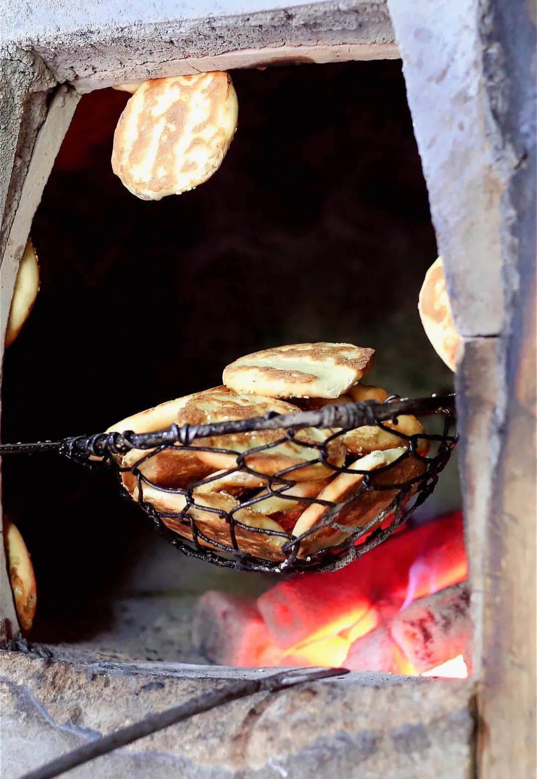 用面粉,加入适量楠草(碱水)和盐水,待面发透后,用手工揉细、制成饼截,再用木捶研成饼坯,坯中间戳一个小洞,若饼面有加葱或肉的,则戳两个洞,然后将饼坯贴在炉壁上,用炭火烤熟。