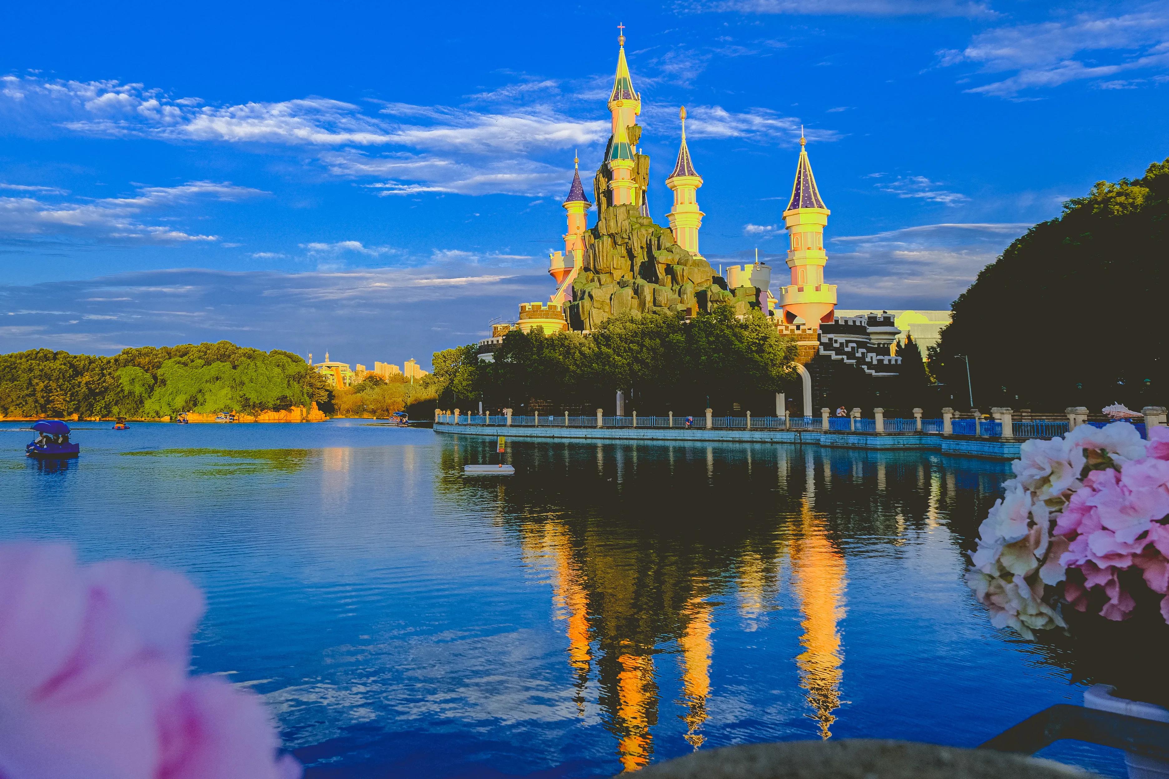 在方特梦幻王国,可以随处可见熊出没主题,卡通城堡梦幻闪光,夕阳的金色光芒照射在城堡之上,水中的影子让人目眩神迷。