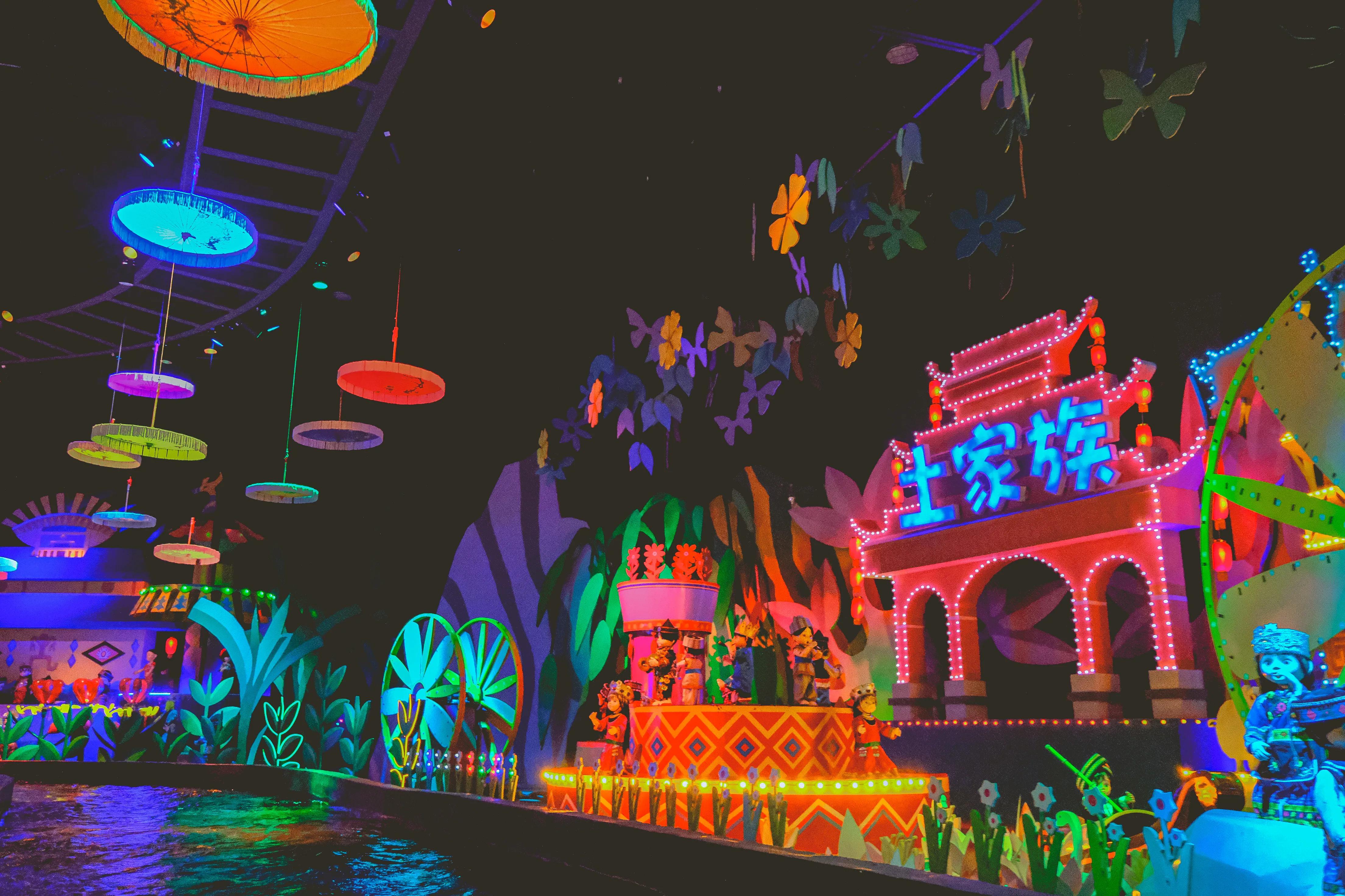 在缤纷华夏,乘船一路漂流,领略56个民族的特色,特别适合一家人游玩。千古蝶恋和牛郎织女两个项目则是催人泪下,让人感叹爱情的美好和不易。