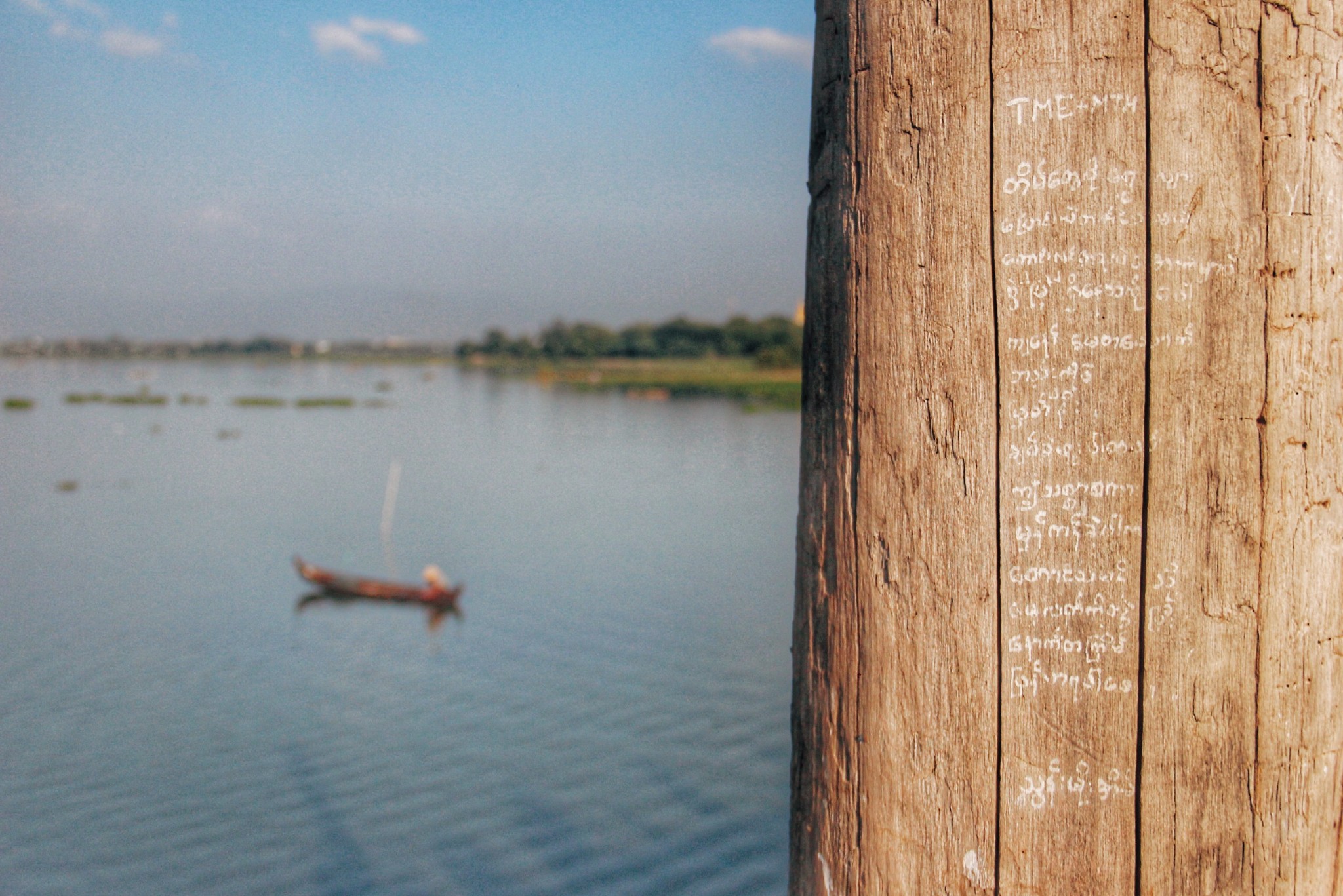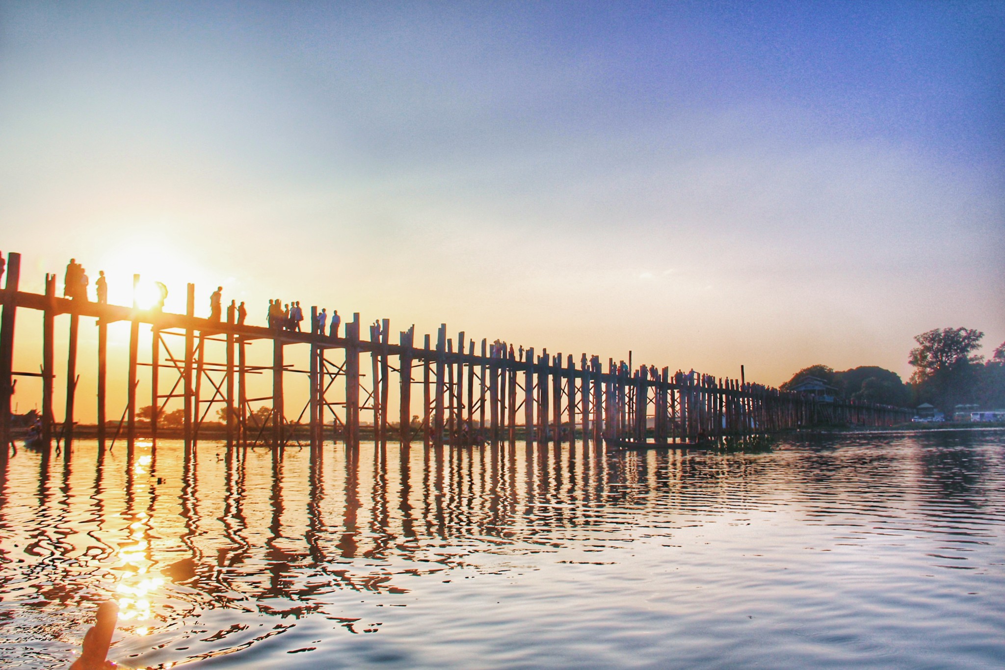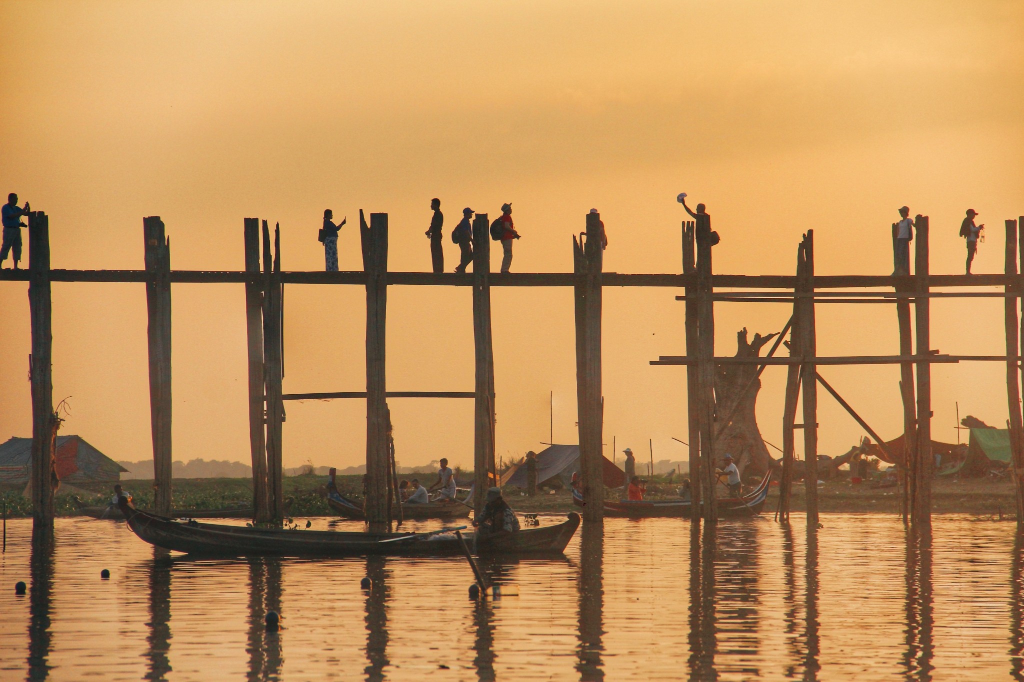 乌本桥上其实并不宽敞,两侧也没有护栏,走在熙熙攘攘的人群中要格外小心。走一个单程估计要半小时,我们走到三分之一就折返回湖边搭船去看日落了。