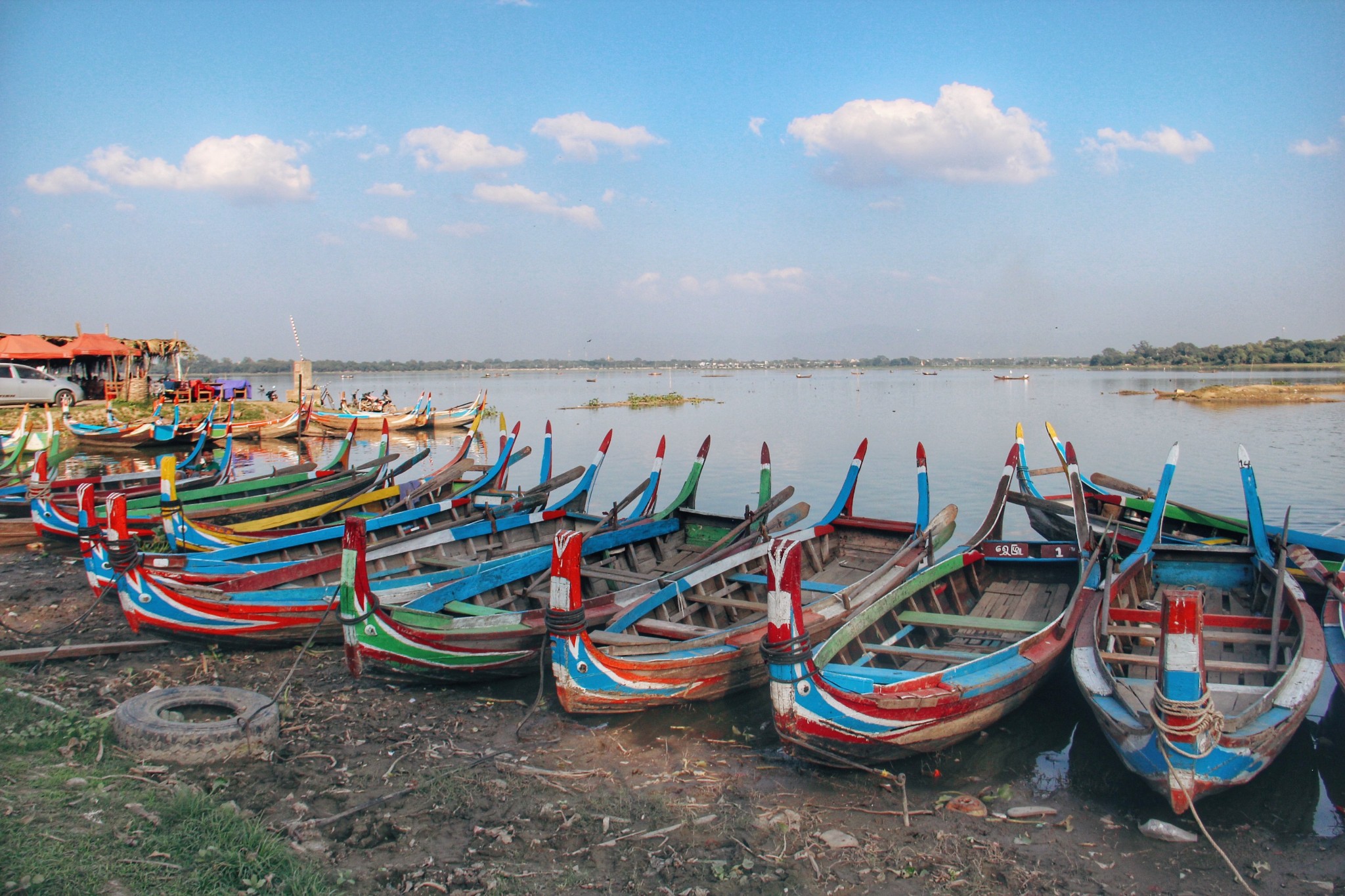 游客可以选择在桥上看日落或游船,旺季的时候建议提前预定一辆小船,费用大概1万缅币。船夫会带你渡过东塔曼湖,穿过乌本桥洞,然后在湖中央找到一个最佳日落观赏点停驻,直到日落结束返程,大约一小时。