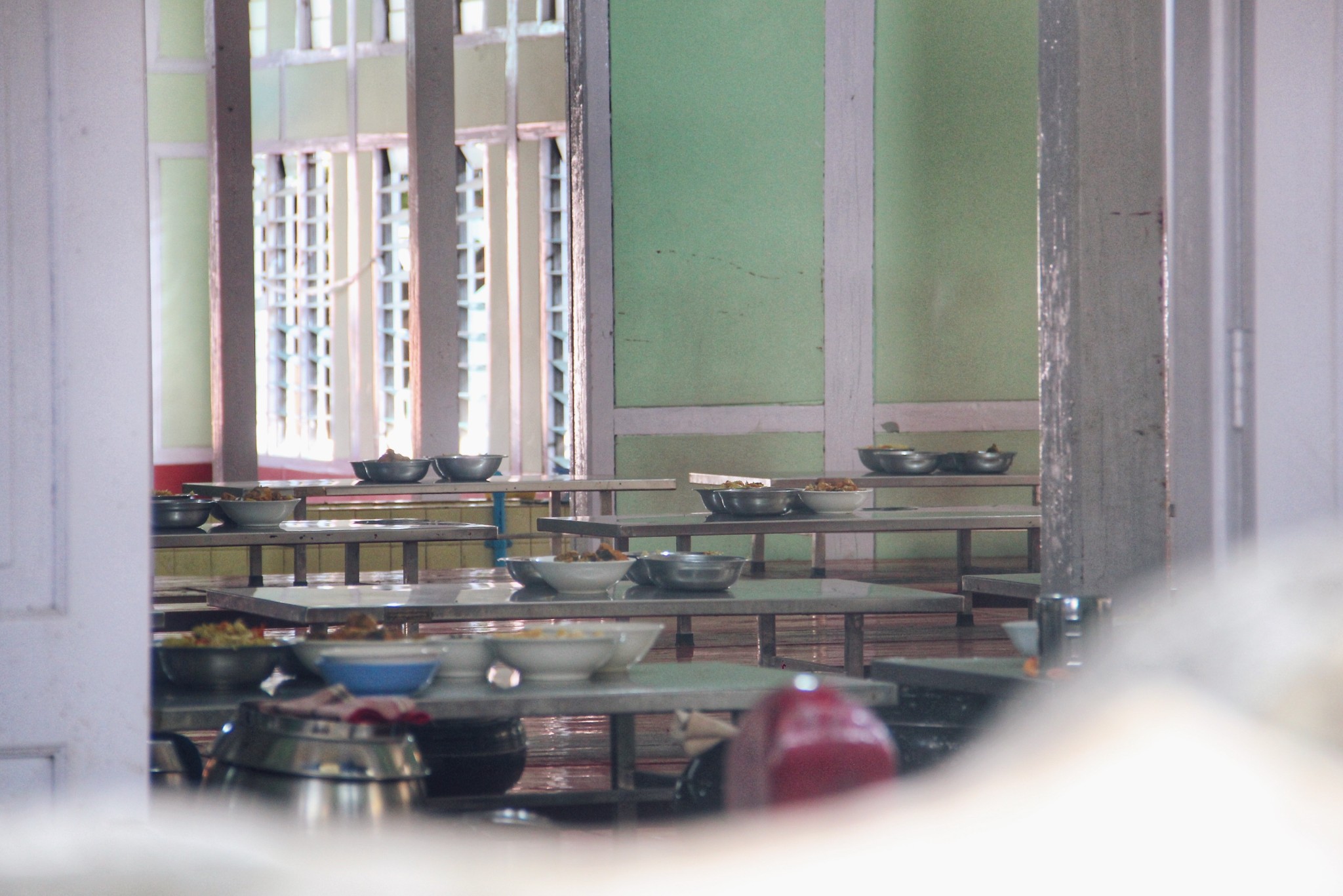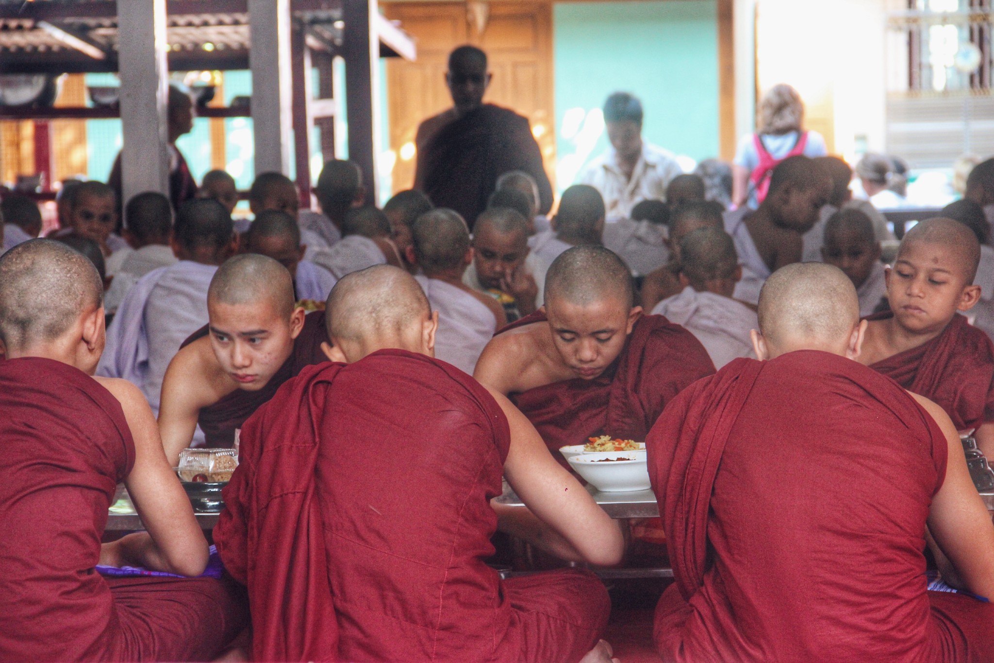 食堂内是禁止游客入内的,还好长焦镜具有优势。僧人们进入食堂后,才可以解开裹得严严实实得僧衣,露出右边臂膀,用斋饭全程悄无声息地。在缅甸僧人可以吃荤,所以伙食非常丰富,鸡鸭鱼肉、水果蔬菜、茶水饮料一样不少。