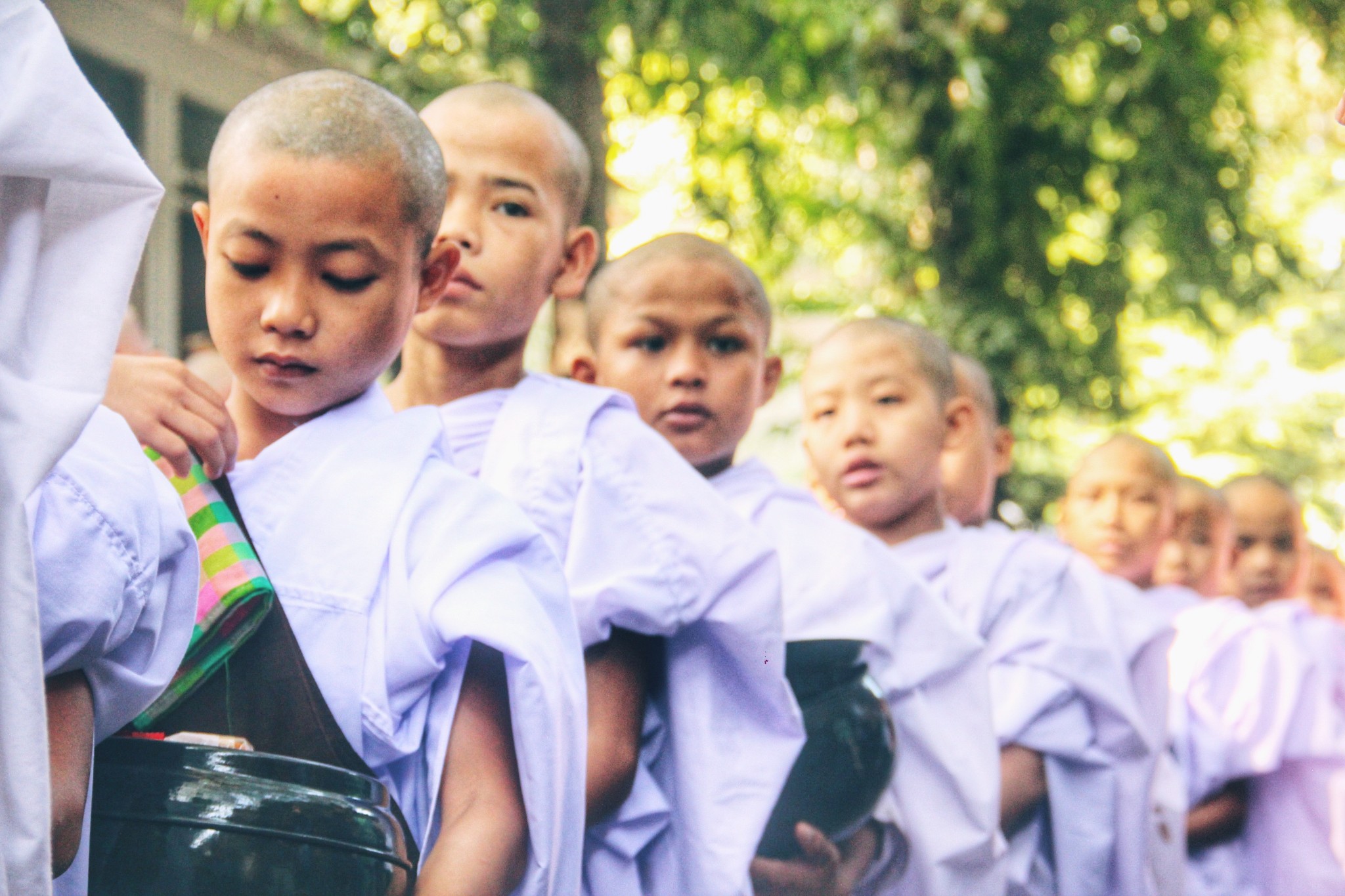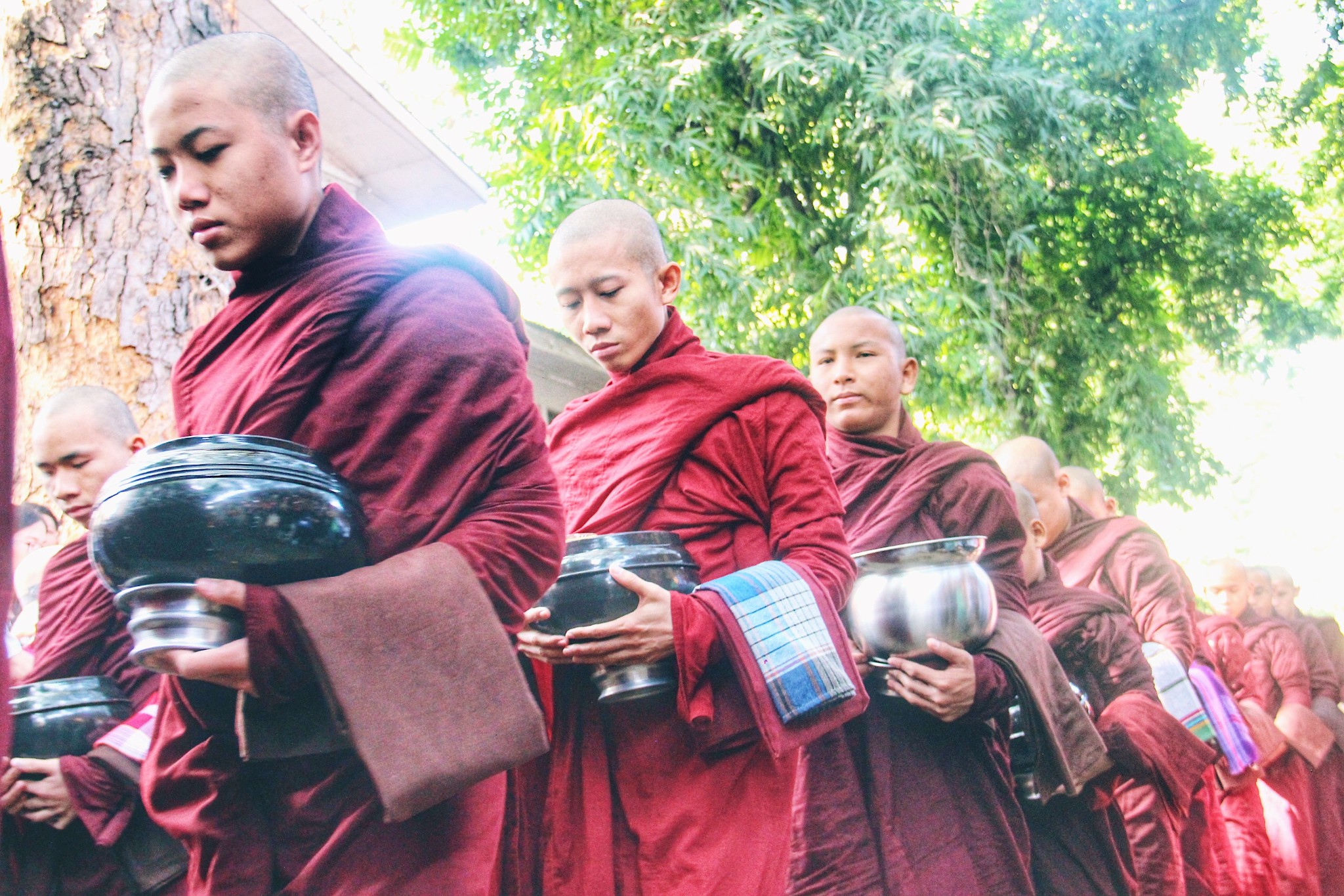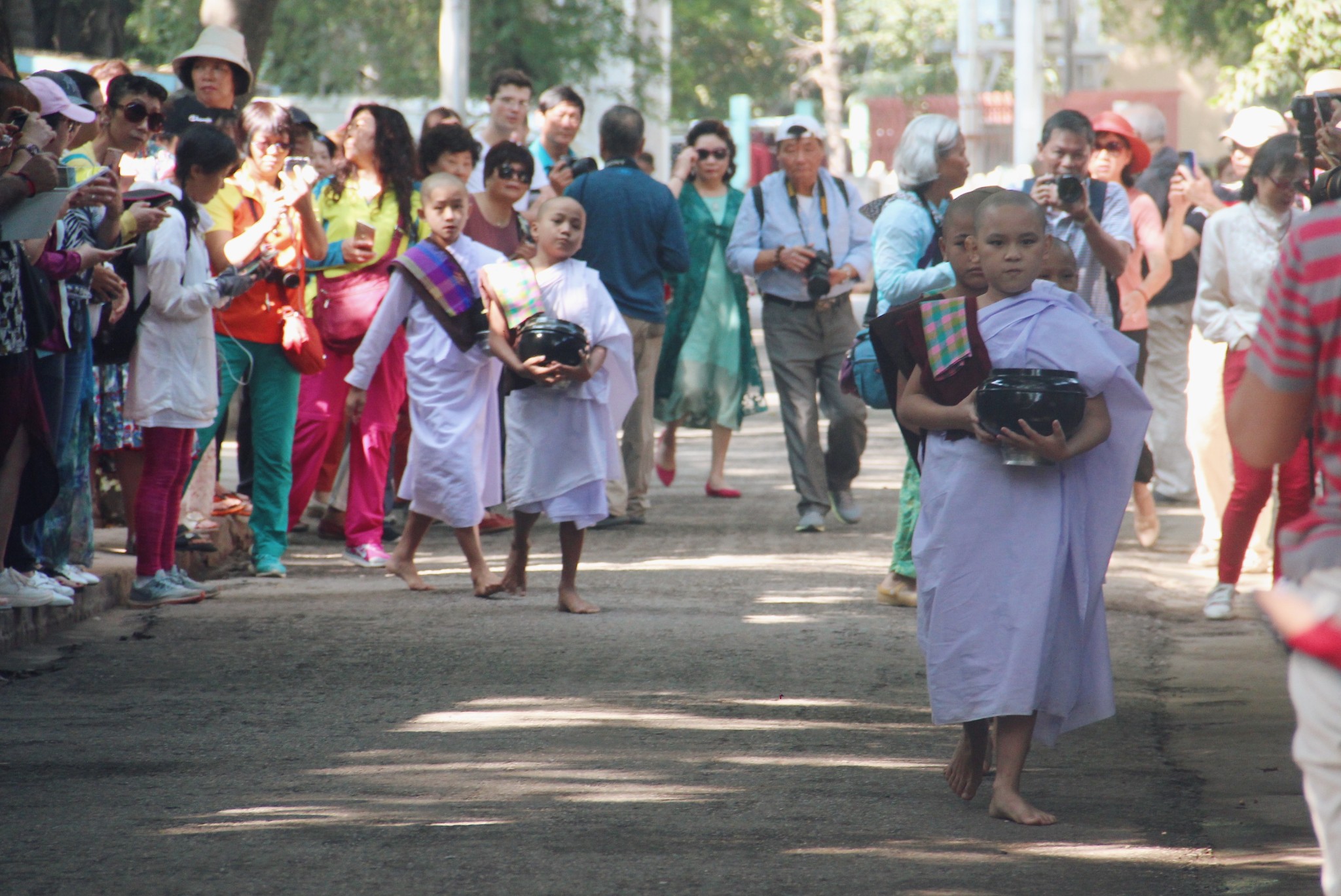 僧侣严格执行“过午不食”和“托钵乞食”,他们一天只吃两餐,一餐在清晨四点,一餐在上午十点。每天上午十点,路两边挤满了各国慕名而来的游客,长枪短炮纷纷对准了队伍,都想记录千人僧饭的瞬间。上午十点十五分,佛学院准时敲钟,僧人们有序排队接受信众的布施,他们手臂包裹在袈裟内,赤脚托着钵慢慢前行,即使周围人群逐渐嘈杂,他们基本维持低头不语,神情肃穆。队伍最后身穿白色僧袍的是初学者,需要经过一段时间的学习考核后才能换上绛红色僧袍。