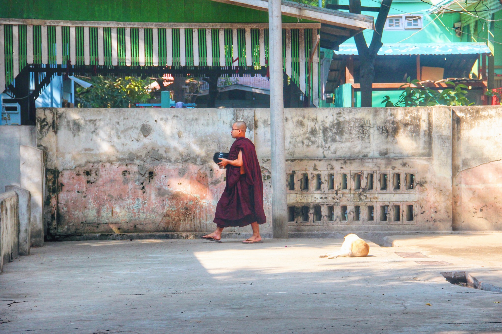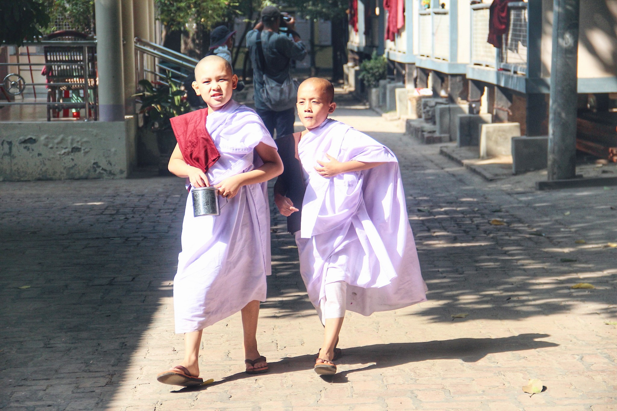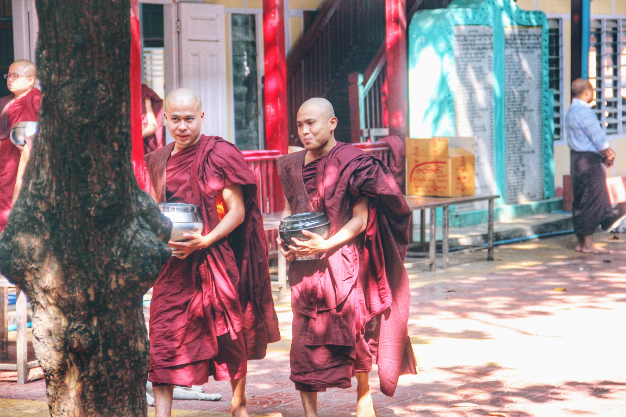 离开僧院时,遇到三三两两吃完饭托着钵的僧人们,这对他们而言是日常生活中最平淡的一部分,却是游客想千方百计记录下来的片段。当喧嚣散去,游客渐渐离开,他们终将回归那个平静的生活。