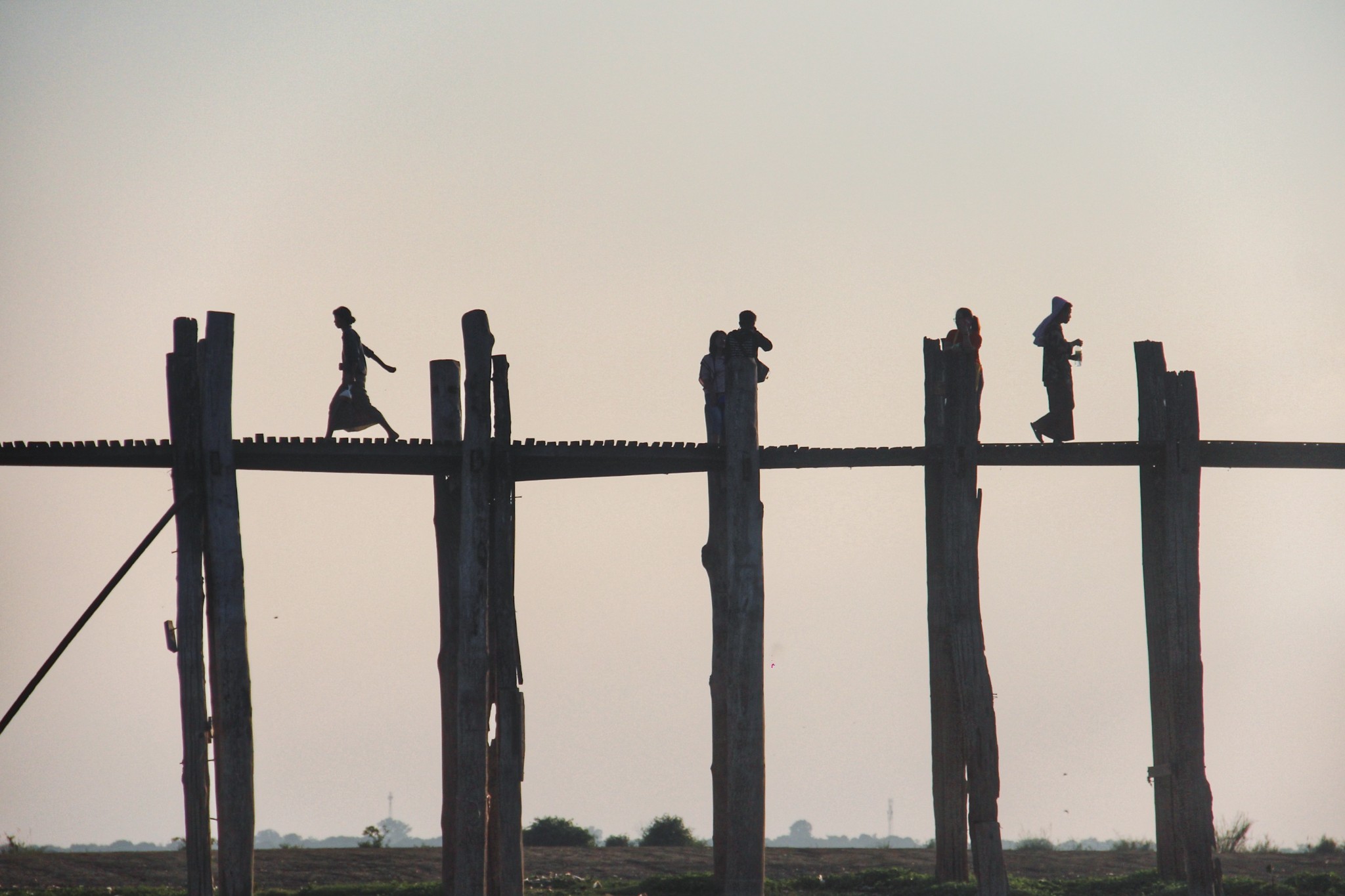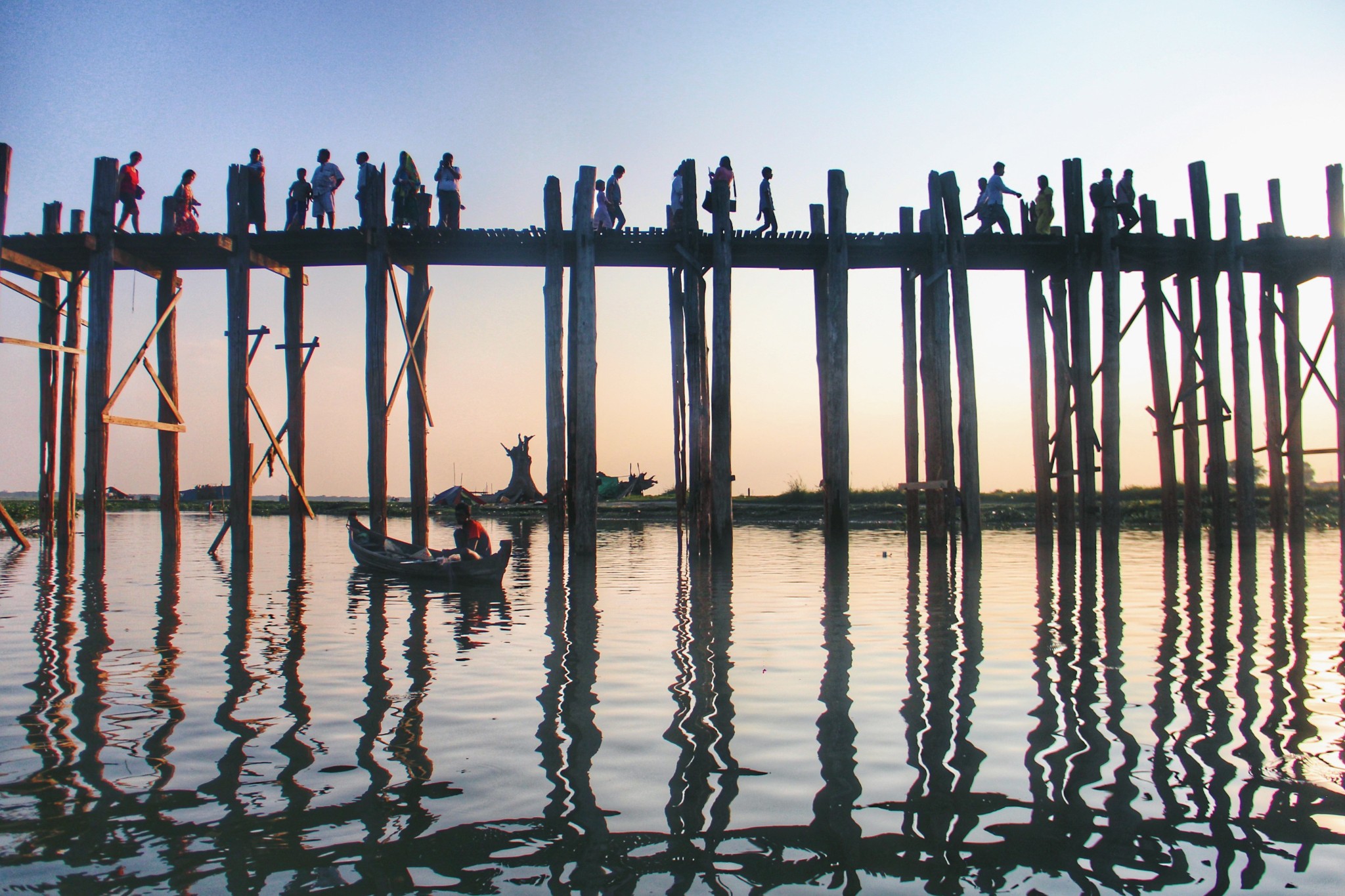 到曼德勒的第一天就赶往心心念念的乌本桥,等待缅甸的第一场日落。乌本桥,横跨东塔曼湖,长达1200米,是世界上最长的柚木桥,整座木桥相接处没有使用一颗铁钉,全靠斗榫,经历一百五十年的岁月洗礼,迄今不朽。它也被缅甸人称为“爱情桥”,据说情侣们一同牵手走过乌本桥,日子会长长久久,永远不分离。