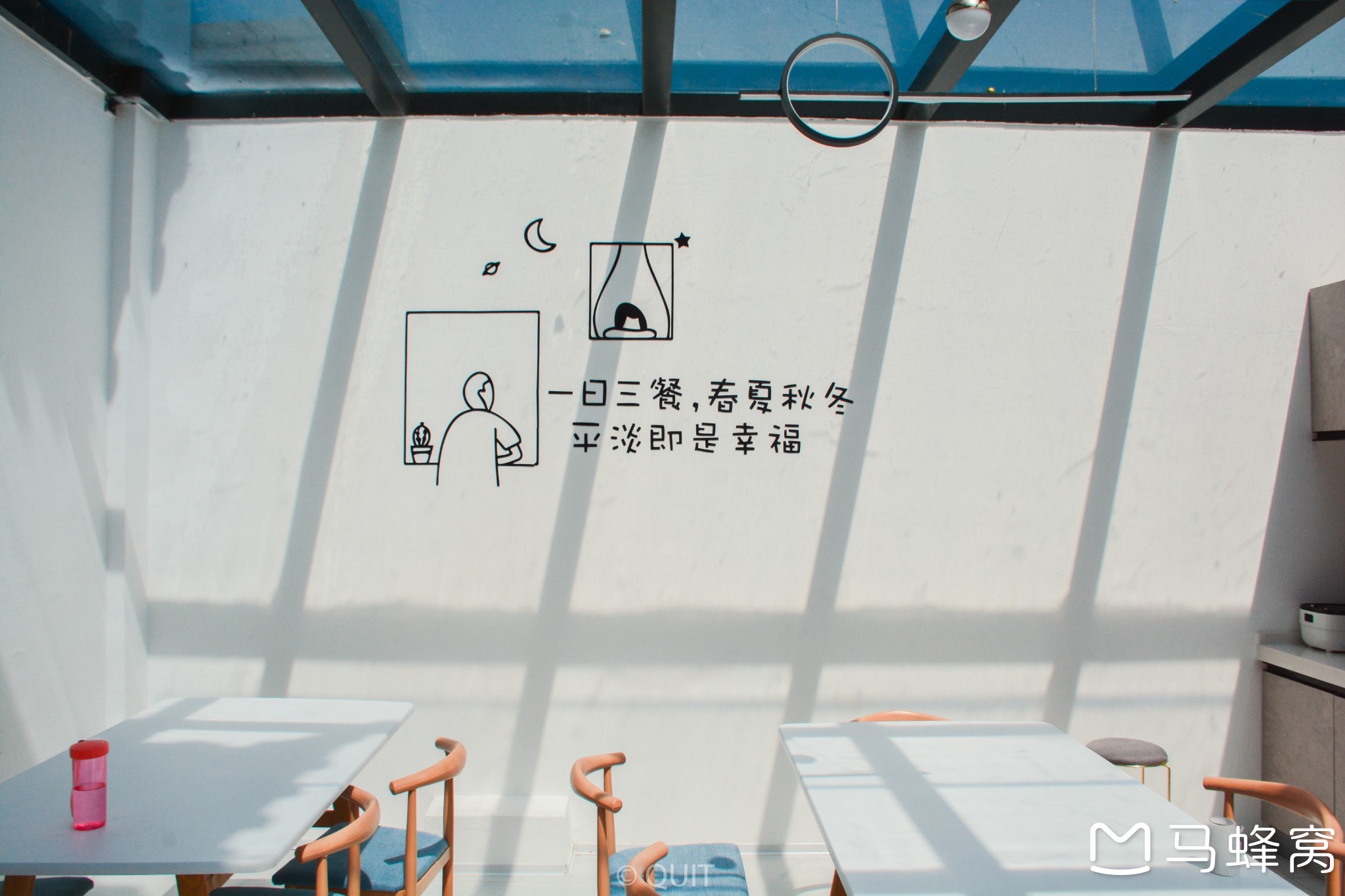 我们入住民宿的旁边有一间厨房,吸引我的不是它能做饭的功能,而是墙壁上的那些字:一日三餐、春夏秋冬,平淡即是幸福和某段时间网络上很火的:一室、两人、三餐、四季,是那么的契合。开轩面场圃,把酒话桑麻!
