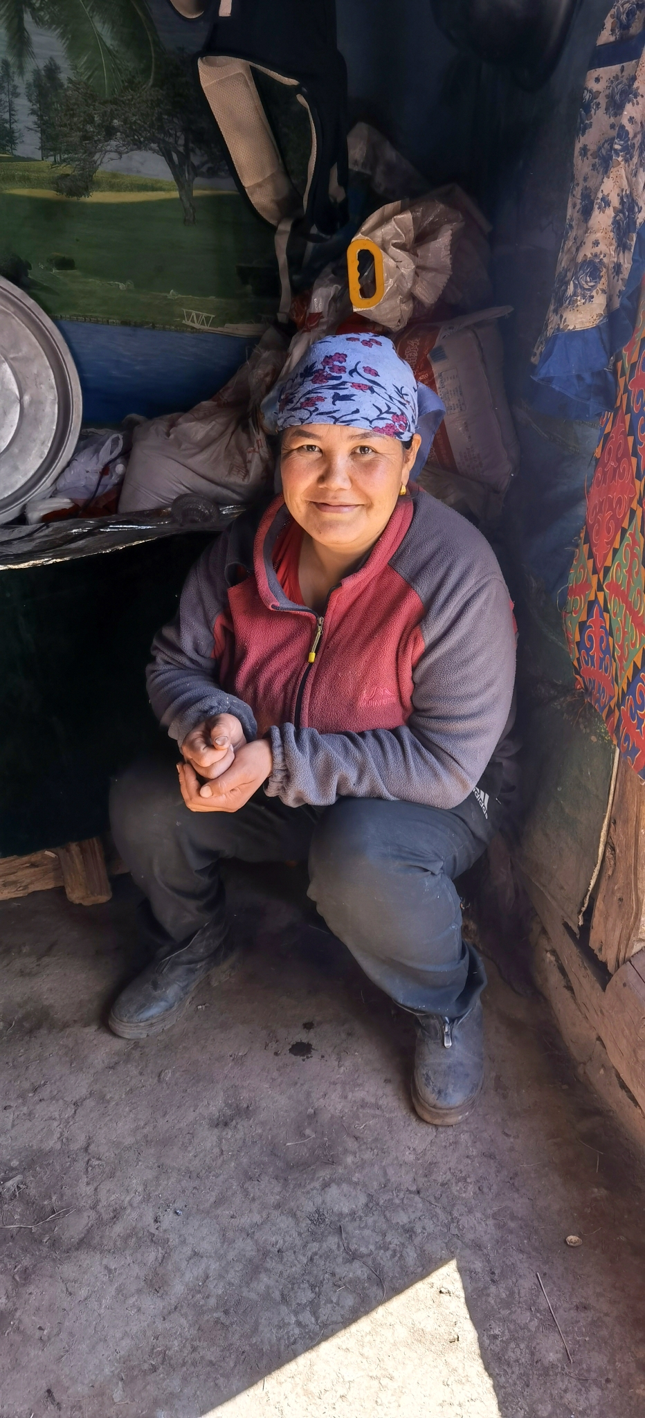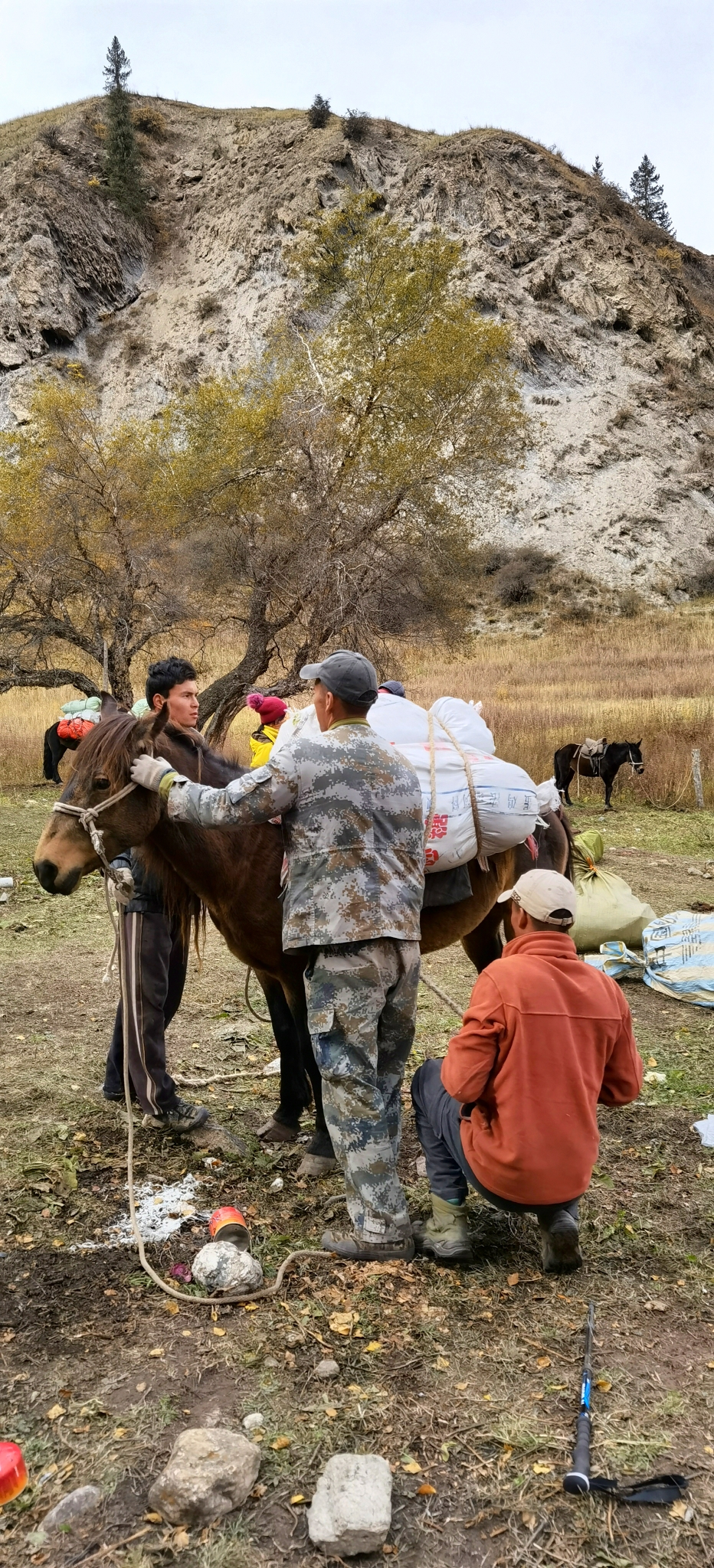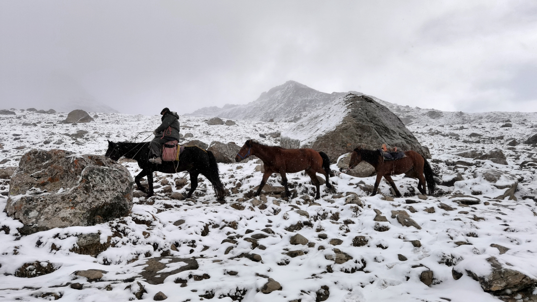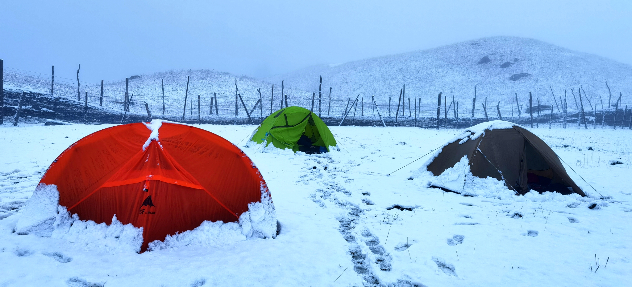 三个小时,拔升300米,抵达海拔2451米的牧民家,在院子扎营。牧民的儿子沙朗就是我们的马夫,男主人51岁,女主人一直在默默地做饭。两个卧室是大炕,也挤满了驴友。半夜一点开始下雪,早上所有帐篷都被雪覆盖,睡袋也变得非常潮湿。