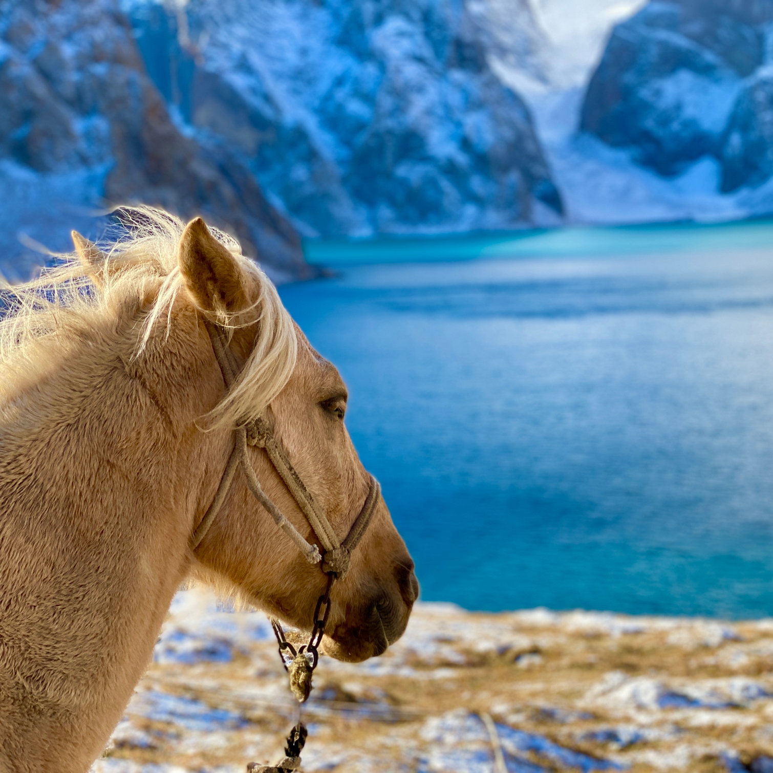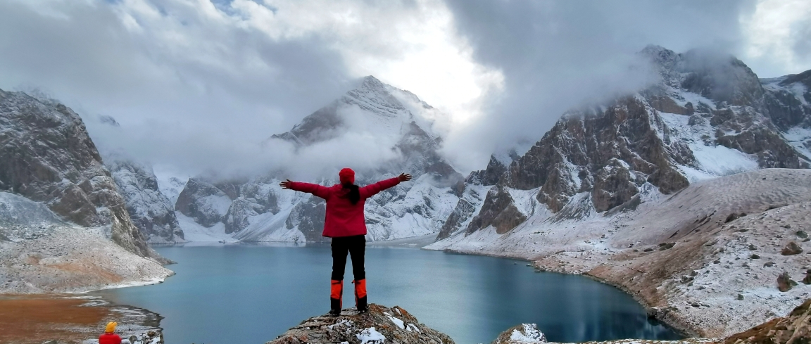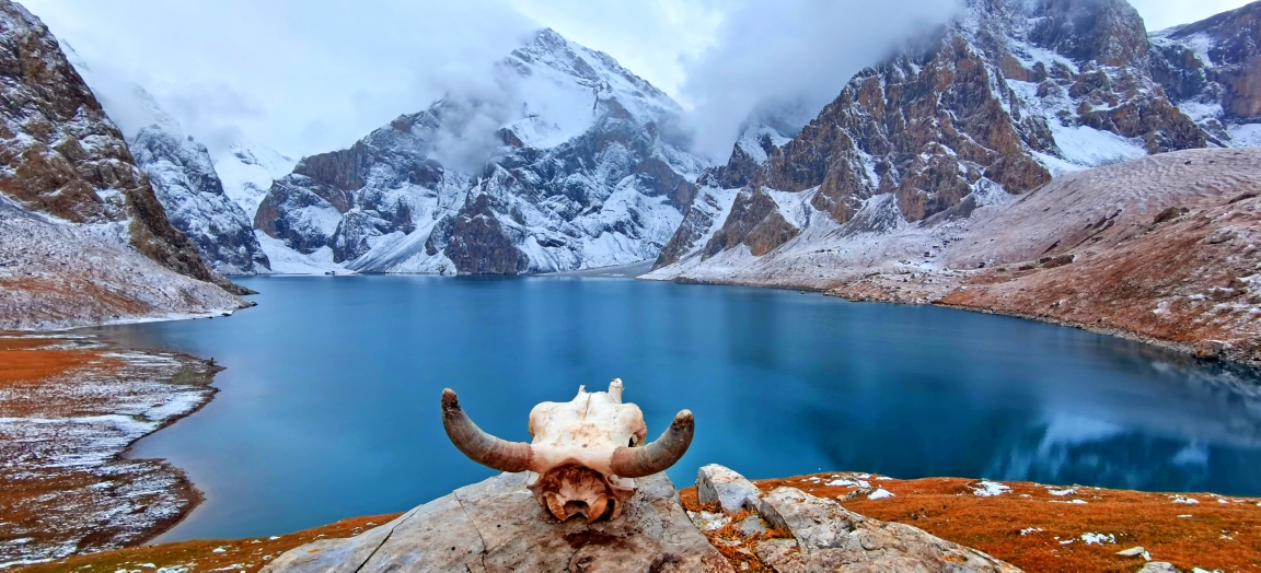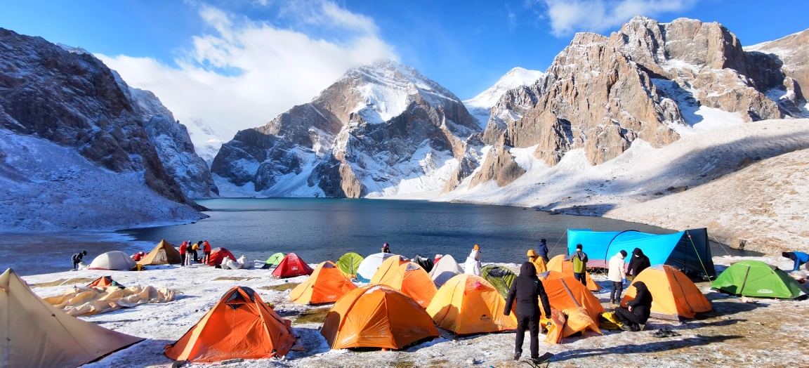 乌孙古道最大的风险就是来自过河。今天早上一出发就要连续过十来条河,所以我们大多数队员今天都选择了骑马。马道陡峭湿滑,坐在马背上其实比自己徒步更害怕,下午三点又开始下雪,而且越来越大,到了达板已经是中雪。只见重装的人在艰难前行,轻装的此时也是举步维艰。我们的马队在风雪中翻越达板,再行半个小时,终于来到了今晚的营地,梦想中的天堂湖。群山被雪覆盖,周围一片银装素裹,突然阳光刺破云层,天堂湖泛起微蓝,雪山倒映湖中,这样的仙境也只有历尽艰辛的人才值得拥有,所有的辛苦在此刻都化为感动,没有什么比看到天堂湖更激动人心~