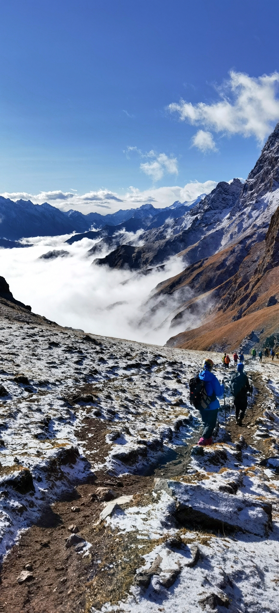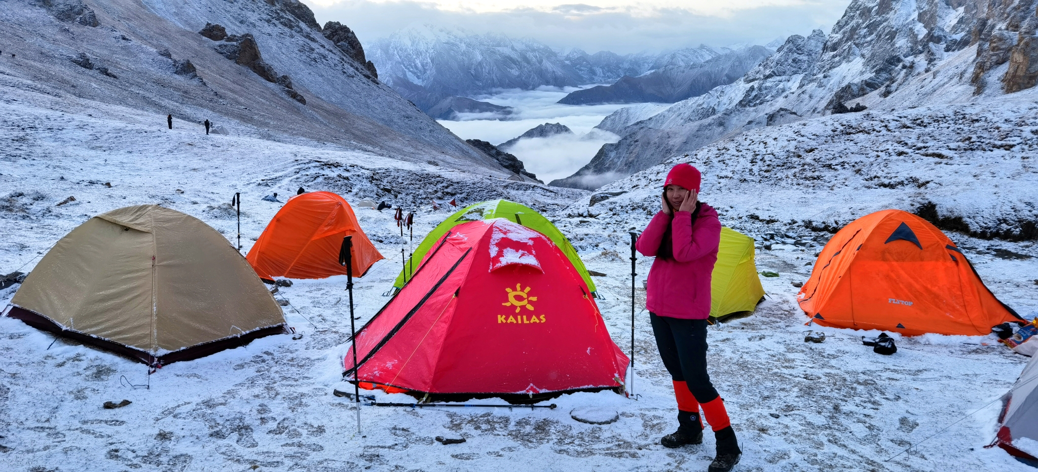 早上10点拔营,今天是最艰难的一天,拔升高度1300米,达板最高海拔3700米。天气非常不好,风雪交加异常寒冷。一直在泥泞的马道艰难行走,下午五点到达板下面,陡峭的达板上都是乱石堆,我必须仰视才能看清这座横亘在我面前的巨大屏障,已经在风雪交加中徒步了大半天,在精疲力尽的状态下还要继续翻越达板,咬牙坚持,30步一歇,用时一个多小时终于爬了上去。山顶上狂风怒吼,容不得停留,但怎么也找不到小路的痕迹,迷茫中手脚已经冻到麻木,幸好遇到一个马夫赶紧让他指路,不然我和小谢还真的会失温。继续下撤两公里,终于在徒步10小时后晚上8点抵达海拔3300米的营地。所有人都是冻到接近失温,匆匆吃了晚饭钻进帐篷不敢再出来,幸好还有两个暖宝宝让冻僵的双脚恢复了知觉。