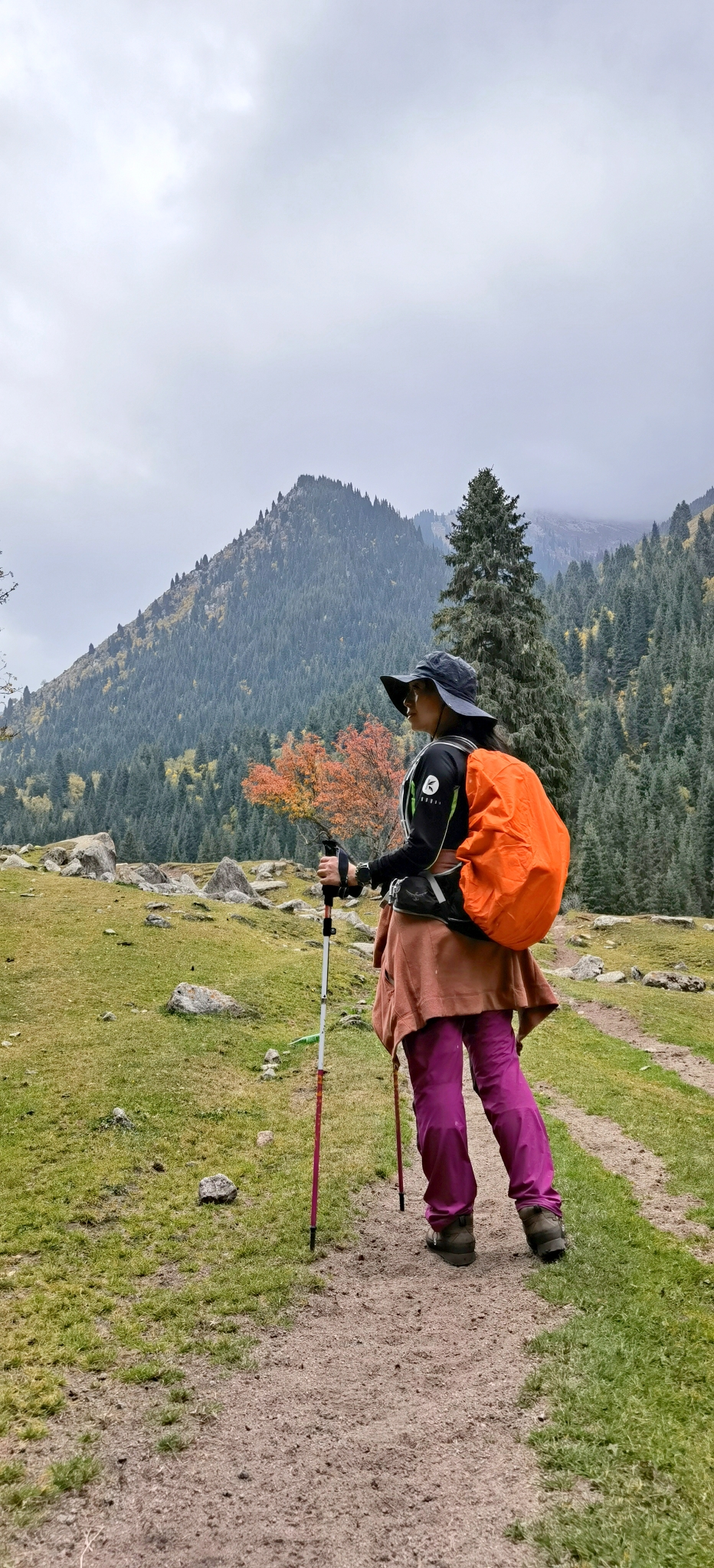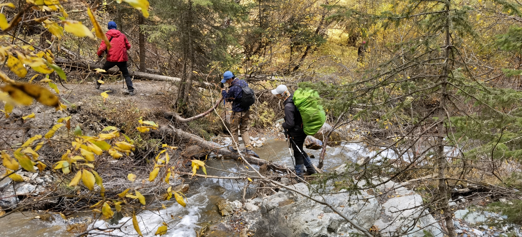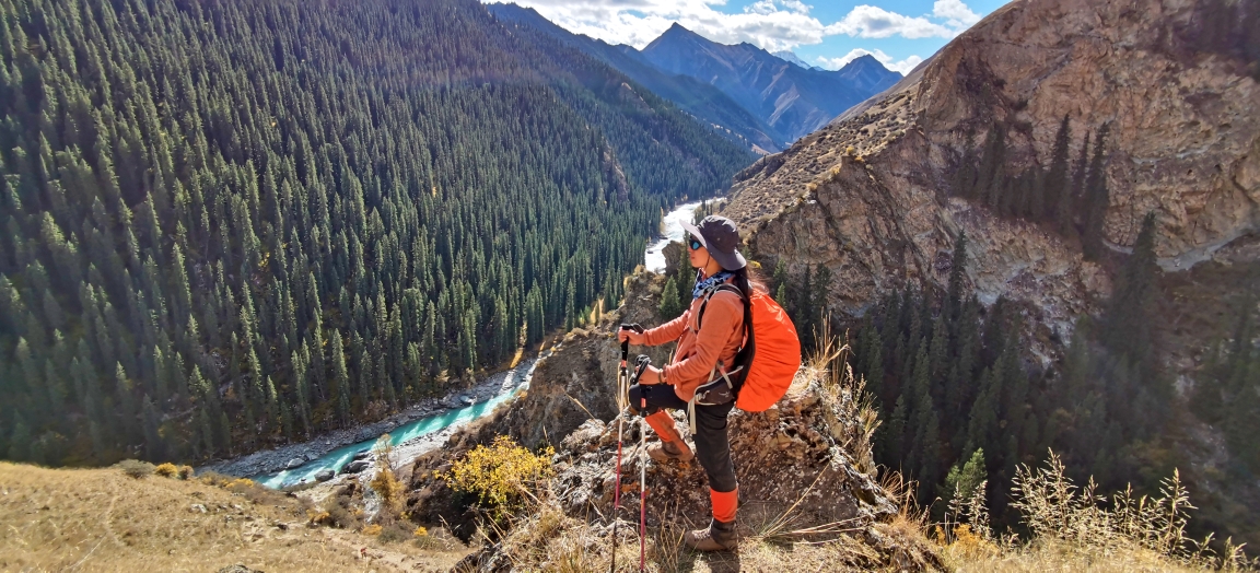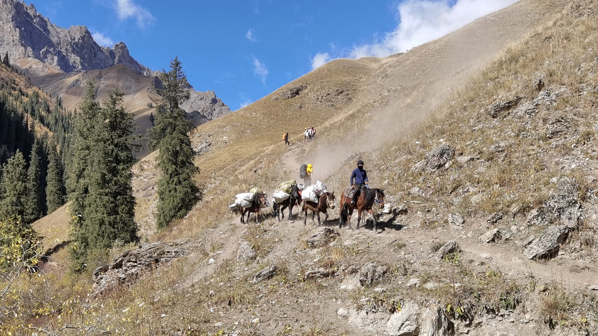 夜火车抵达伊宁站时依然夜色朦胧,大雨,在火车站经过一系列严苛的检查,做完核酸分流给琼库什台的工作人员,再次登记后一行人挤满中巴车向特克斯八卦城驶去。中途雨停,还有了阳光。在特克斯吃了美味的抓饭和烤包子,继续前往琼库什台。下午三点进村,把大背包留给马夫后开始徒步,从琼库什台后面的小路进山。