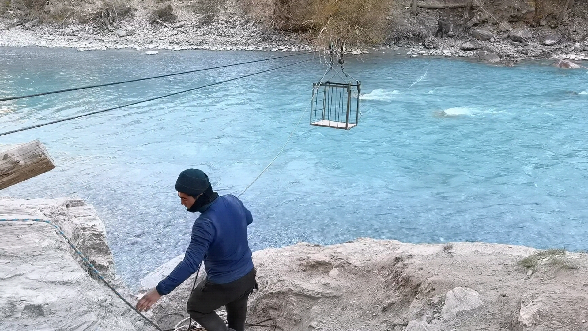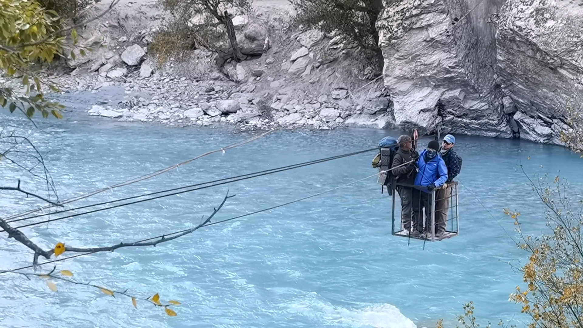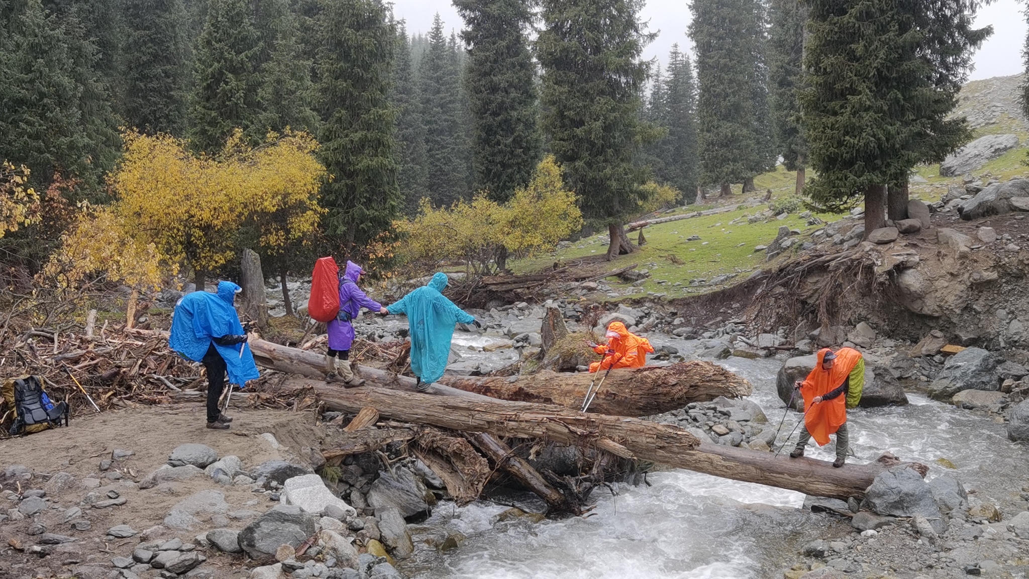 半夜四点开始,帐篷被雪粒拍打着噗噗作响,迷迷糊糊的捱到早上七点,拉开帐篷,竟然看到雪山下山坳处的一大片云海,雪地上五颜六色的帐篷似盛开的花朵。这片营地集中着几乎所有驴友,观云海,喝牛奶,10点拔营一路下撤,全天经过了多种地形,草原,树林,峡谷,下午四点到阔克苏大峡谷,谷底就是阔克苏河,在河边煮茶休息,洗了速干裤居然很快晒干。河岸的杉林葱翠挺拔,松石绿的河水汹涌奔腾,穿行在画面中,突然画风突变,开始上悬崖,一个只容一人通过的羊肠小道,一路急升,左边就是不见底的河谷悬崖,让人心惊胆战。小心翼翼地通过,再次下到谷底,终于在下午六点半见到了传说中的溜索。钢丝绳上吊着一个小铁笼,每次只能最多容纳三四个人站立,再由河岸两边的人分别拉拽,每人200元,马可以沿骑腰深的河水自行过河。