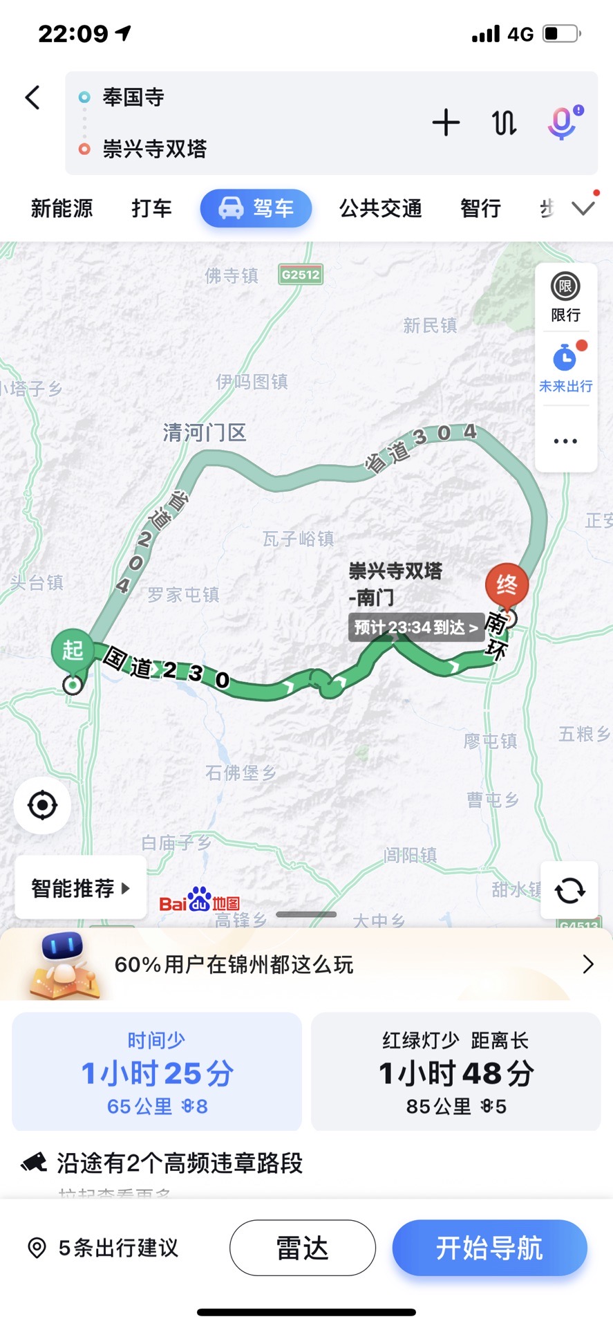 【路线】:义县至北镇市距离65公里,行驶1小时30分钟,不建议走这条路,中间要翻越医巫闾山,全是盘山公路,路况不好。最好是从锦州到北镇往返,全程高速公路,这就是外地人初次来不了解情况。
