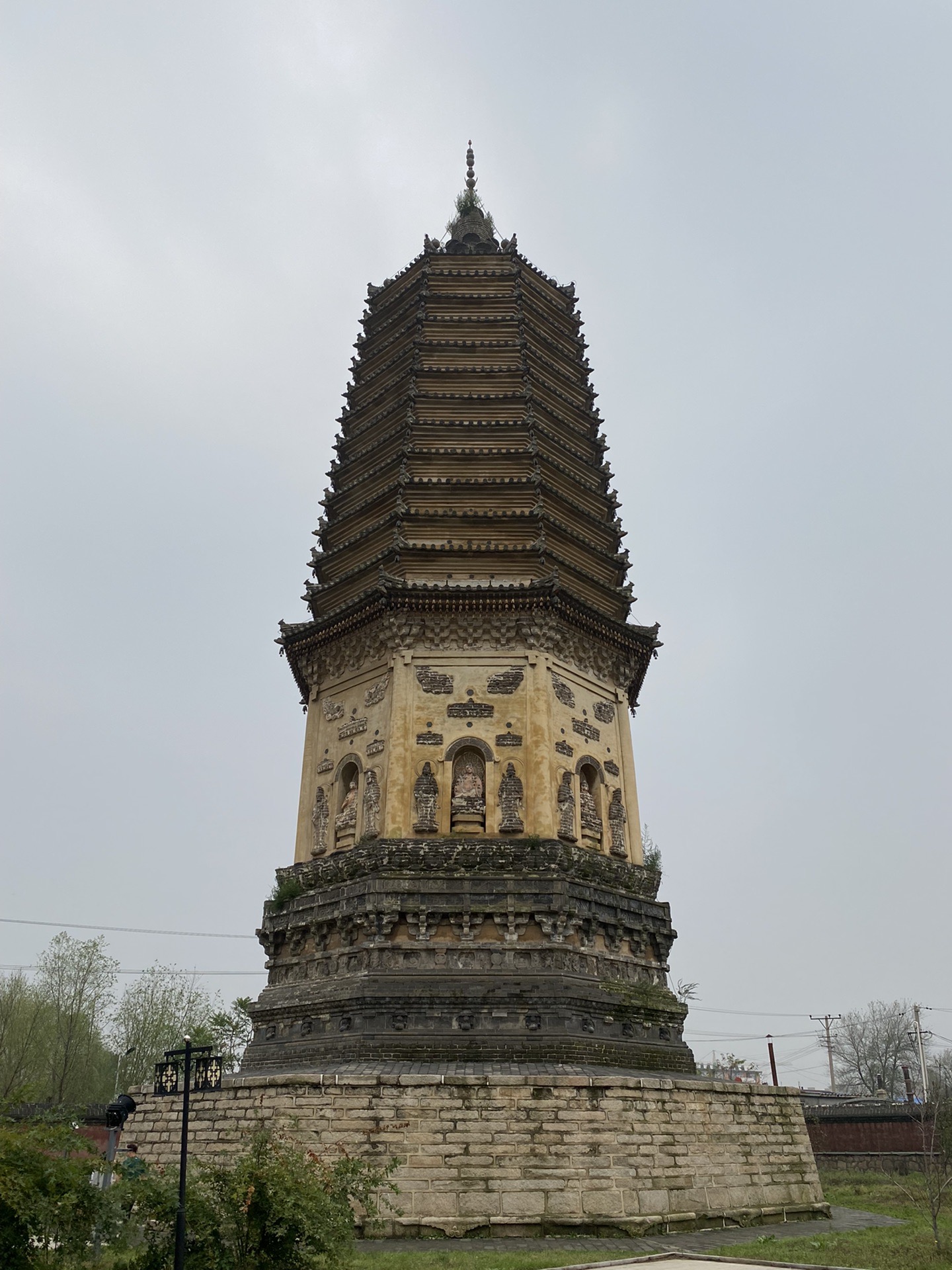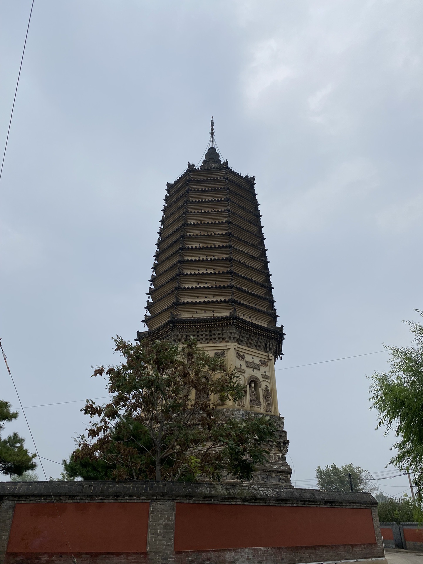 〈结构〉:围着这对双塔上下左右仔细观察,发现两个塔几乎等高,相距43米,结构基本一致,高度,装饰大体相同,均为八角十三层密檐式实心砖塔;结构由塔基、须弥塔座、塔身、十三层密檐、塔顶、塔刹六部分组成;两塔造型十分优美,轮廓非常清晰,总体上都是下宽上窄型,从塔基开始向上逐级内收,每级内收尺度极为合理,整个塔身比例匀称,线条流畅,轮廓舒适;塔基、塔座、塔身、密檐四个部分还运用了简繁相间的造塔手法,使得整体不致单调呆板,更具美感和观赏性,展现出精湛的造塔技艺和高水准的审美。