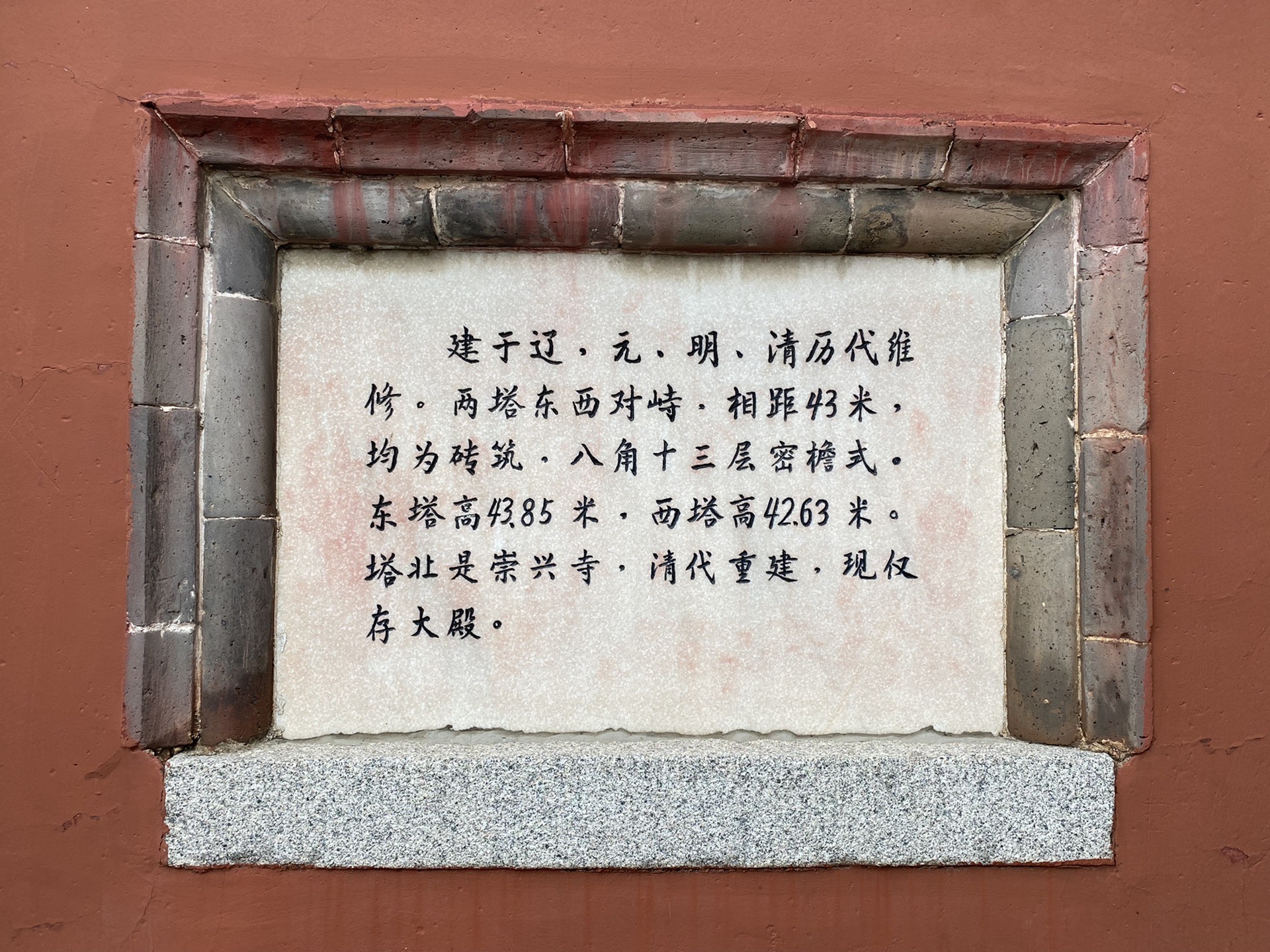 1、塔基:两塔塔基都是用花岗岩石条砌成,没有任何装饰图案,外观简洁,高约3米,为清代光绪年间维修时加固上去的。只是在东塔朝正西方向这个面上镶嵌了一块石碑,表面文字模糊不清。