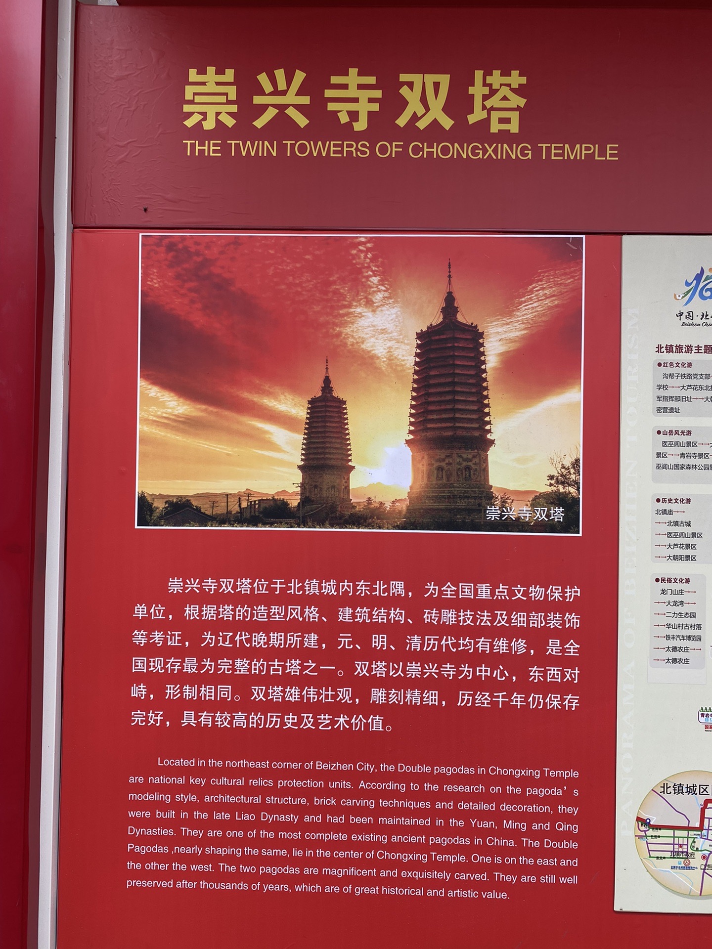 【双塔】:翻越医巫闾山进入北镇市区,道路平直,楼群林立,城市干净整洁,下午3时到达崇兴寺山门前,过程中远远就能望得见高耸的双塔,双塔是北镇市的名片和地标。