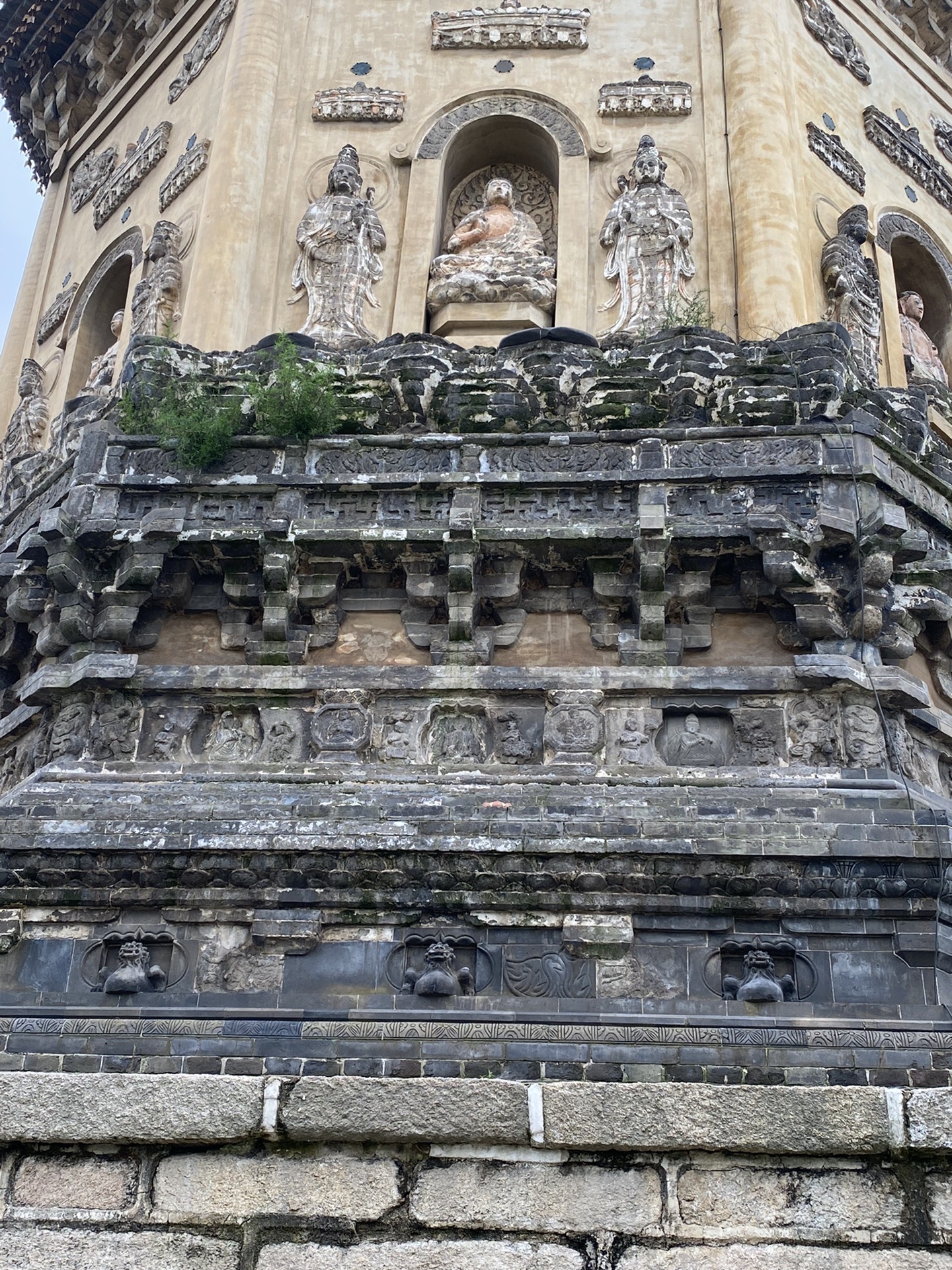 2、须弥塔座:两塔塔座高约10米,叠涩束腰,大致分两大部份,下半部分相对简洁,每个面开3孔壶门,里边是一只伏狮,旁边是砖雕花卉图案,为什么要雕狮子呢?因为佛教崇信狮子,讲经说法要象狮吼一样,苏州有狮子林等;上半部分最为繁丽,先是每个面开三个壶门,里面有乐伎在演湊乐器,旁边有两个侍者,角儿上有力士,这一层上边是斗拱,斗拱上边是勾栏板,勾栏板上边是高约1米的仰莲宝座上接塔身。可以说须弥宝座这一部分是全塔变化最多,最精彩生动的部分,雕刻了大量的人物丶动物丶自然物、植物等,其中人物有罗汉、负重力士、伎乐人、供养人;动物有飞龙、伏狮、游鱼、凤凰;自然物有祥云、宝瓶、万字纹、曲尺纹;植物有卷草、忍冬、莲花、缠枝花纹等,种类繁多,雕工精湛,尤其是砖雕伎乐人,有的吹拉弹唱、有的翩翩起舞,形态各异栩栩如生。这些雕刻刀法细腻、生动、逼真,生动的展示了辽代社会生活的面貌。