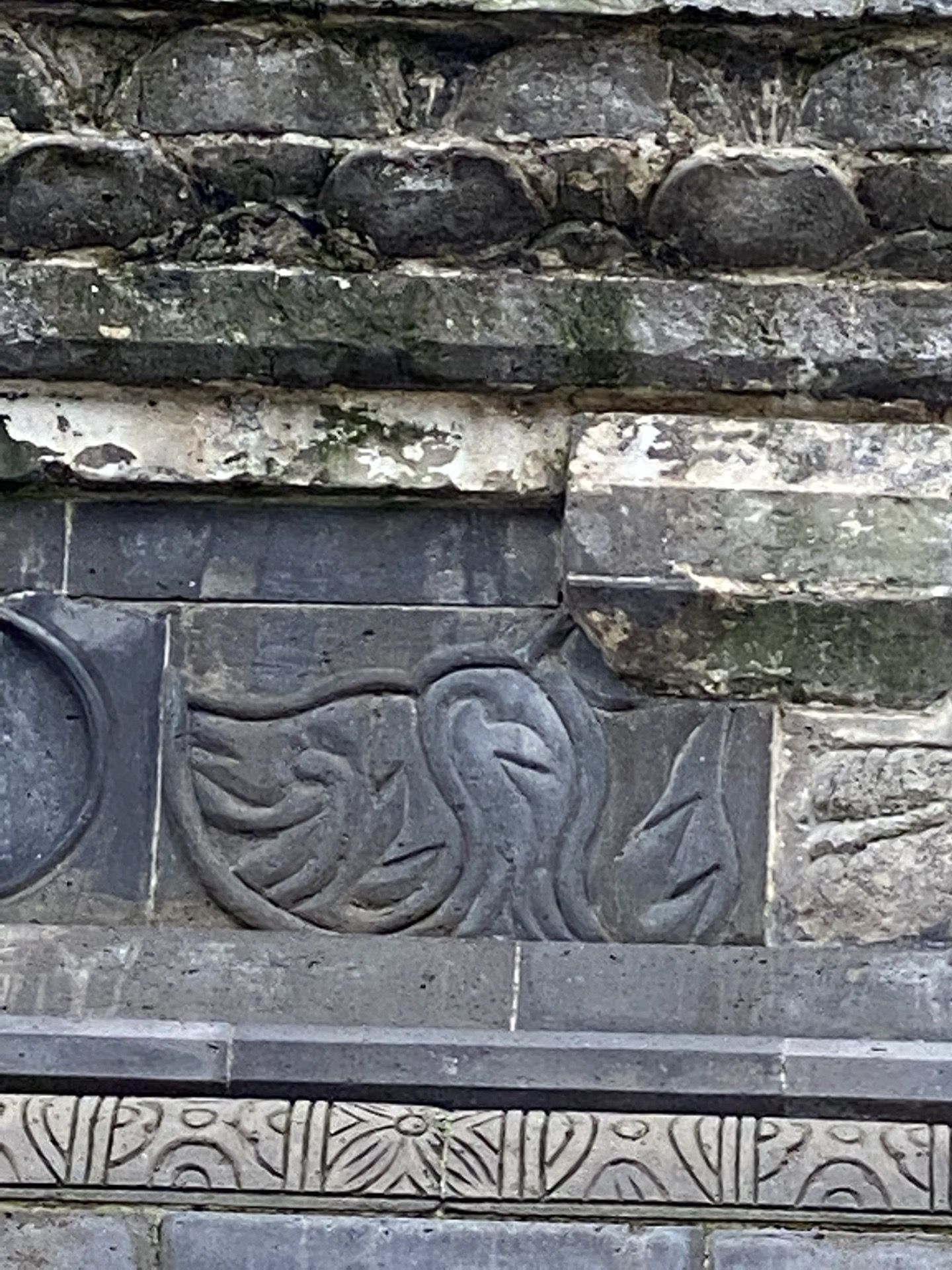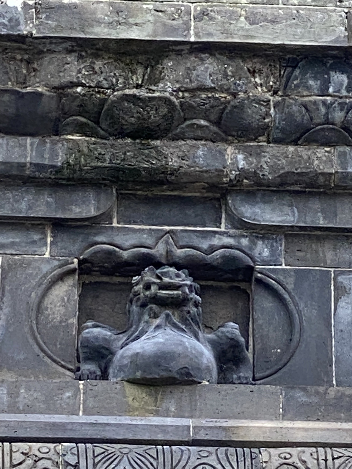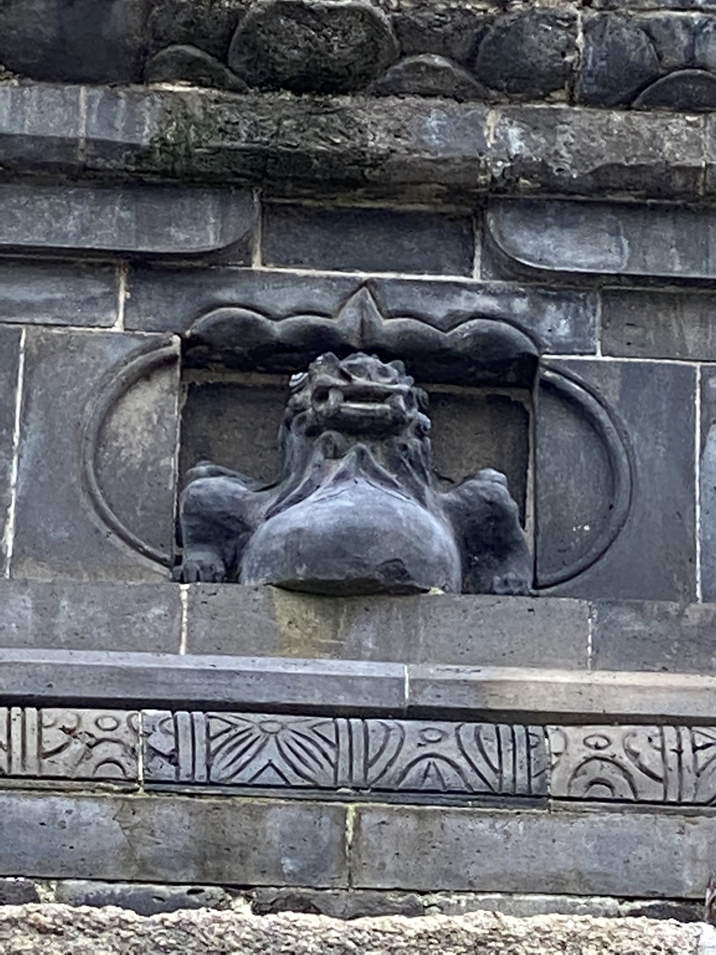 狮子下边一层花砖的花纹做功极粗糙,似莲花纹,应该是近年来修缮时加上去的。
