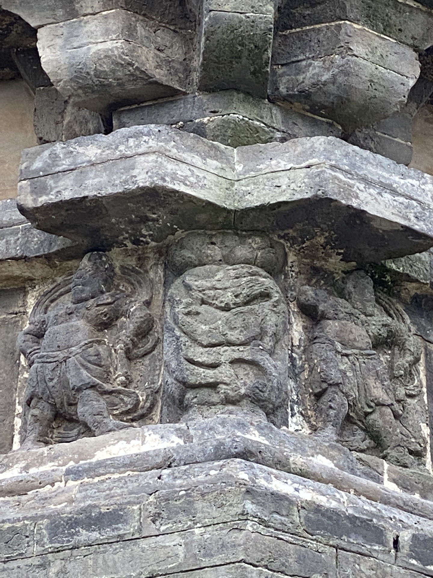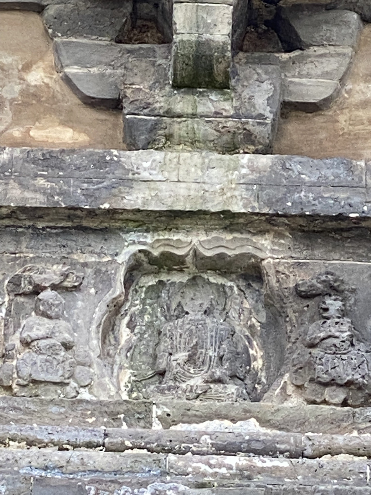 西塔正东面塔座上半部分右侧角两力士砖雕,中间立柱上是游龙浮雕。