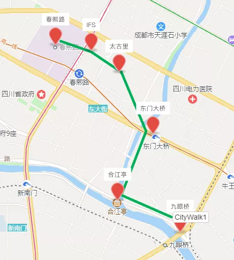 从春熙路下车,按照图示:IFS-太古里-东门大桥-合江亭-九眼桥