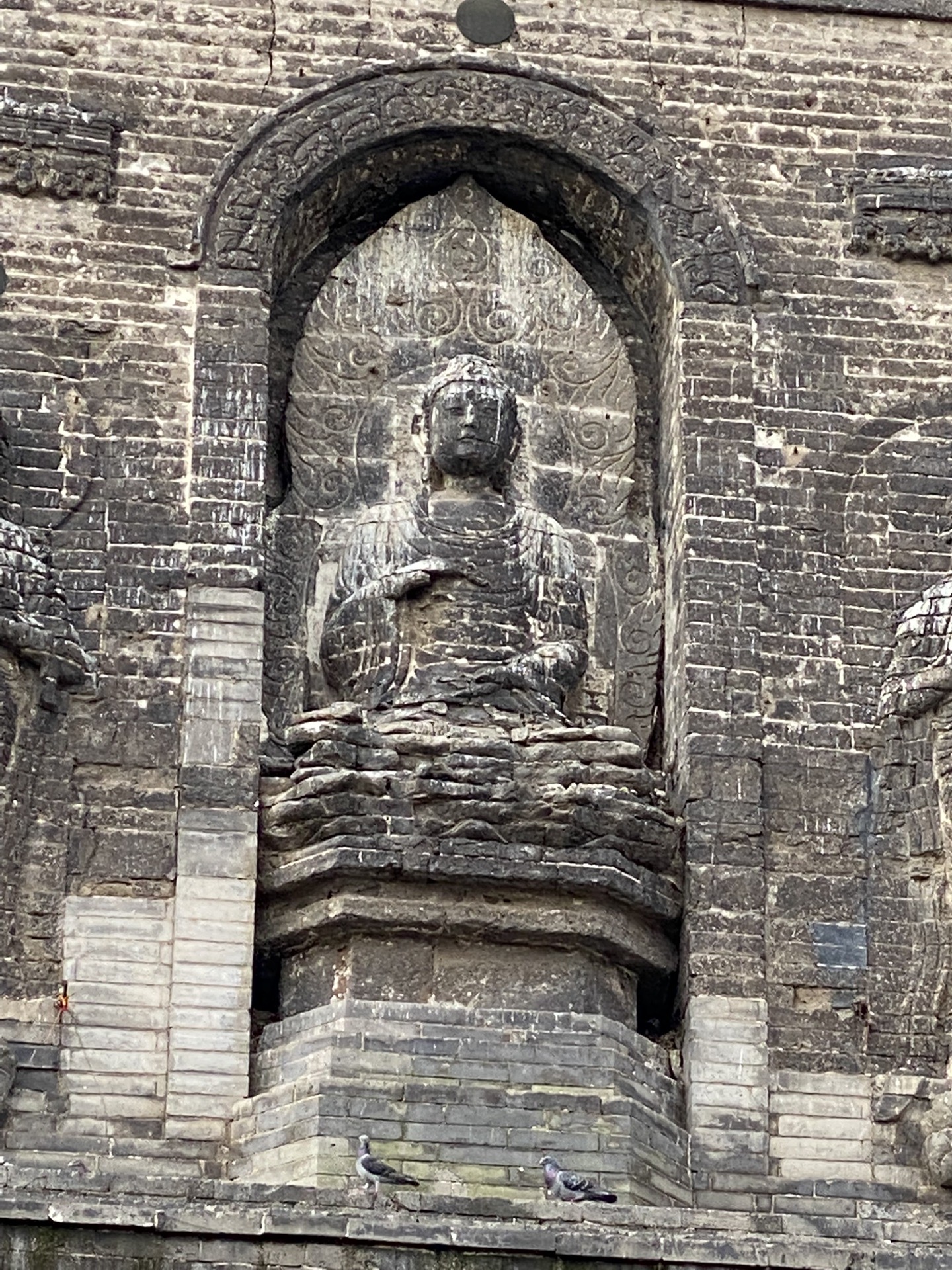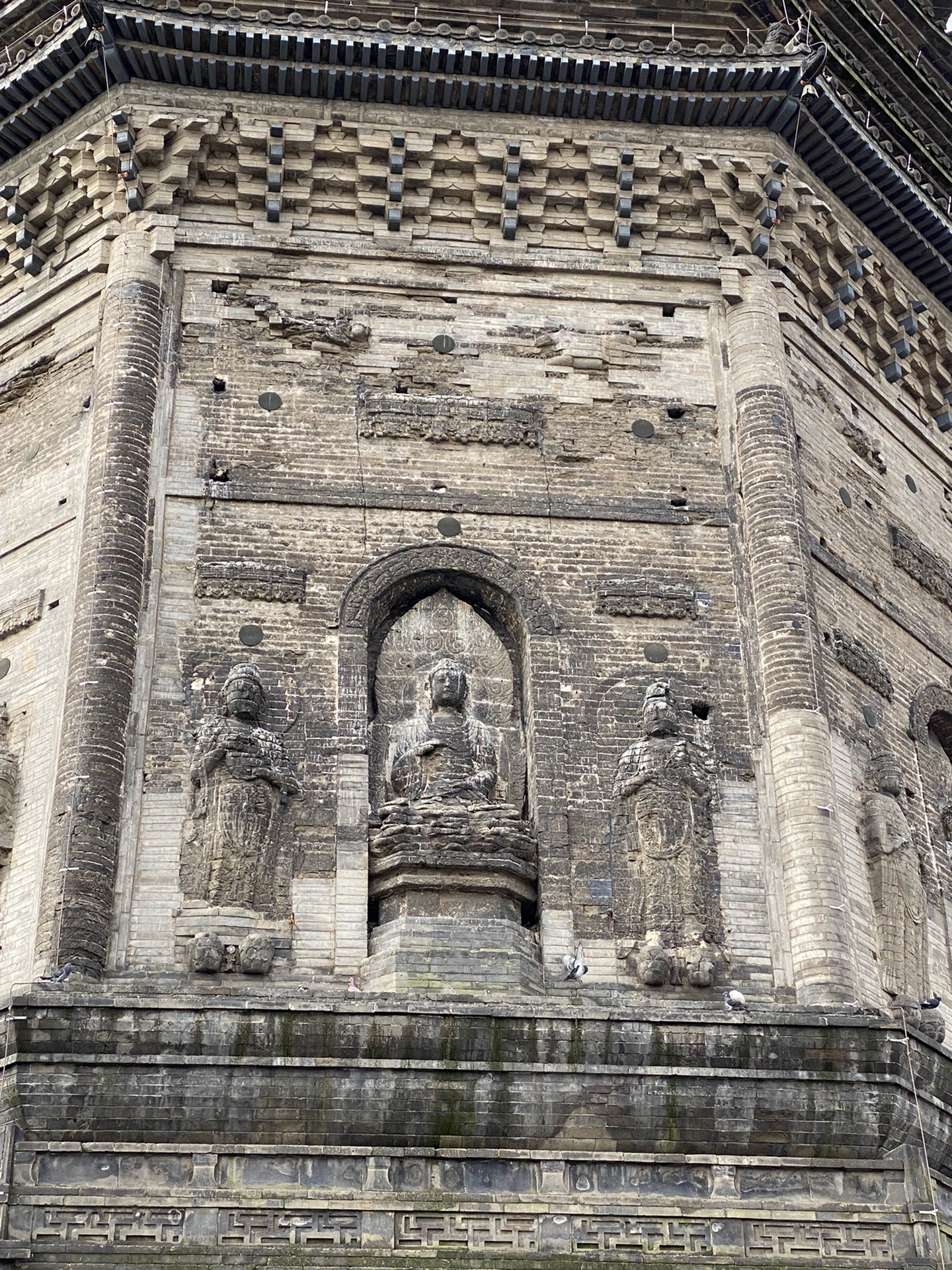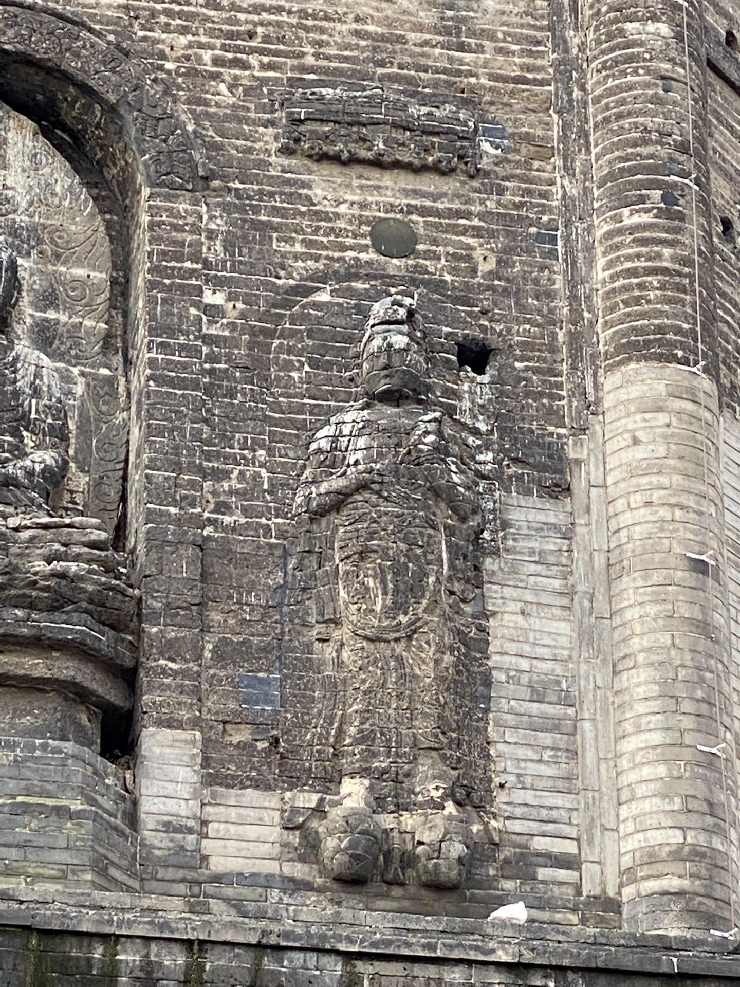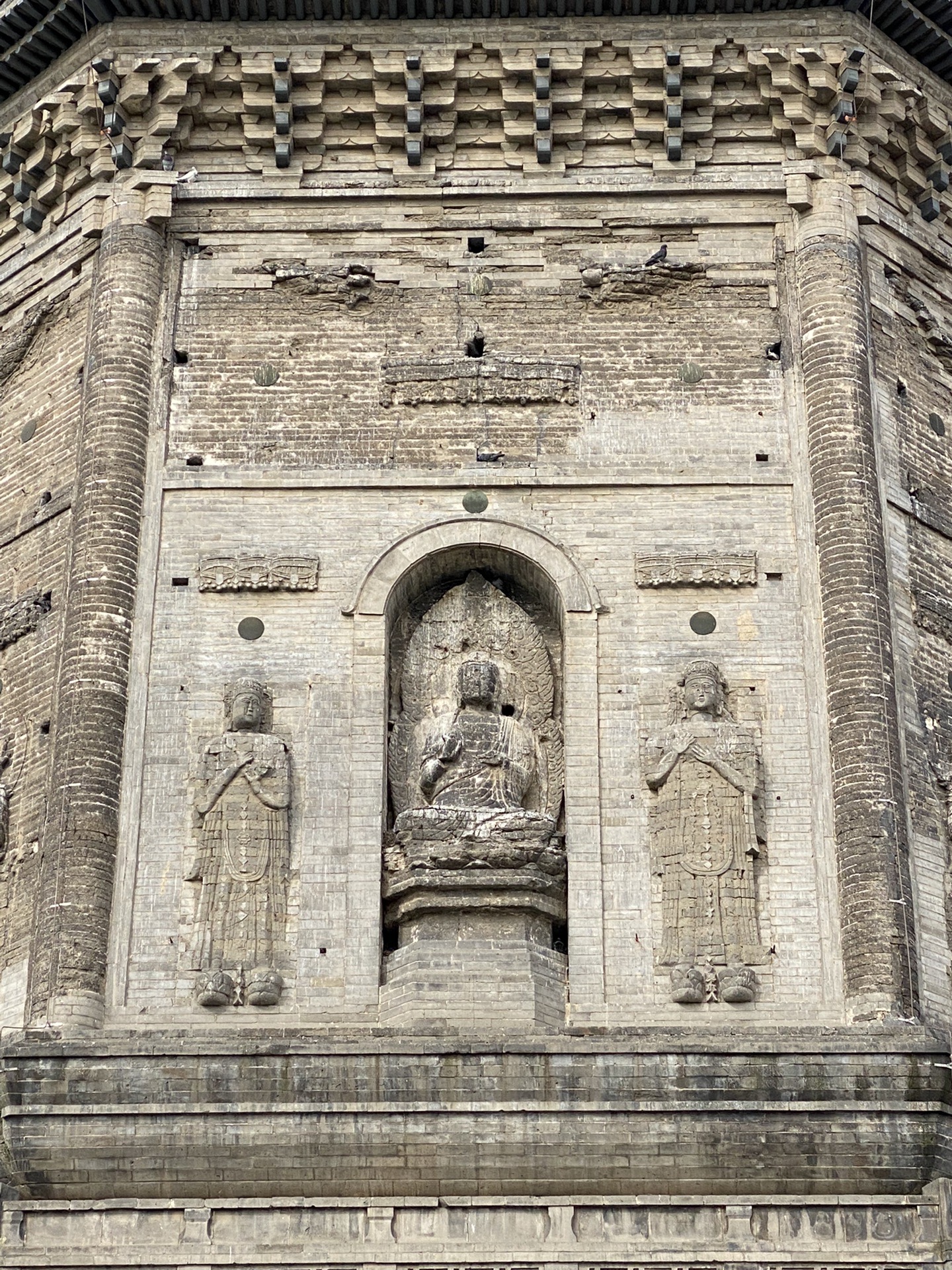 塔身毎个面儿上都是标准的一佛二菩萨雕像,佛结伽趺坐于佛龛之中,头顶未戴宝冠而是螺髻,佛和菩萨头顶均悬宝盖,左右上角为两个砖浮雕飞天,十分精美!