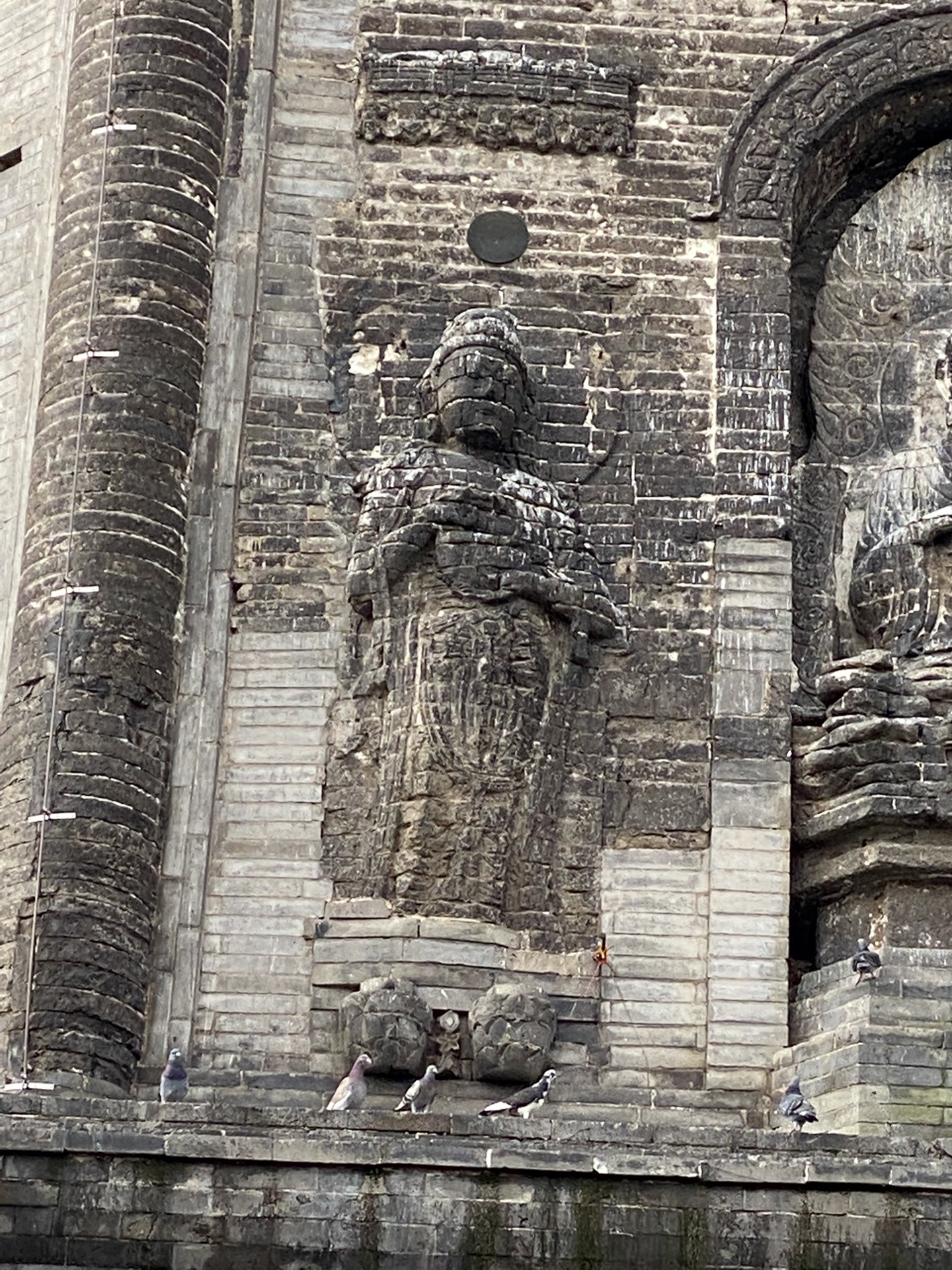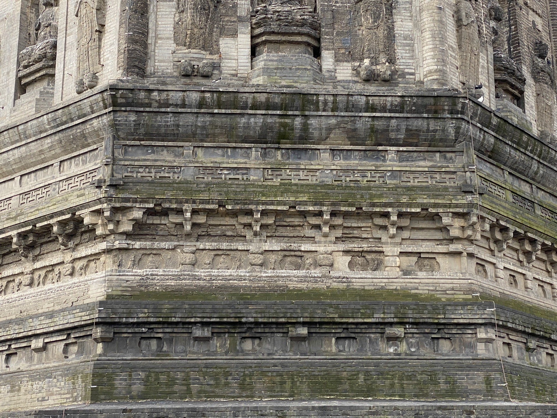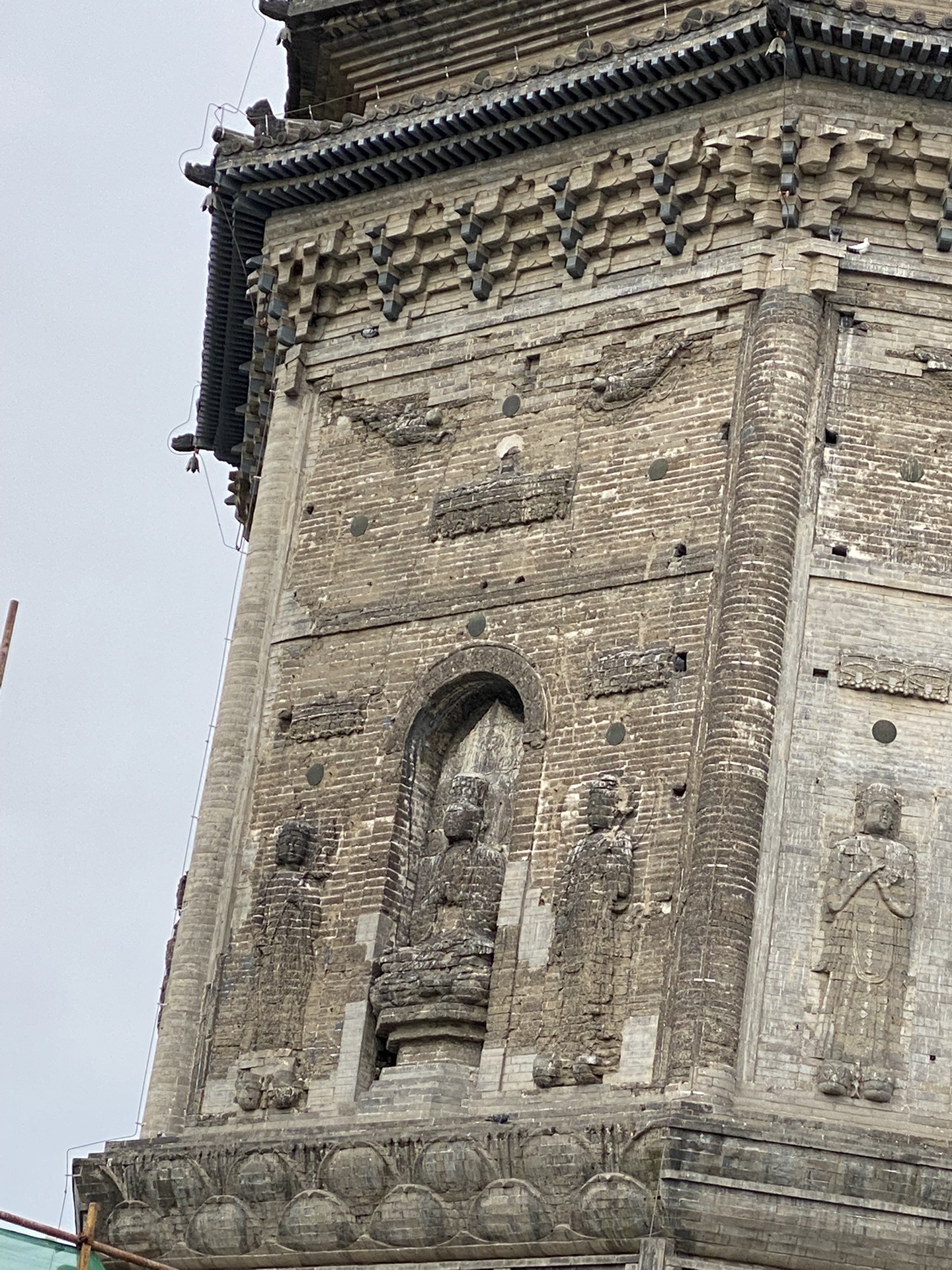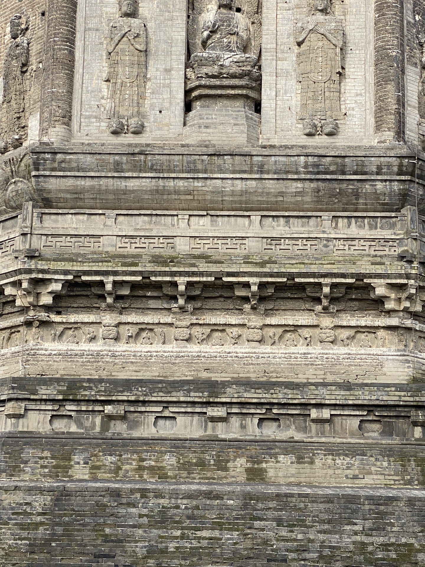 塔身毎个面儿上都是标准的一佛二菩萨雕像,佛结伽趺坐于佛龛之中,头顶未戴宝冠而是螺髻,佛和菩萨头顶均悬宝盖,左右上角为两个砖浮雕飞天,十分精美!