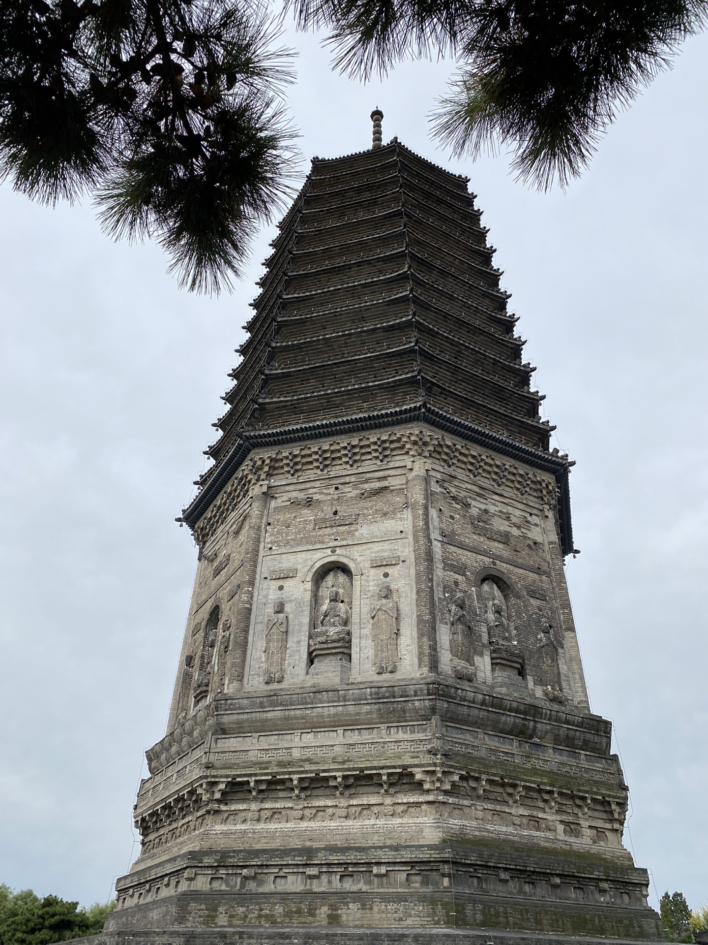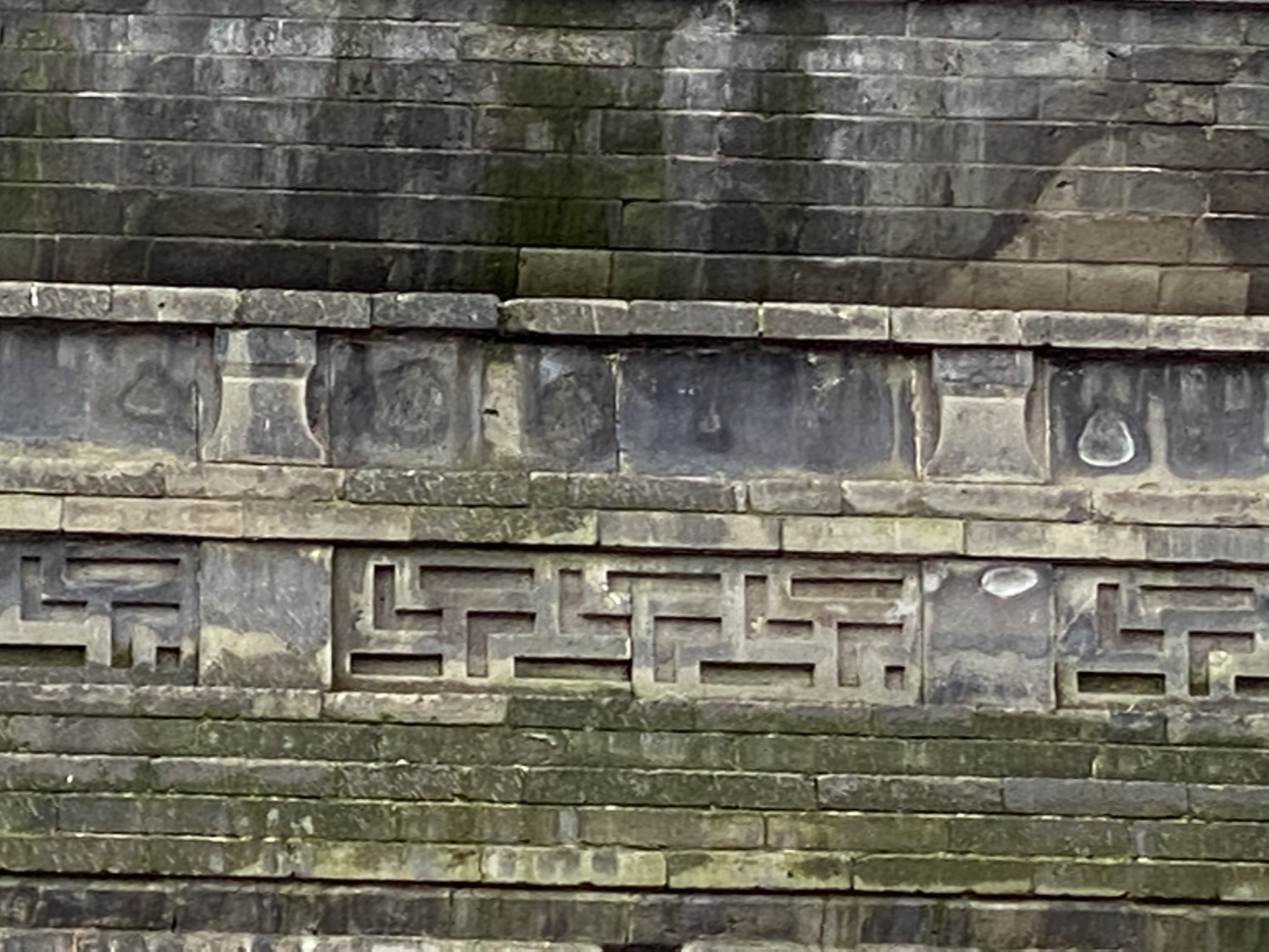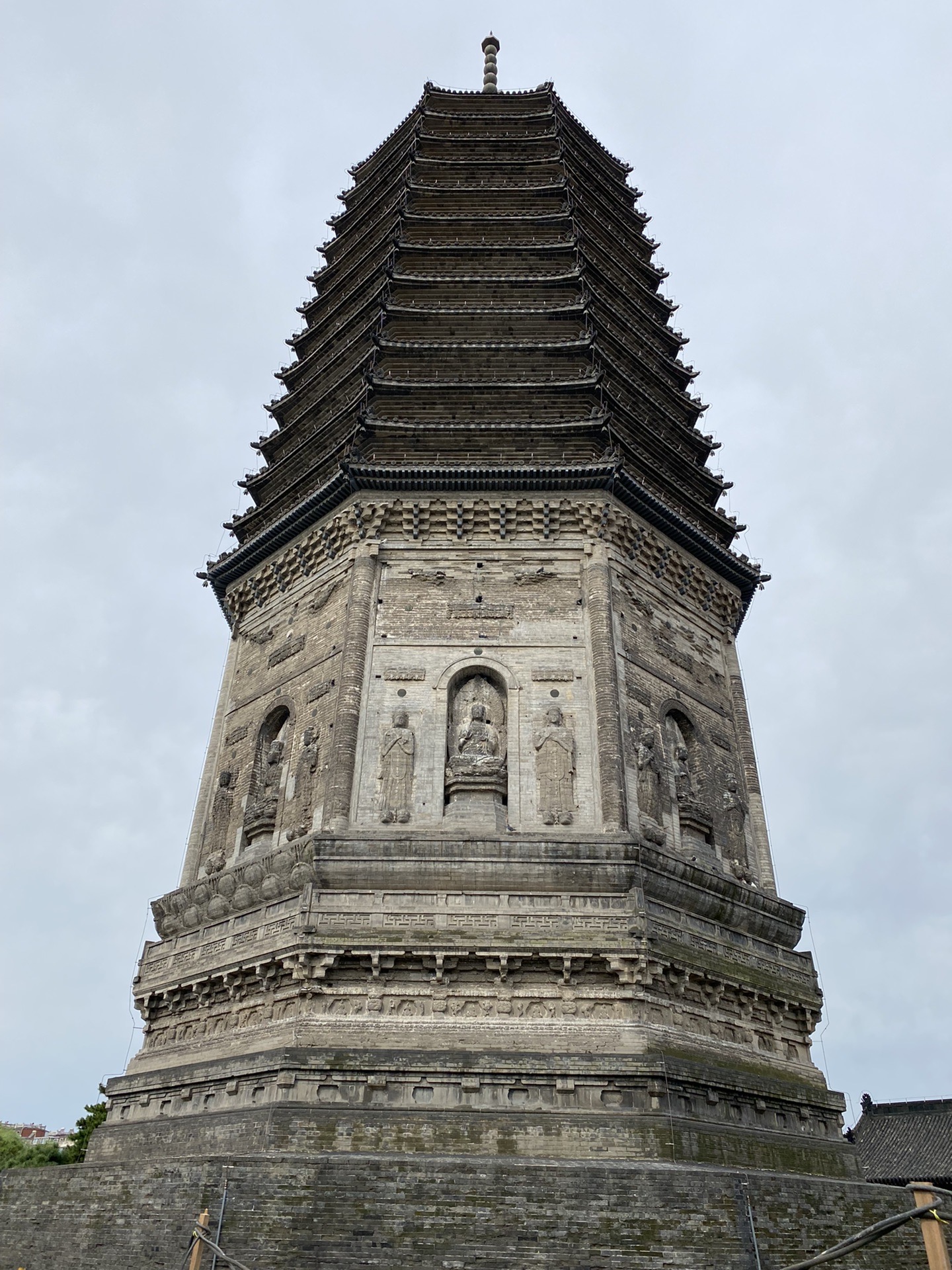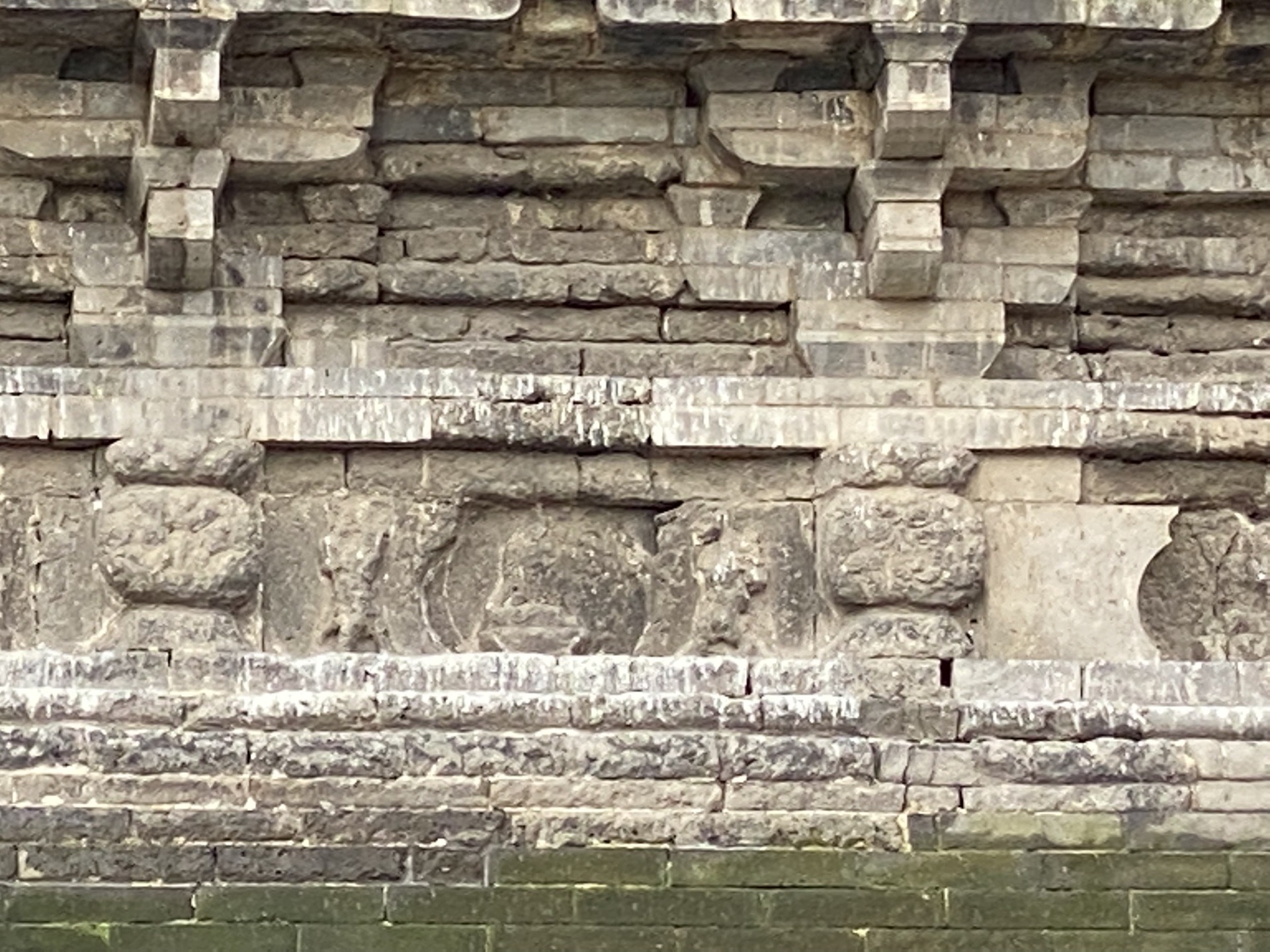 塔身毎个面儿上都是标准的一佛二菩萨雕像,佛结伽趺坐于佛龛之中,头顶未戴宝冠而是螺髻,佛和菩萨头顶均悬宝盖,左右上角为两个砖浮雕飞天,十分精美!