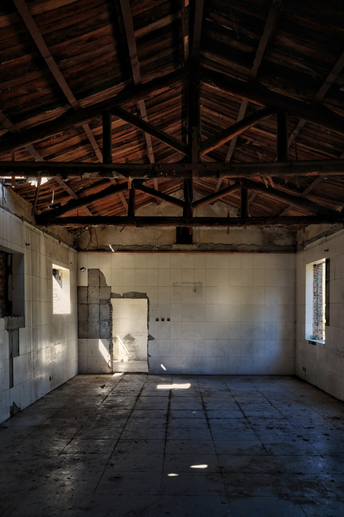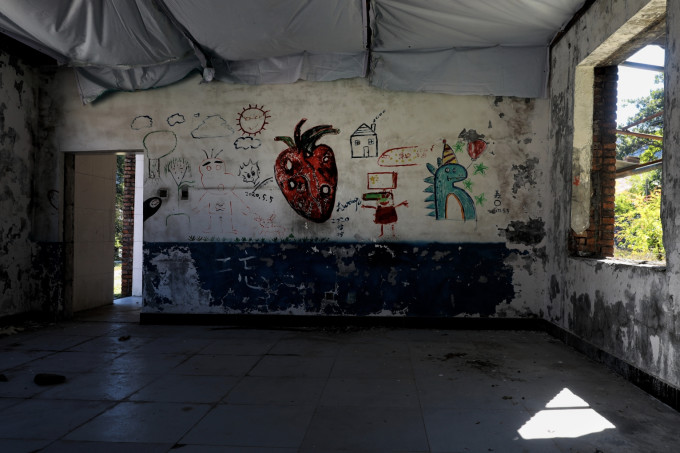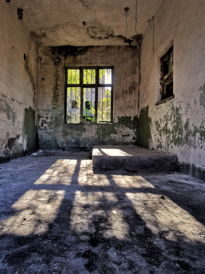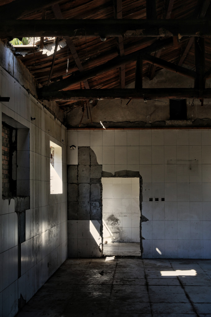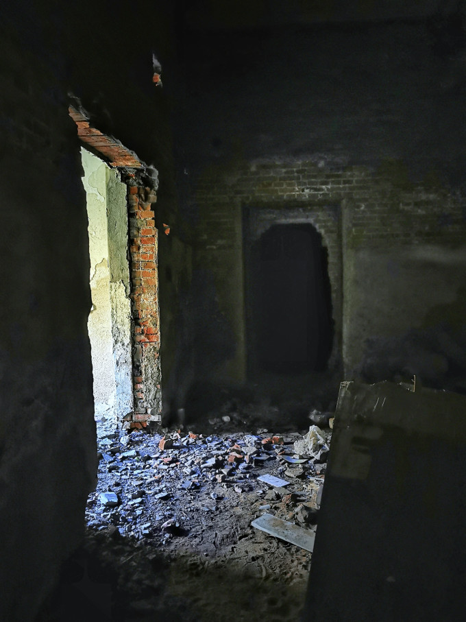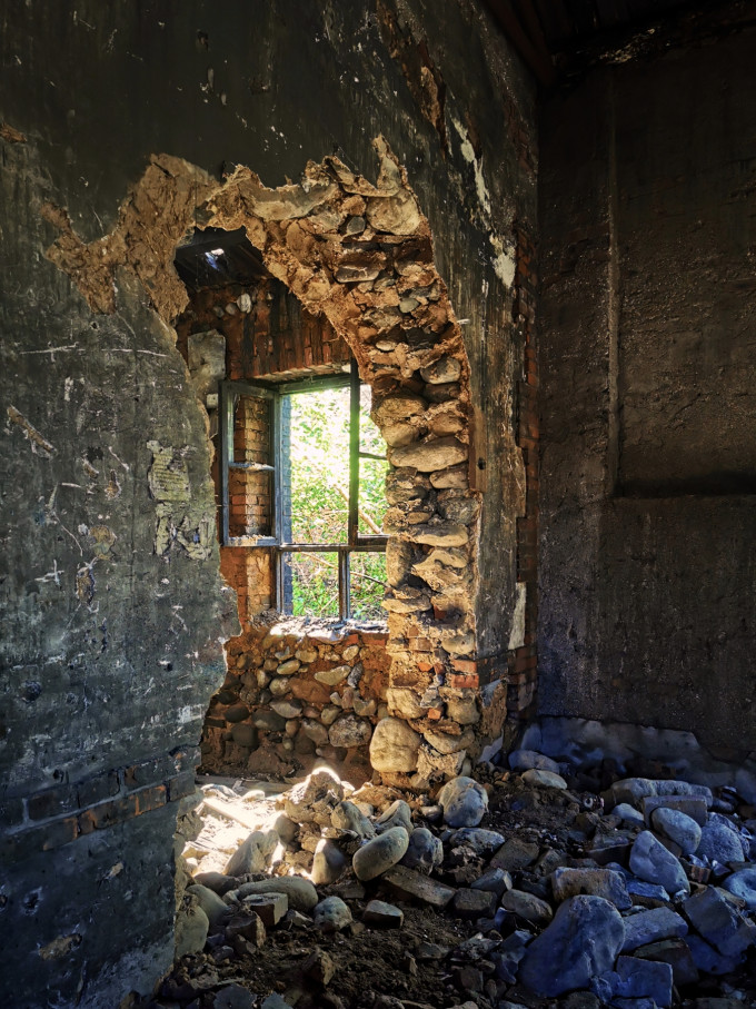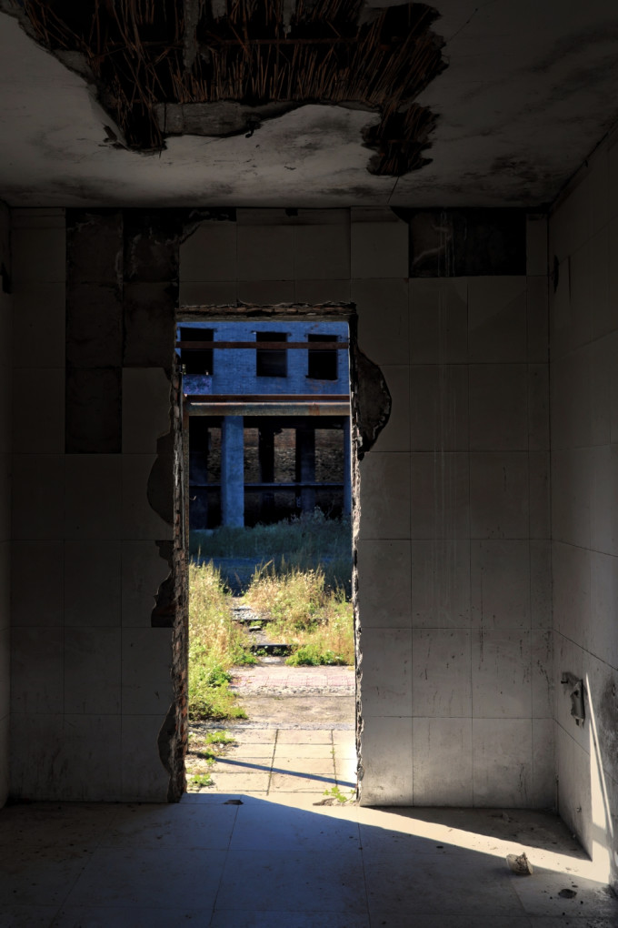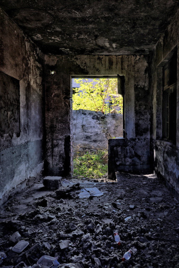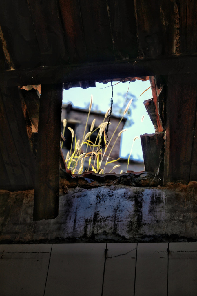 大门两侧平房破败不堪,从窗户望进去满目疮痍荒草: