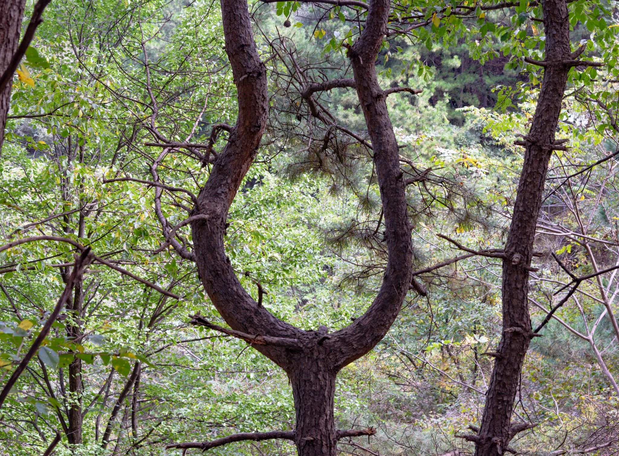 这棵松树长得有意思。朋友童心偶炽想爬上去摆造型拍张照。无奈老胳膊老腿不给力,只好悻悻离开。
